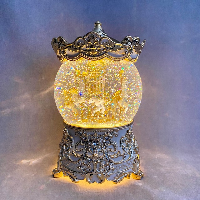 ラグジュアリで華やかなゴールドのカルーセルのLED付きスノードーム。 点灯するとドームの中のカルーセルが回転し、ゴールドのラメが舞い上がります。 点灯し回転している動画をinstagram最終ページに掲載しています。 https://www.instagram.com/p/DQil00LkyBL/?img_index=1 クラシカルなアラベスク柄のデコラティブなベースが高級感のある印象で、1点でも飾るだけで空間が華やかになります。 季節を問わず飾ることが出来るので、プレゼントにもおすすめです。 ※音楽付きではありません。 ※単3電池x3本使用(電池付属無し。配線の穴がありますが使用できません。) ※中を回すためにモーターを使用しております。モーター音が鳴ることを予めご了承下さい。 ※モーターの回転速度には個体差があります。 ※電池が消耗すると、最初に回転が止まります。新しい電池に取り替えてお楽しみください。 ※ラメが沈殿して中が回りにくくなることがございます。回らない場合は上下に振ってください。 ※ドーム内には多少の気泡が入ります。不良ではありませんので、予めご了承ください。 ¥11,000+tax ◾️サイズ:直径13cm×高さ21cm ◾️材質 :ポリレジン、ガラス ◾️単3電池3本使用(電池付属無し) ※アンティーク調仕上げの為、歪み・擦れ・色ムラがある場合があります。 ※掲載写真はお使いのモニター等により実際の商品と色味が異なって見える場合があります。 ※撮影商品は見本ですので、お届けするものと色合い等が多少異なる場合があります。 ※撮影小物は商品に含まれません。 ※実店舗や他サイトでも同時に販売しておりますので、常時在庫は変動しております。タイミングによっては完売している場合もございますので、予めご了承くださいませ。 【発送方法】 佐川急便orゆうパック ※曜日や時間指定のご希望がございましたら、ご注文時に備考欄よりお知らせください。