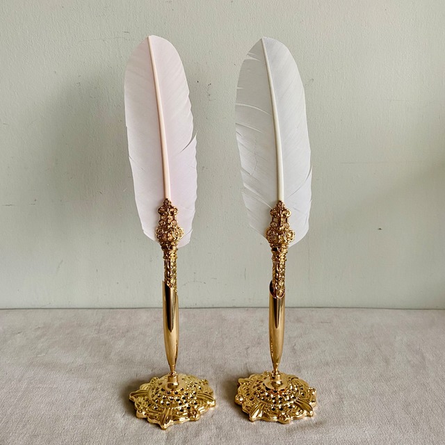 ダチョウの羽根を使ったおしゃれなフェザーボールペン。 クラシカルなデザインのピンクゴールドのペン先を合わせた高級感のある羽根ペンです。 お揃いのペンスタンドと合わせて飾っておくと素敵です。 ギフト用のボックスに収納され、レフィルが1本付属しているので、ギフトにも喜ばれます。 ブライダル受付や、サロン等店舗の来客用の筆記具としてもおすすめです。 カラーは羽根部分が淡いピンクと淡いグレーの2色展開です。 ※天然素材のため、色味、形、サイズには個体差が生じます。また羽根の寄れが生じます。予めご了承ください。 ペン&ホルダーセット ¥2,600+tax ◾️サイズ:羽根ペン/全長26cm、スタンド/直径7cm×高さ9.5cm、ホルダー部分直径1cm ◾️材質 :羽根(ダチョウ)、鉄 ◾️カラー(羽根部分):ピンク、グレー ※レフィル1本付属。 ※天然素材のため、色味、形、サイズには個体差が生じます。また羽根の寄れが生じます。 ※掲載写真はお使いのモニター等により実際の商品と色味が異なって見える場合があります。 ※撮影商品は見本ですので、お届けするものと色合い等が多少異なる場合があります。 ※撮影小物は商品に含まれません。 ※実店舗や他サイトでも同時に販売しておりますので、常時在庫は変動しております。タイミングによっては完売している場合もございますので、予めご了承くださいませ。 【発送方法】 佐川急便orゆうパック