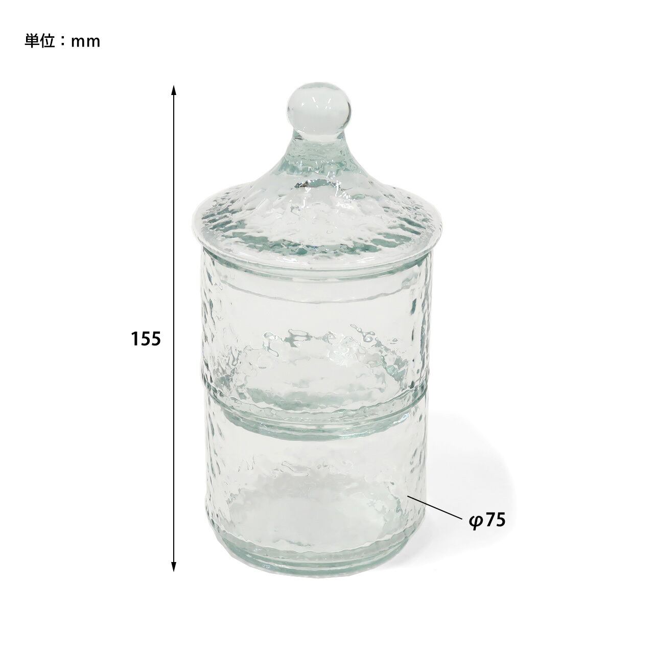 ガラスのゆらぎが美しい凹凸のあるテクスチャー入りガラスキャニスターの2段タイプ。