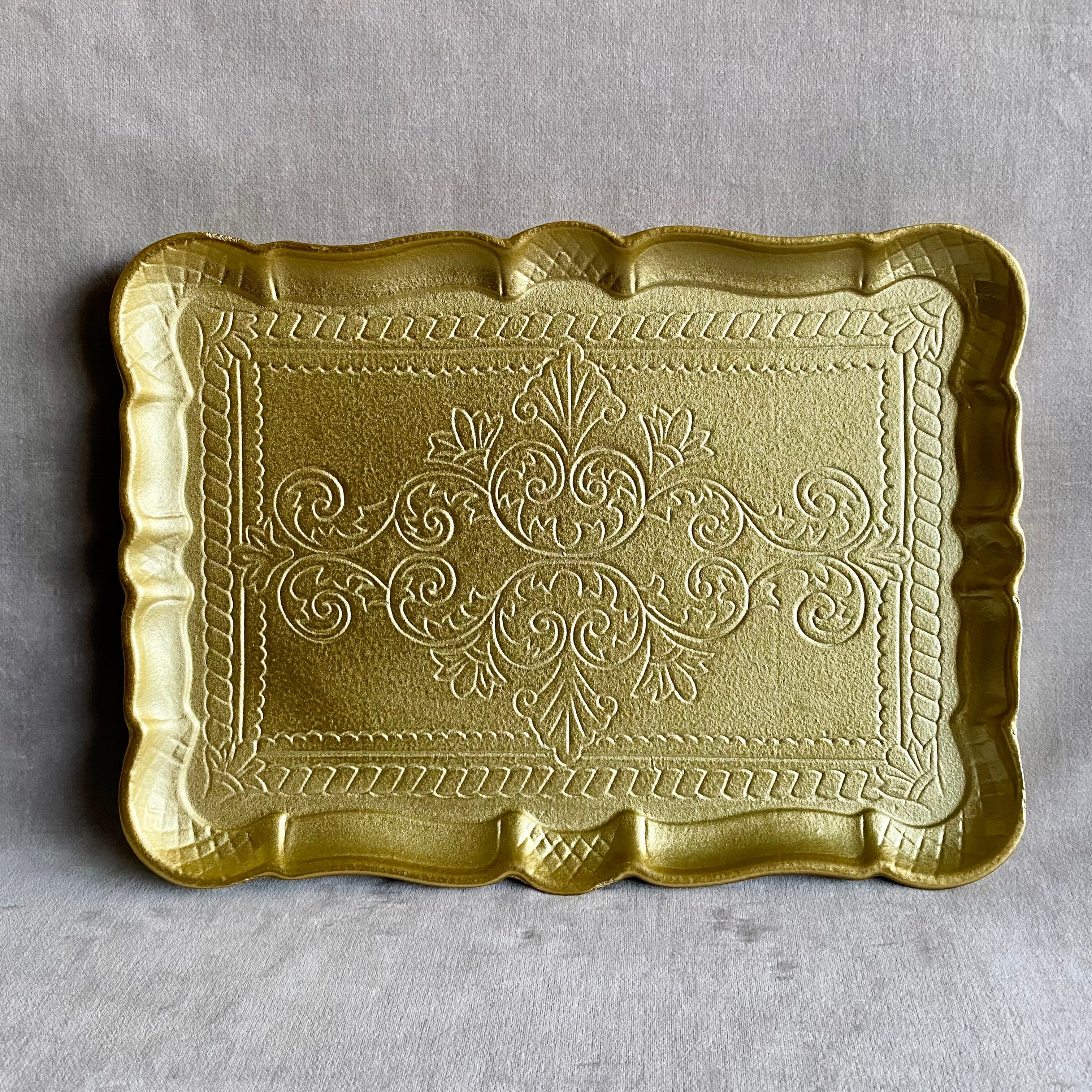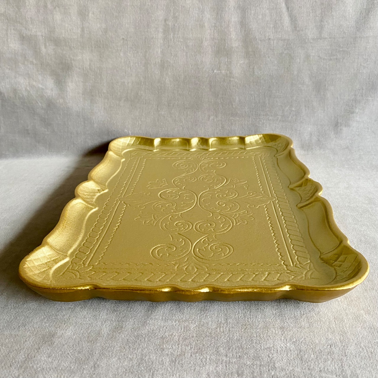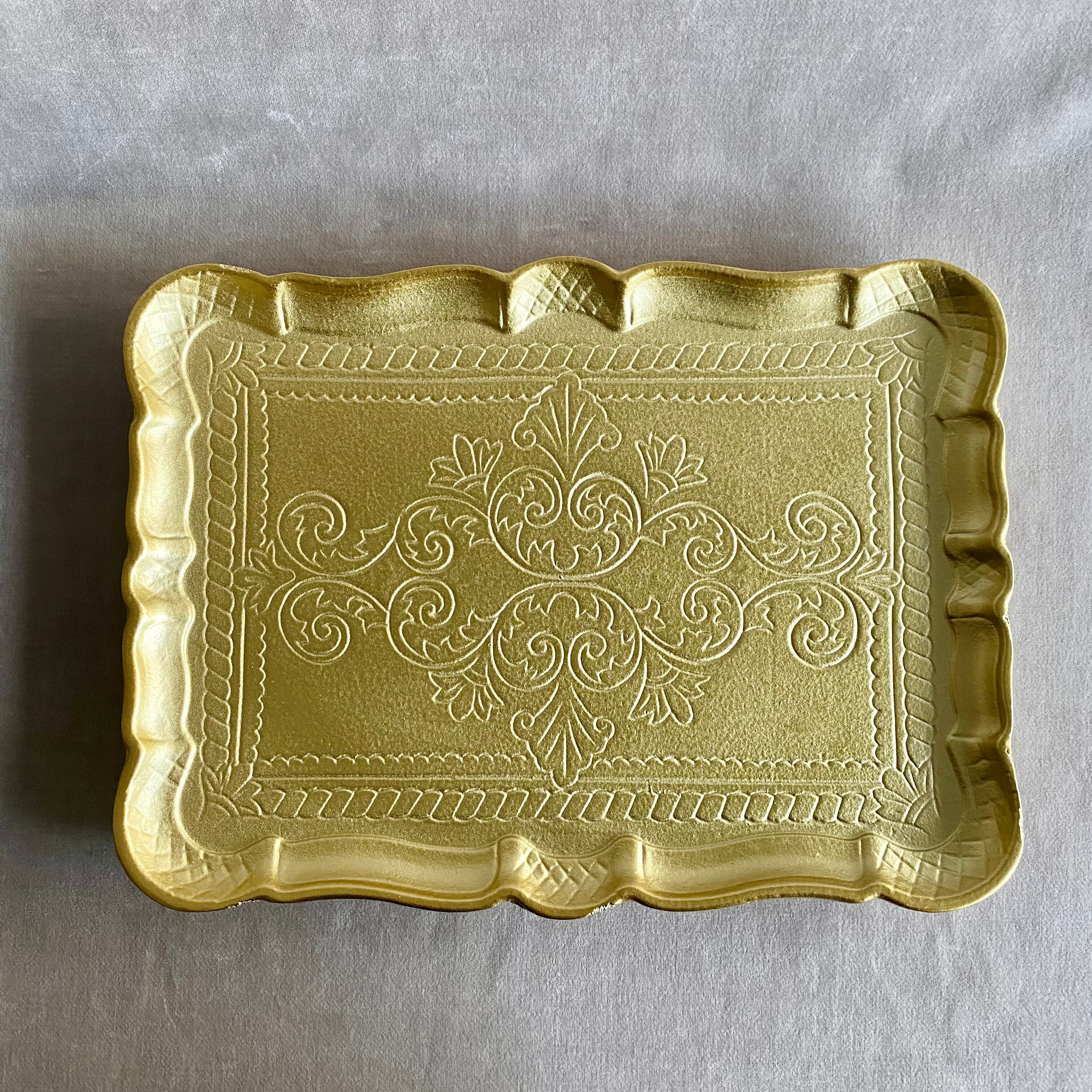 クラシカルなアラベスク模様が描かれた、お洒落なフォルムのアンティーク調トレイ。