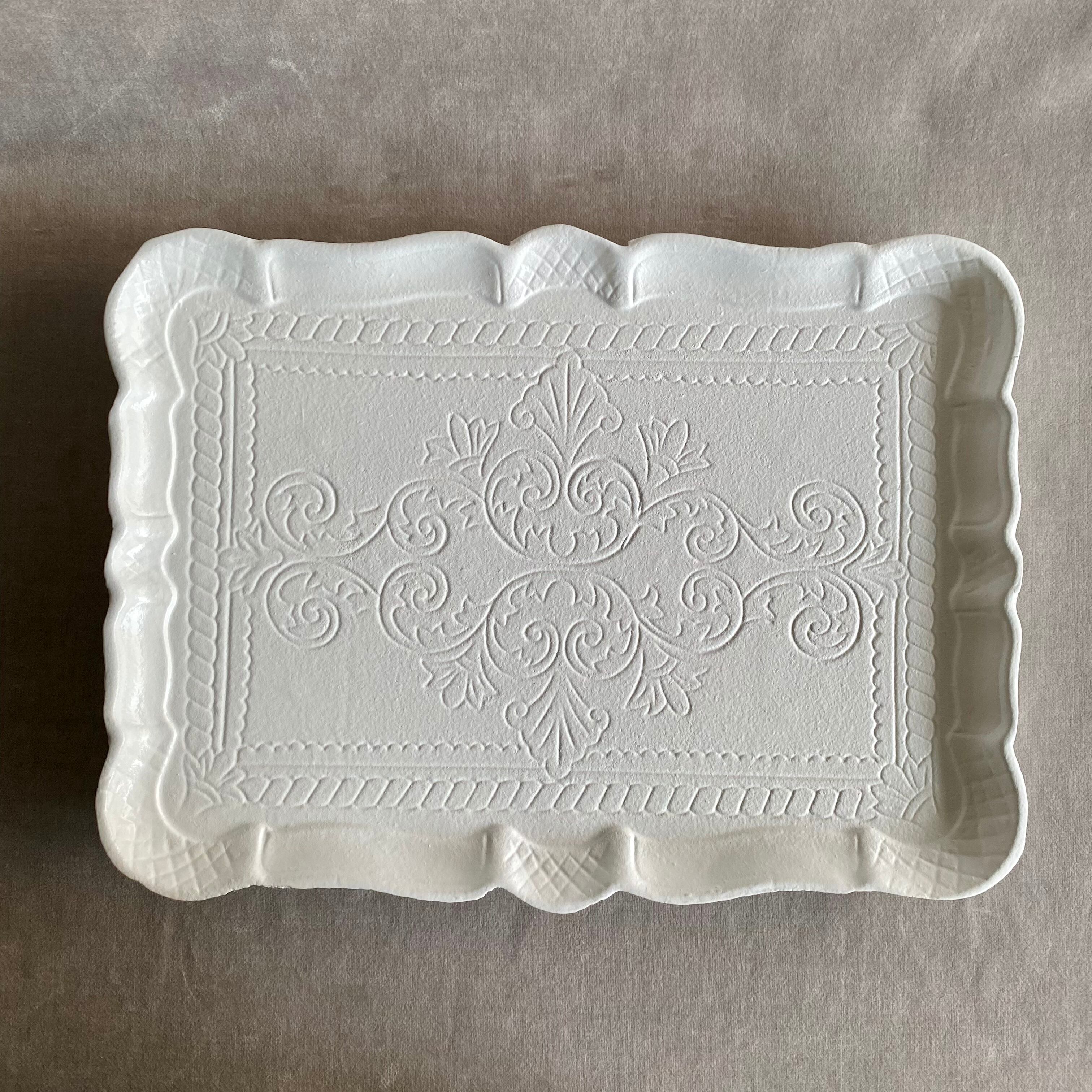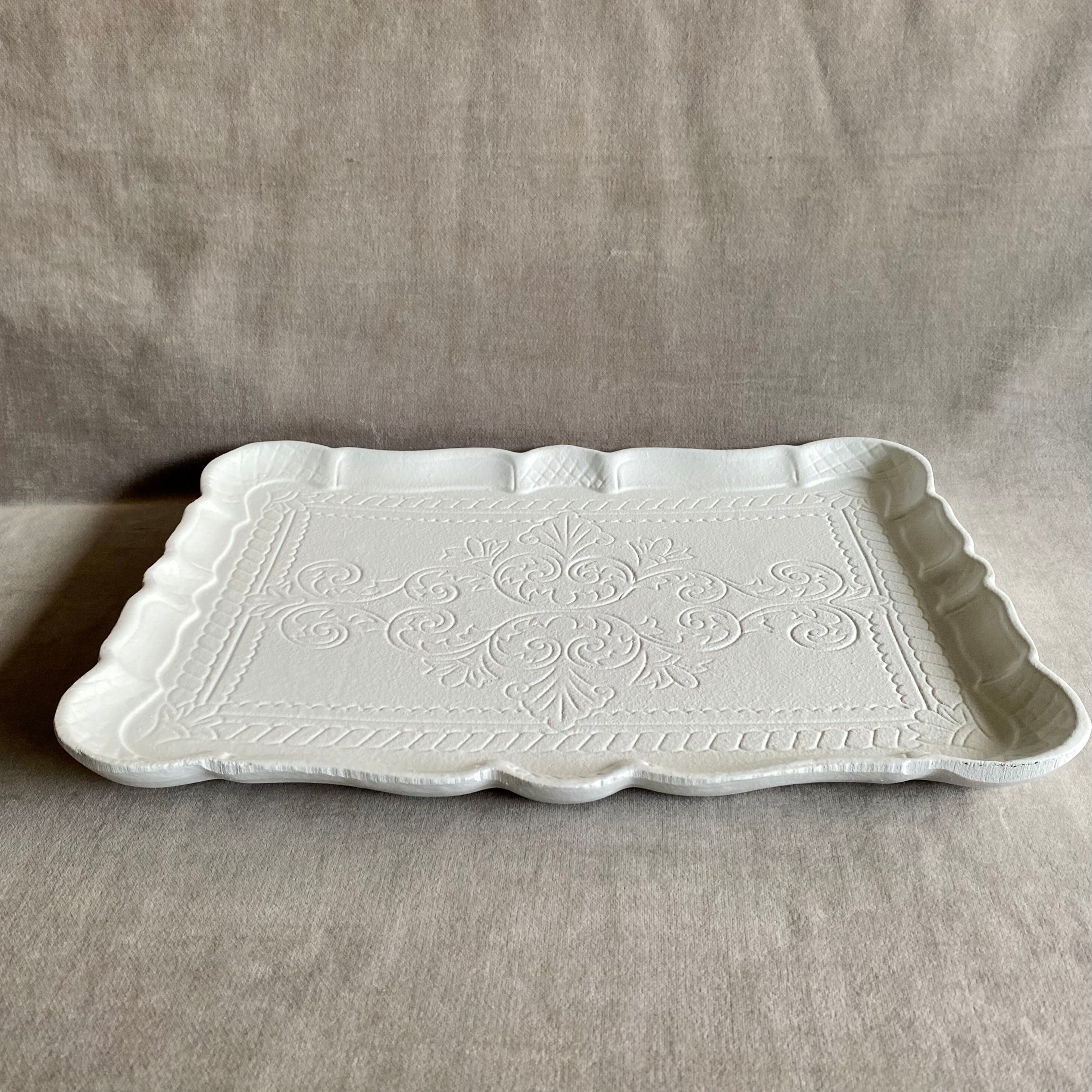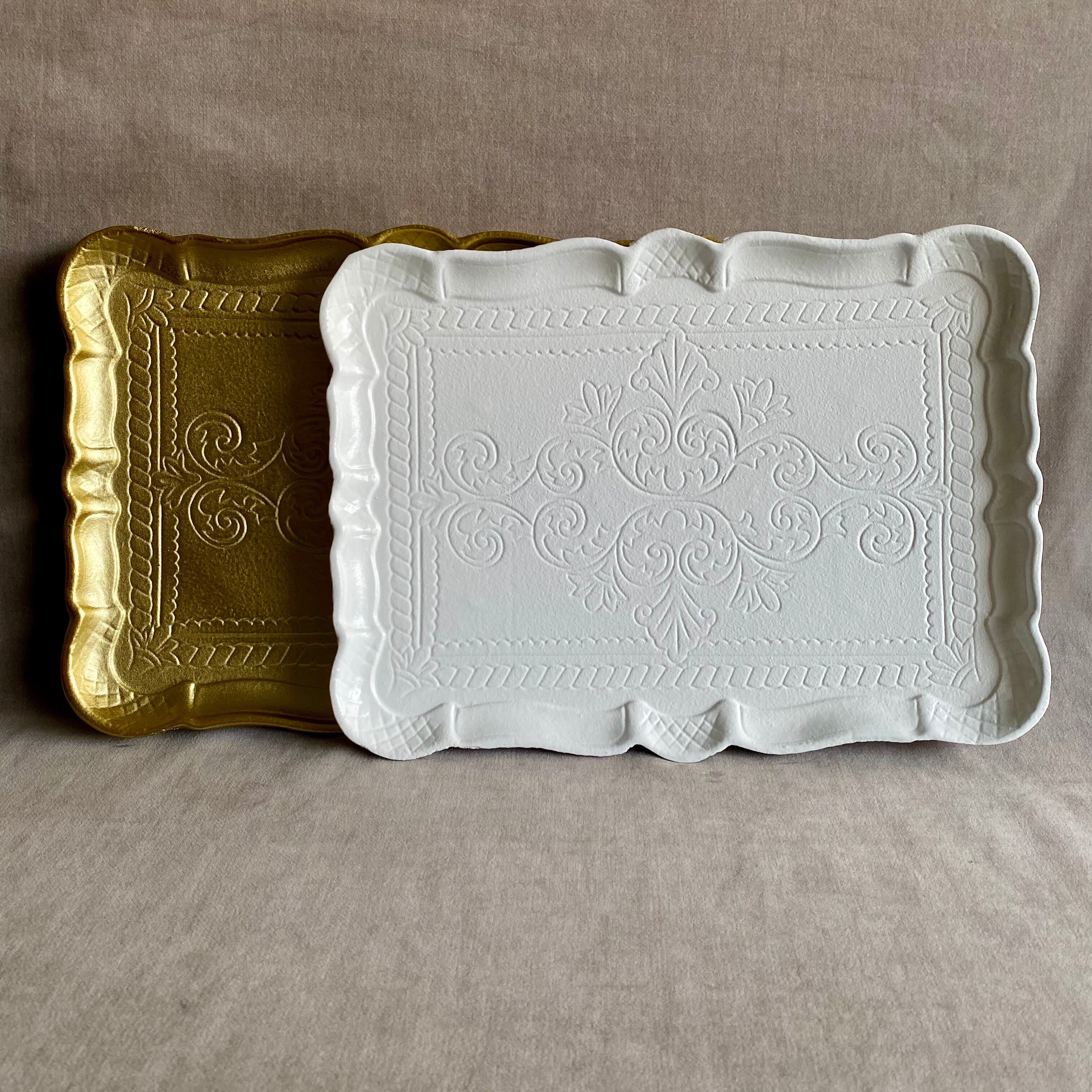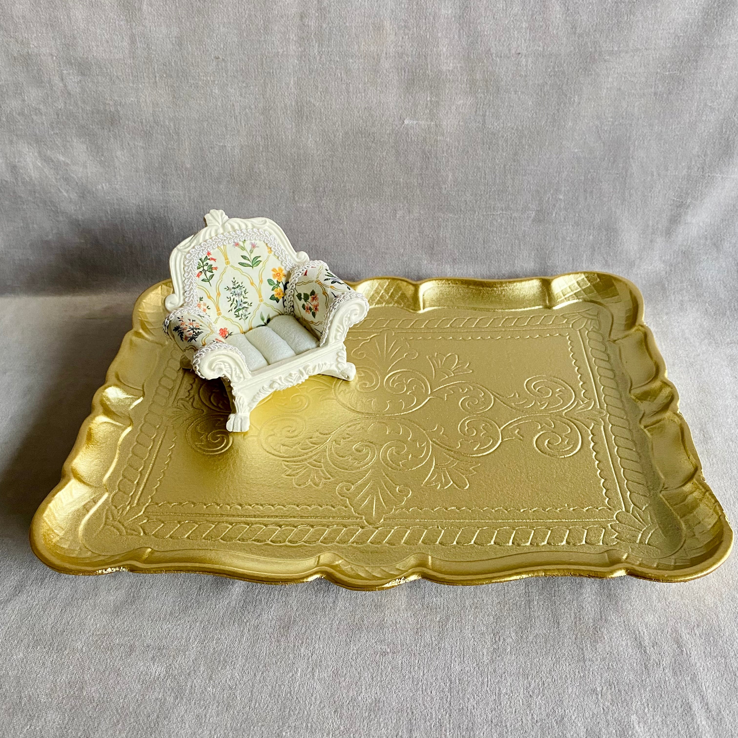 クラシカルなアラベスク模様が描かれた、お洒落なフォルムのアンティーク調トレイ。