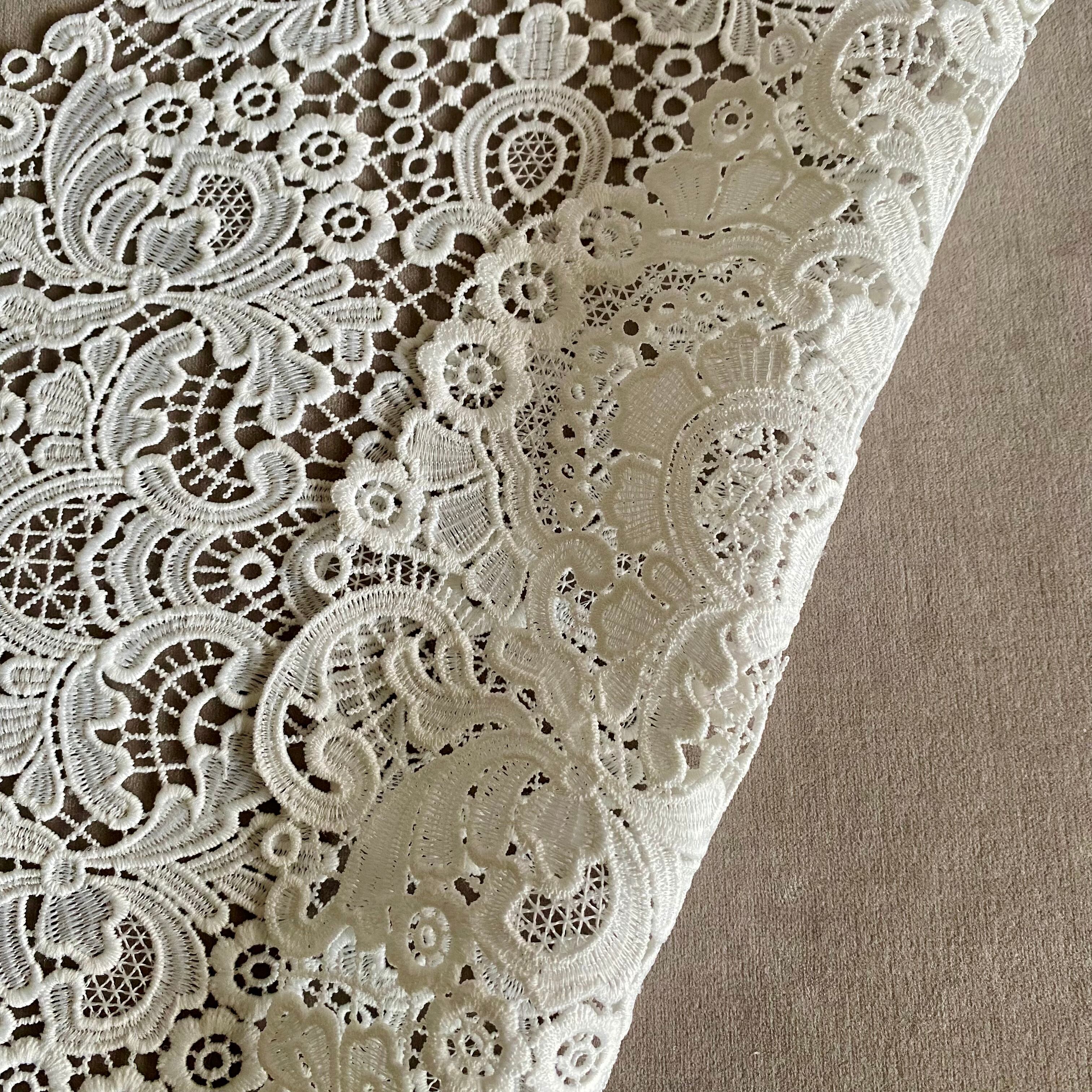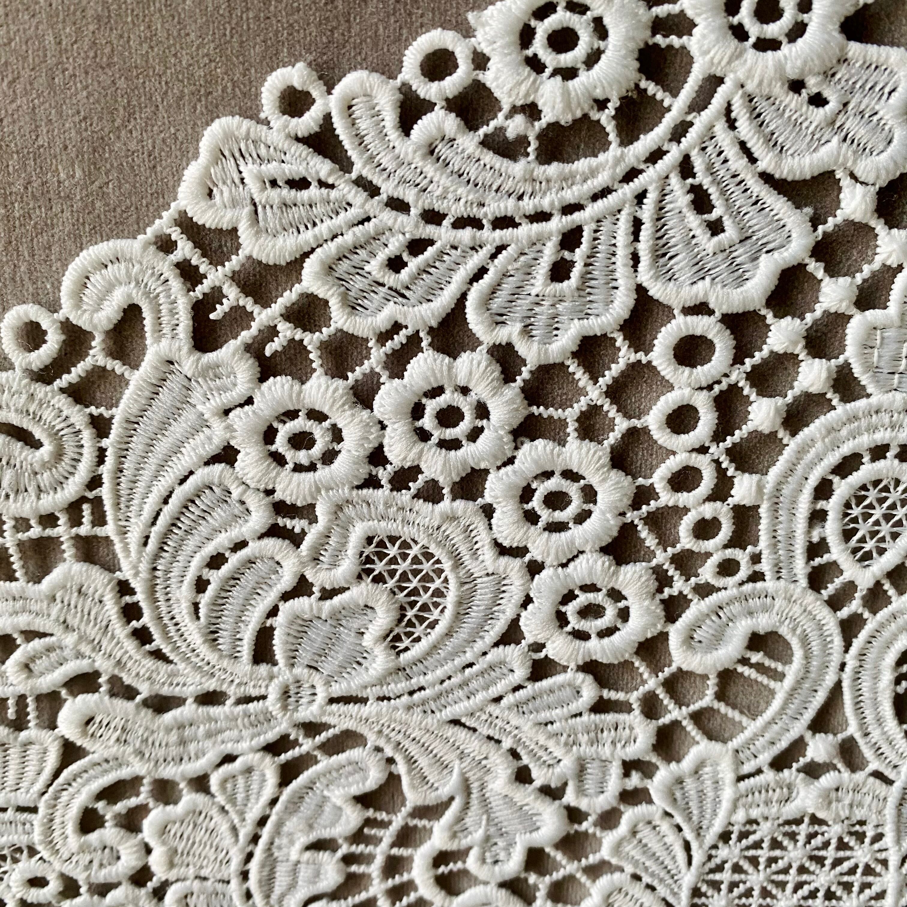 ギュピールレースとは、刺繍の技術を応用した機械レースの一種で、透かし模様や立体感のあるレリーフ状の模様が特徴です。