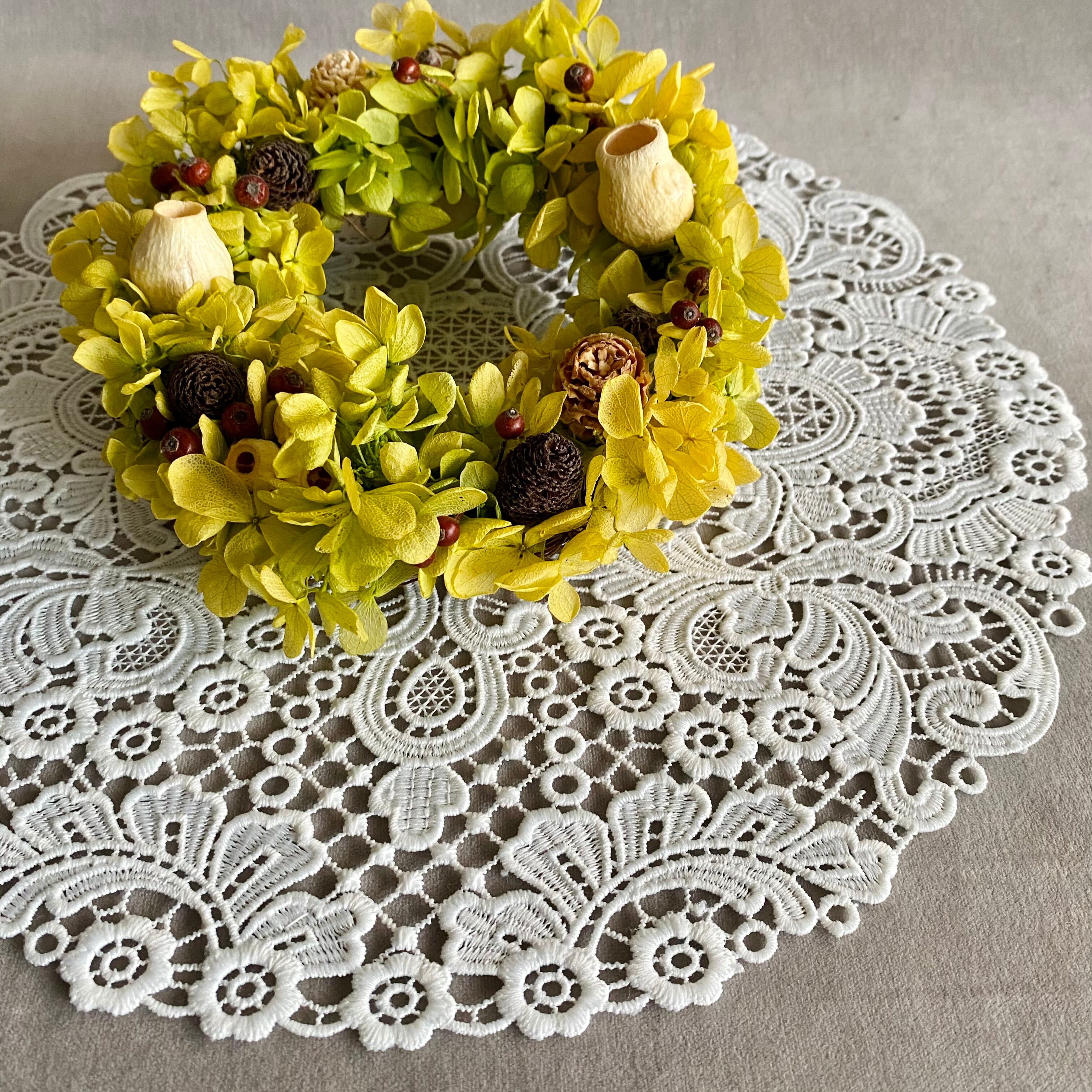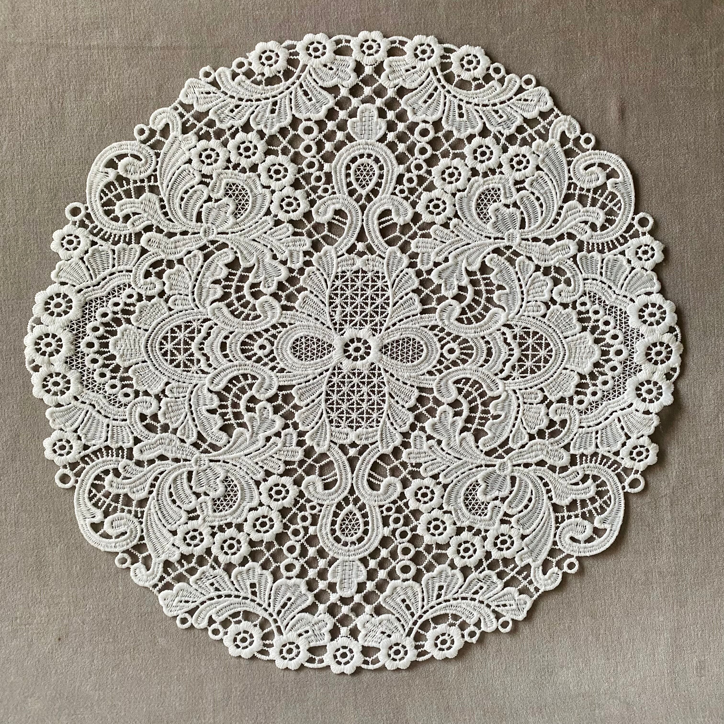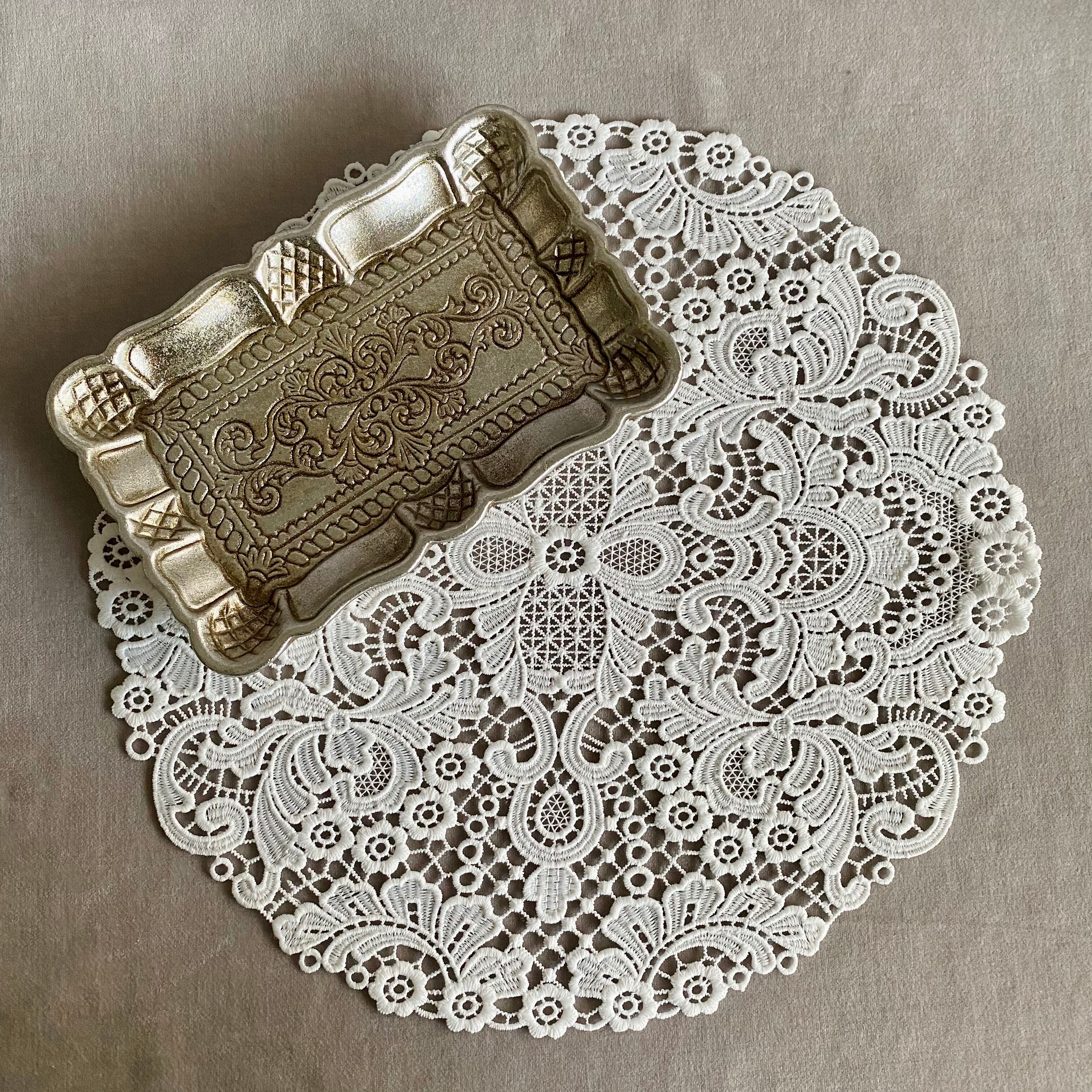 ドイリーとは、卓上用や小物置きとして使われる、レースや刺繍で装飾された小さな敷物のことです。もともとは、フィンガーボールやデザートなどの下に敷くために使われていましたが、現在では花瓶敷きやインテリアのアクセントとして、様々な素材や形で使われています。