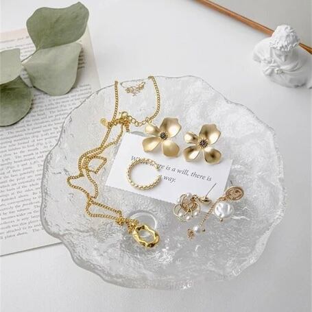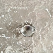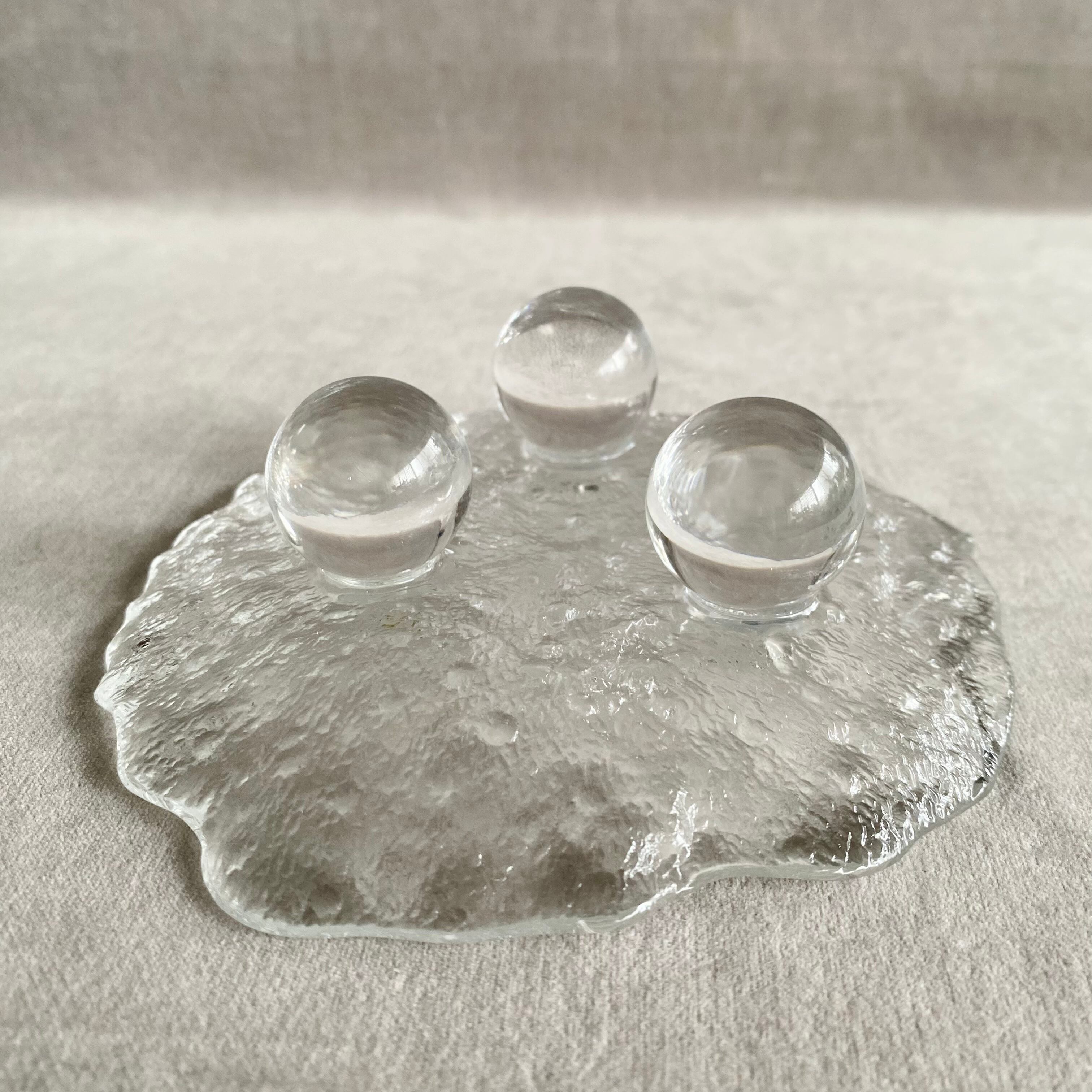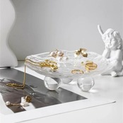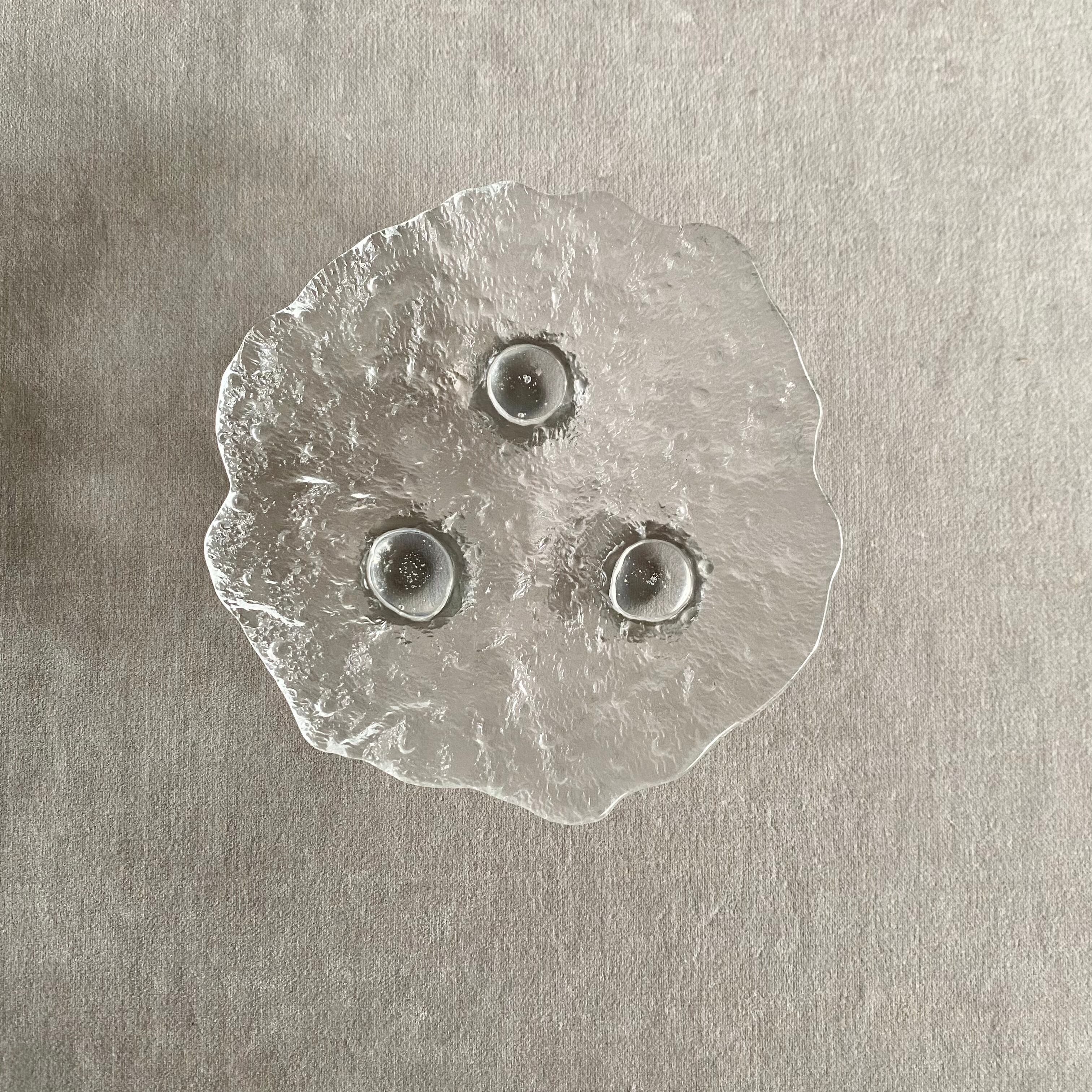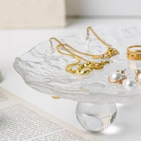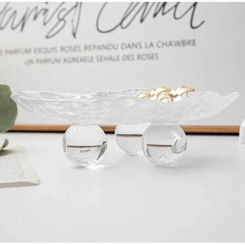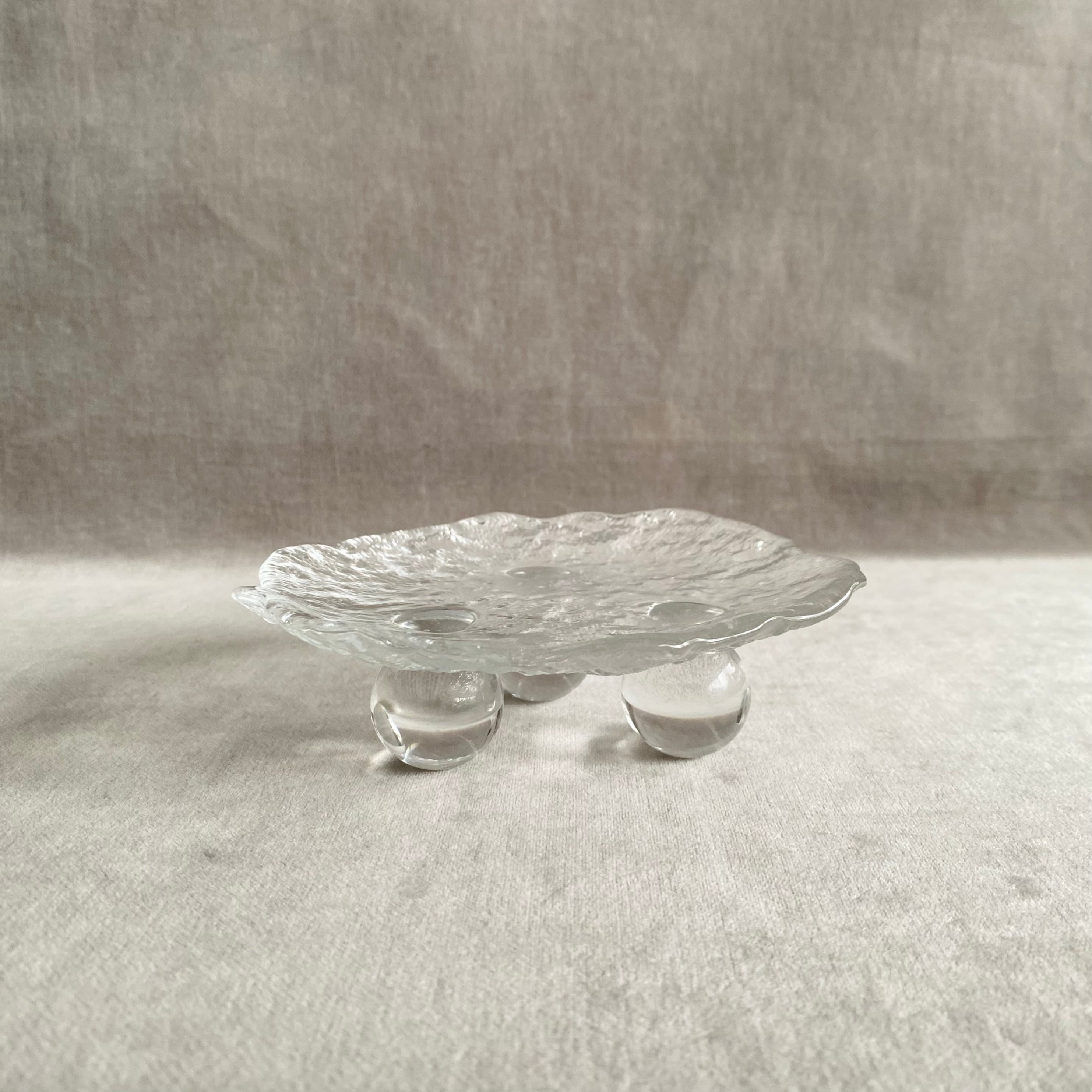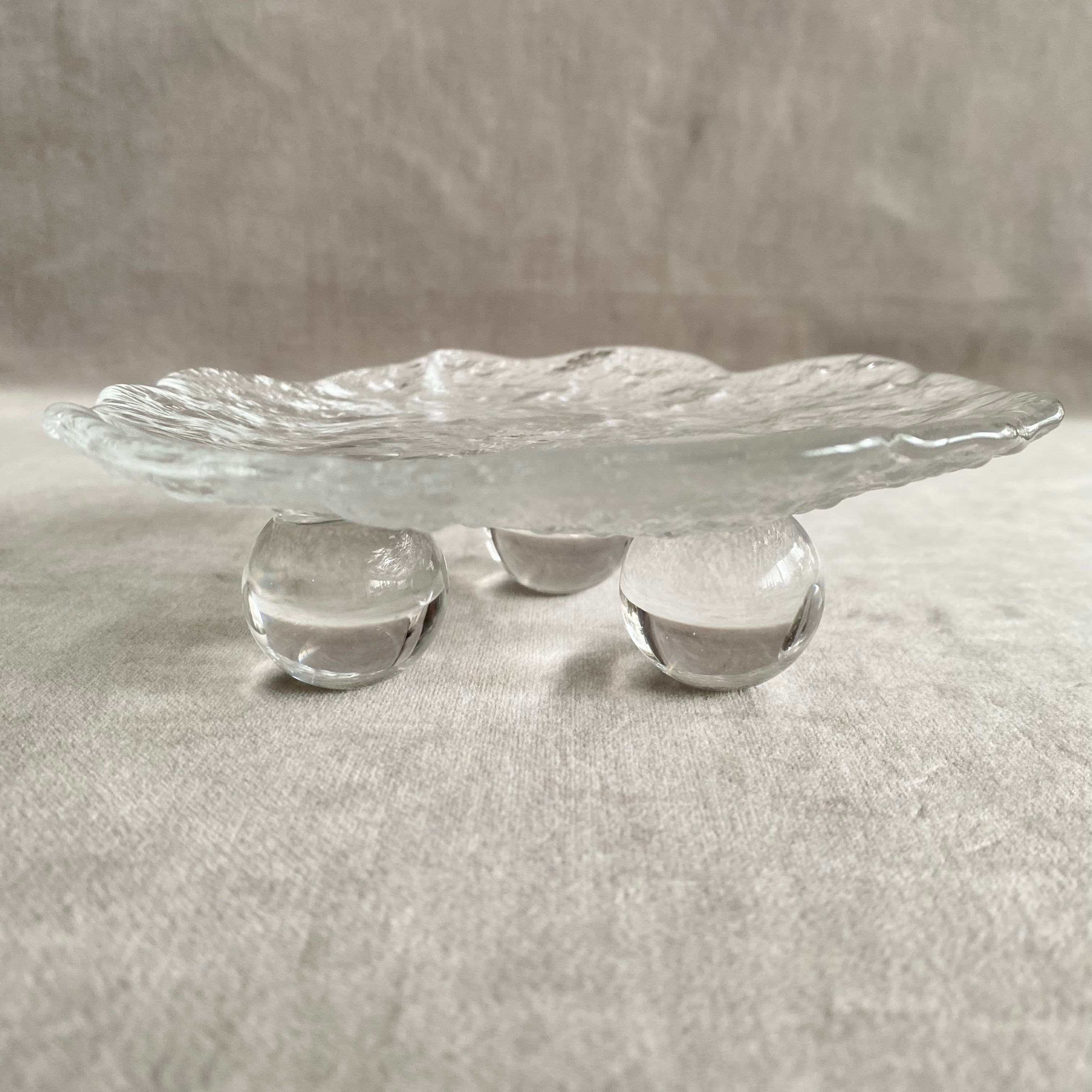 氷のようなガラスに丸い脚付きの高級感あるトレイ。