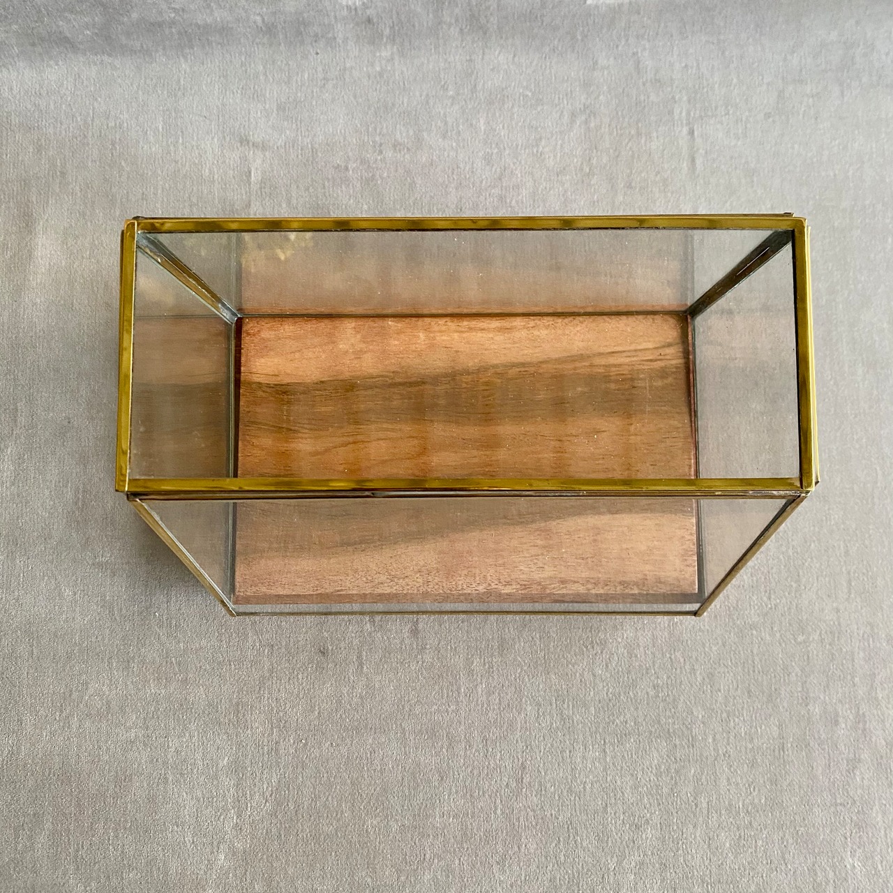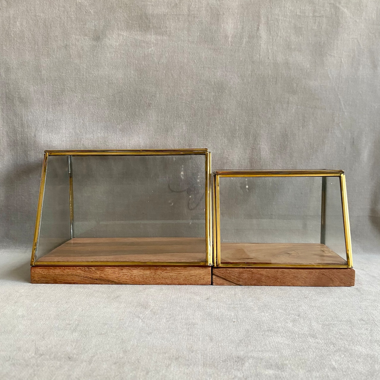 真鍮の枠とアカシアの台座が味わい深いガラスのショーケース。