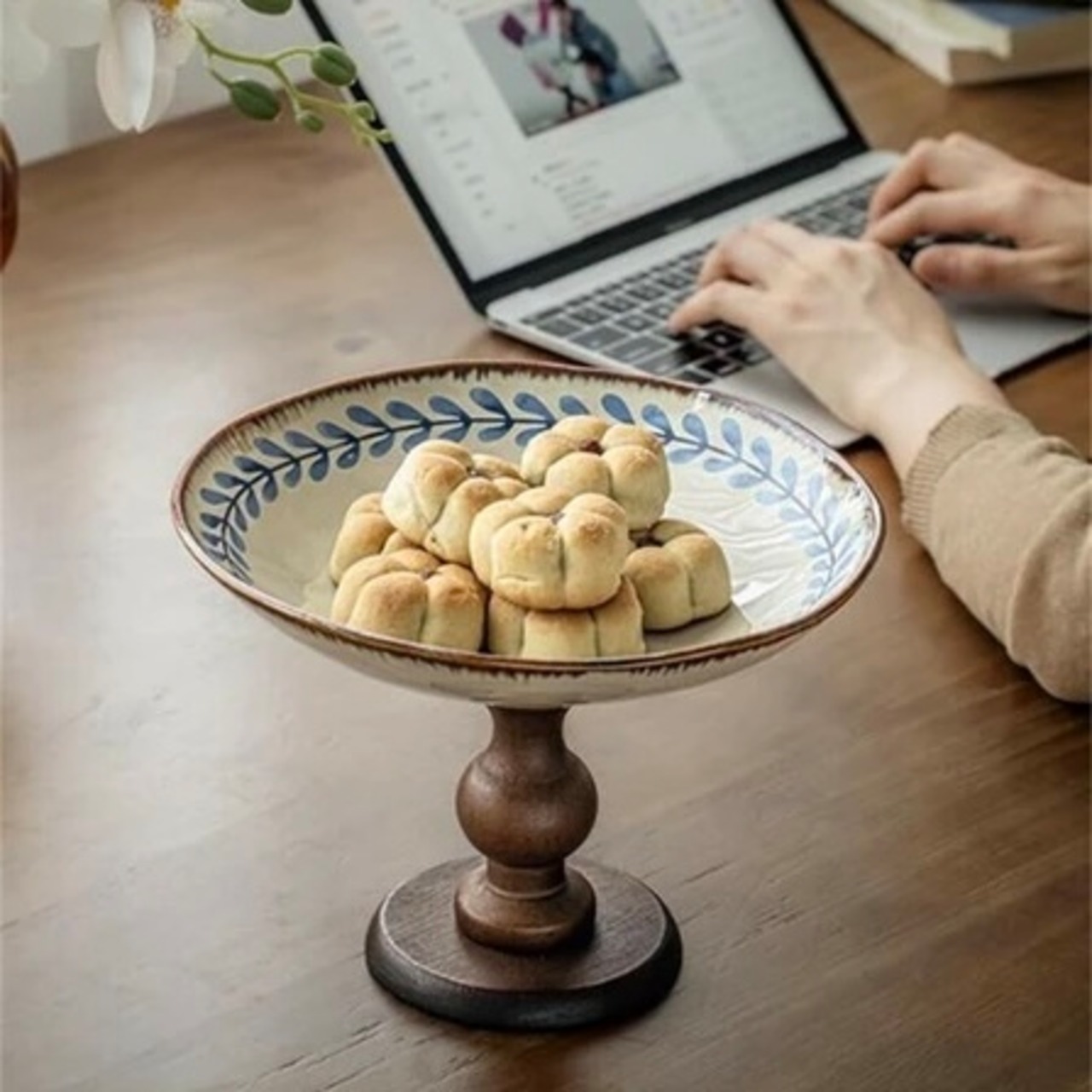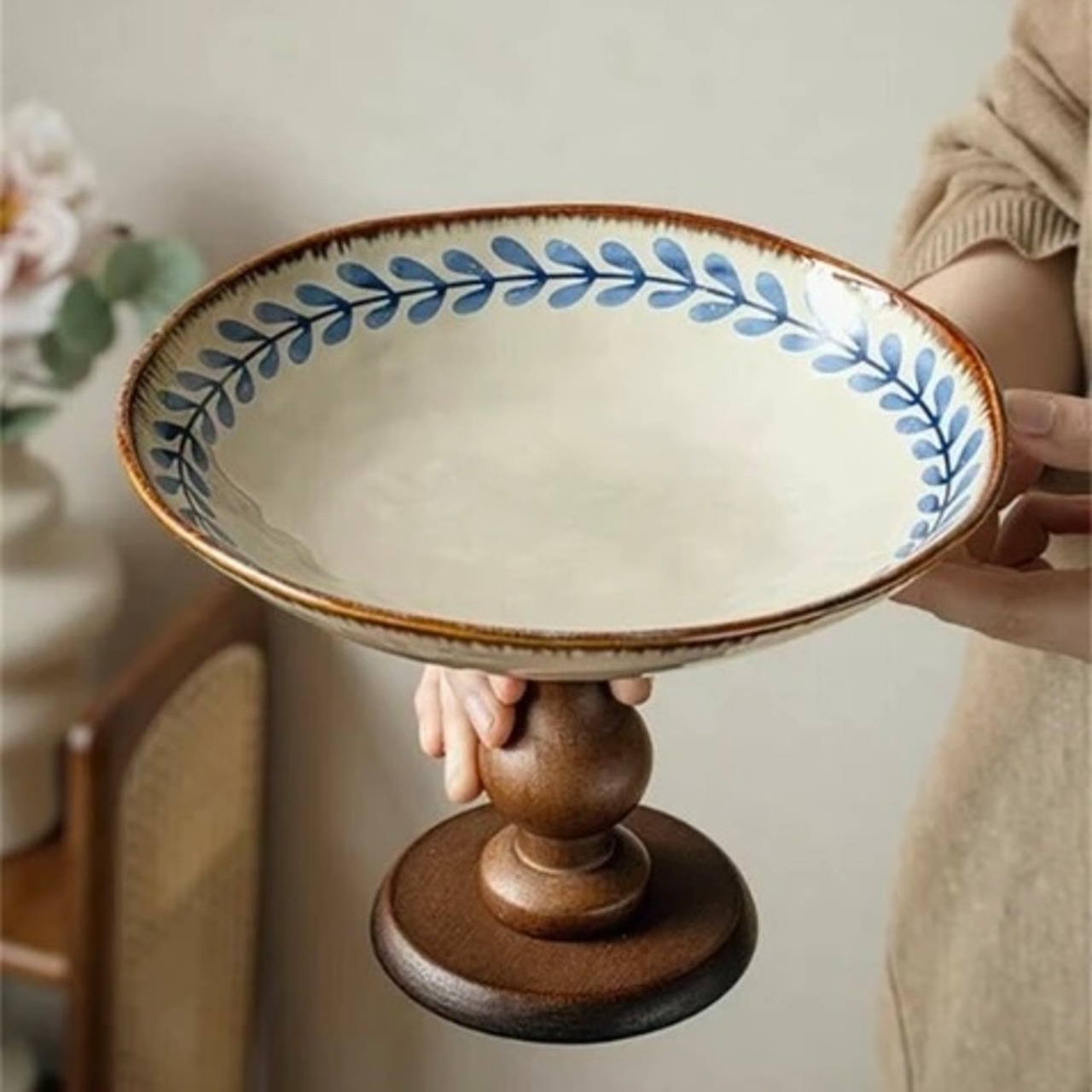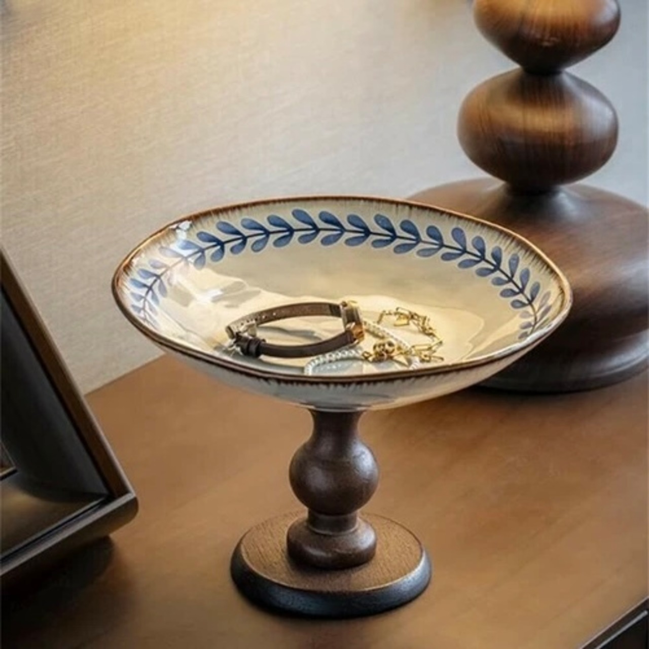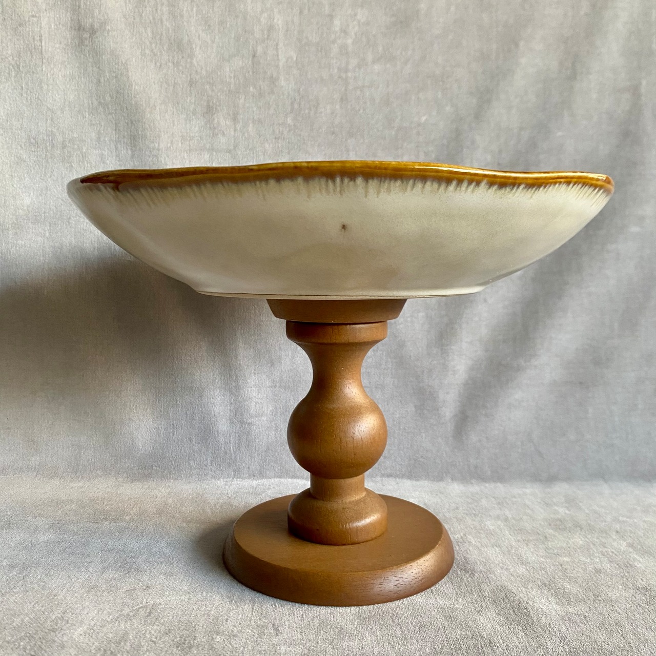 アンティーク調の木製高脚セラミックトレイ。