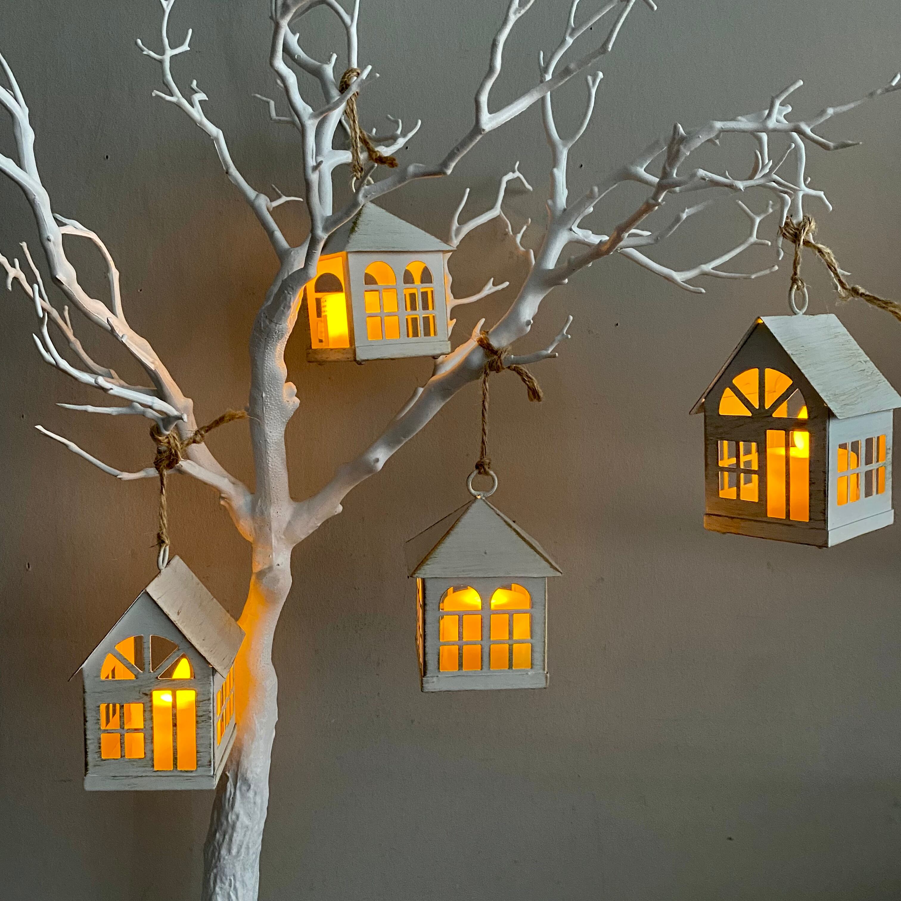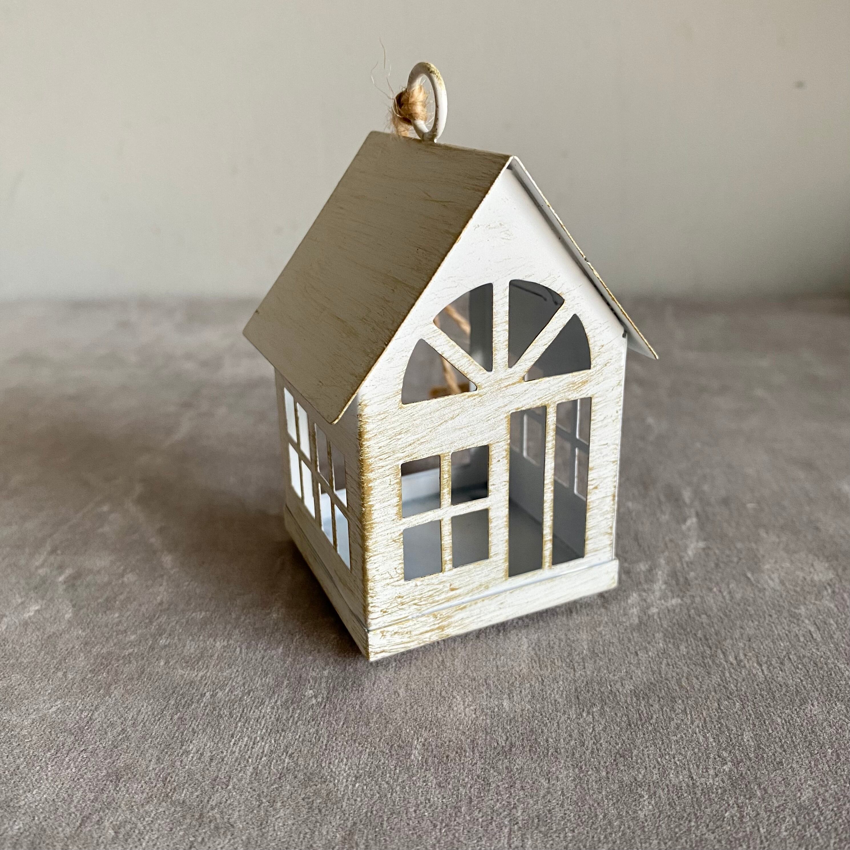 白地にゴールドブラッシュをかけたシャビーな雰囲気のちいさなお家型オーナメント。