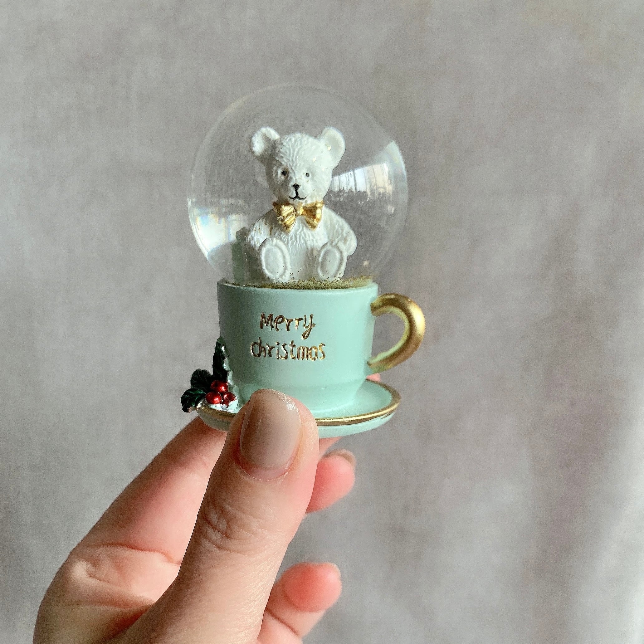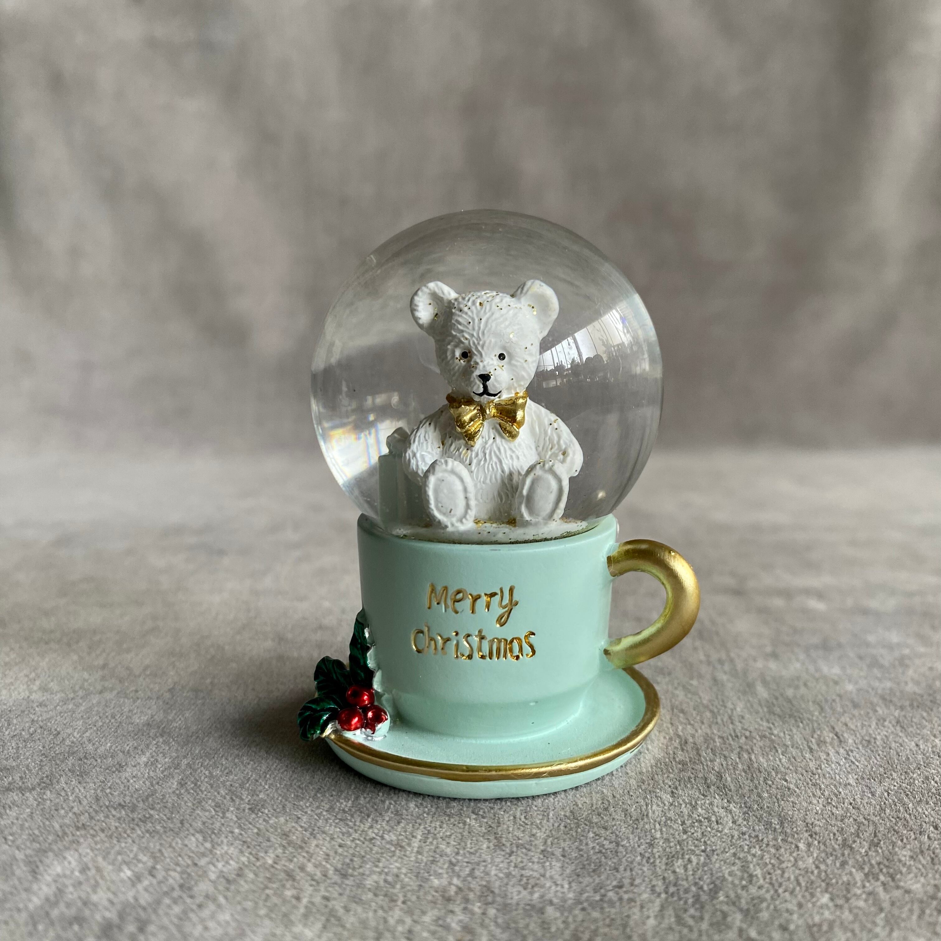 パステルカラーのティーカップにテディベアが入った、可愛いミニスノードームオブジェ。