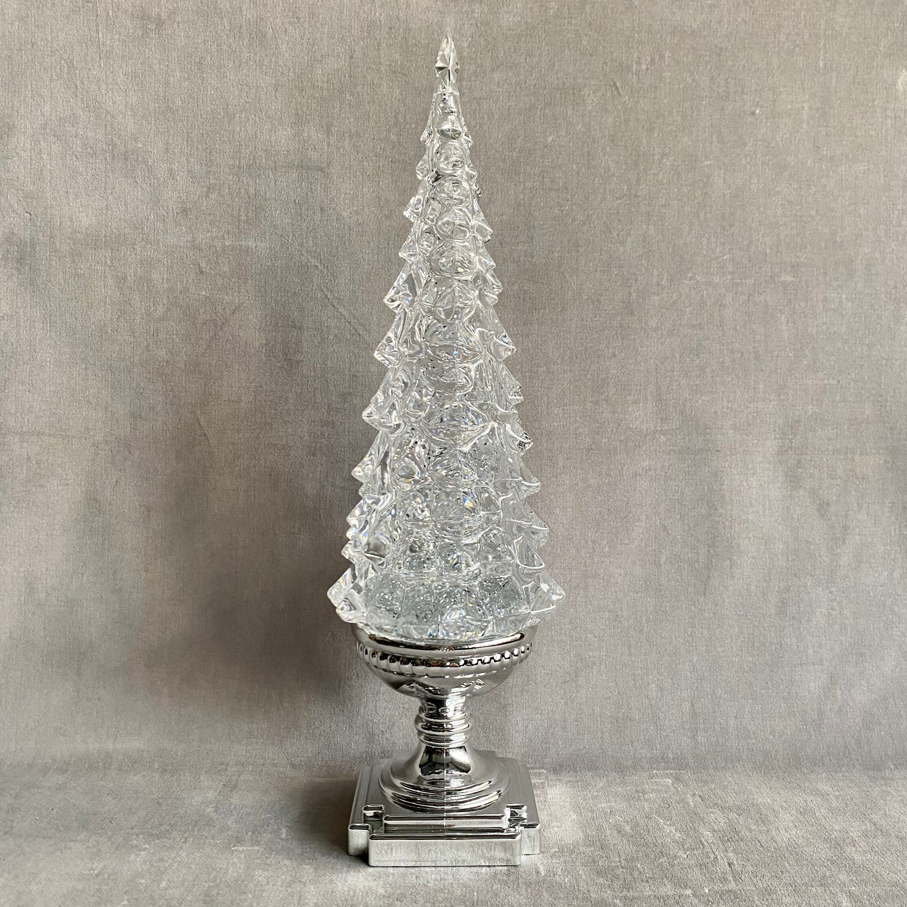 クラシカルなデザインのシルバーのベースを合わせた高級感のあるツリーで、スイッチを入れると中のラメが舞い上がります。