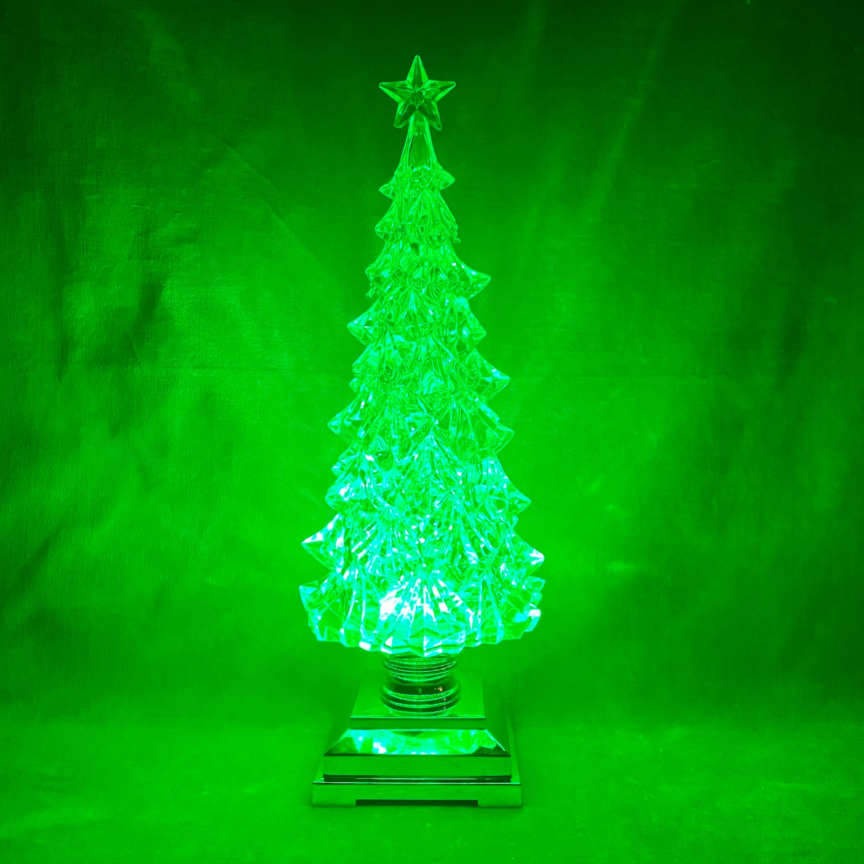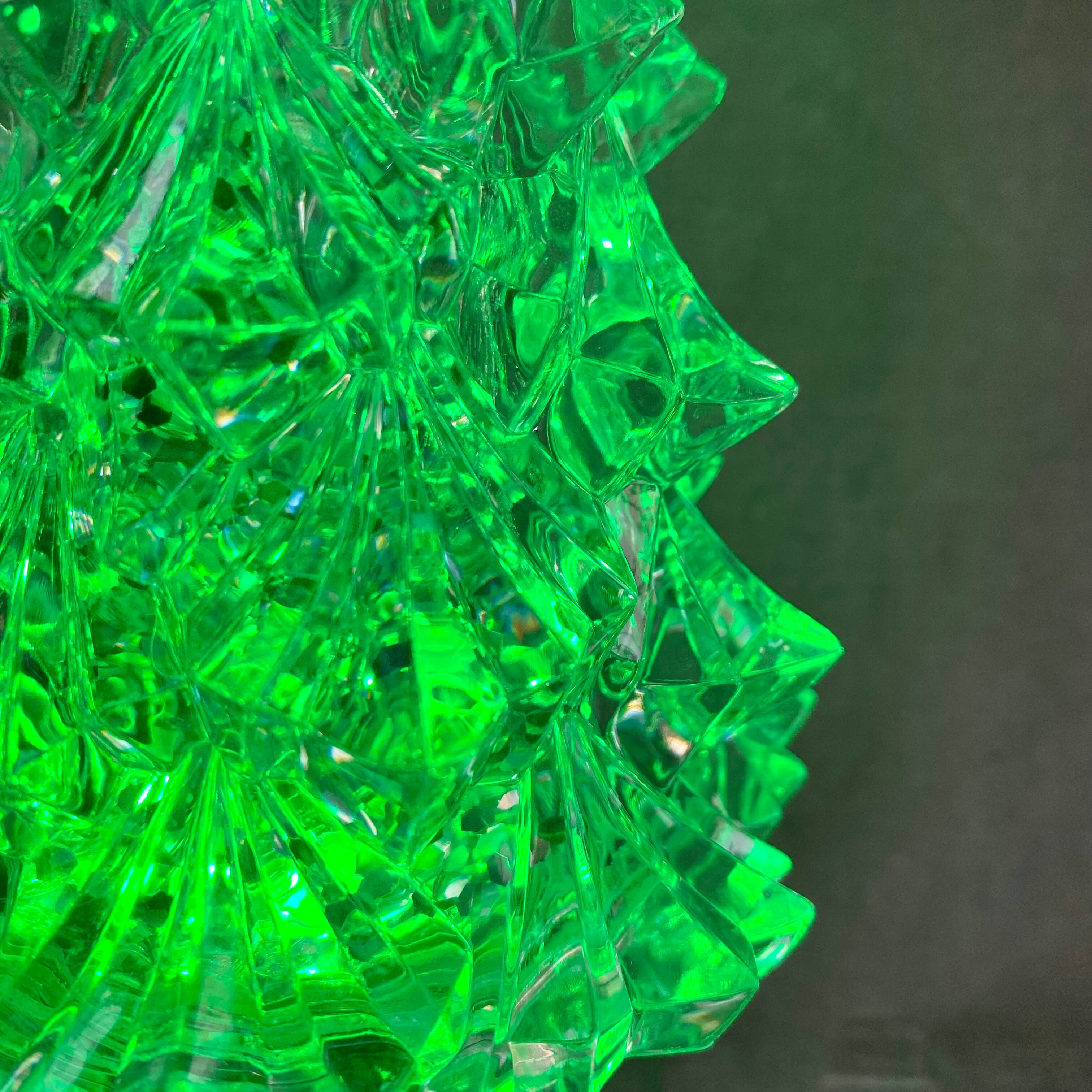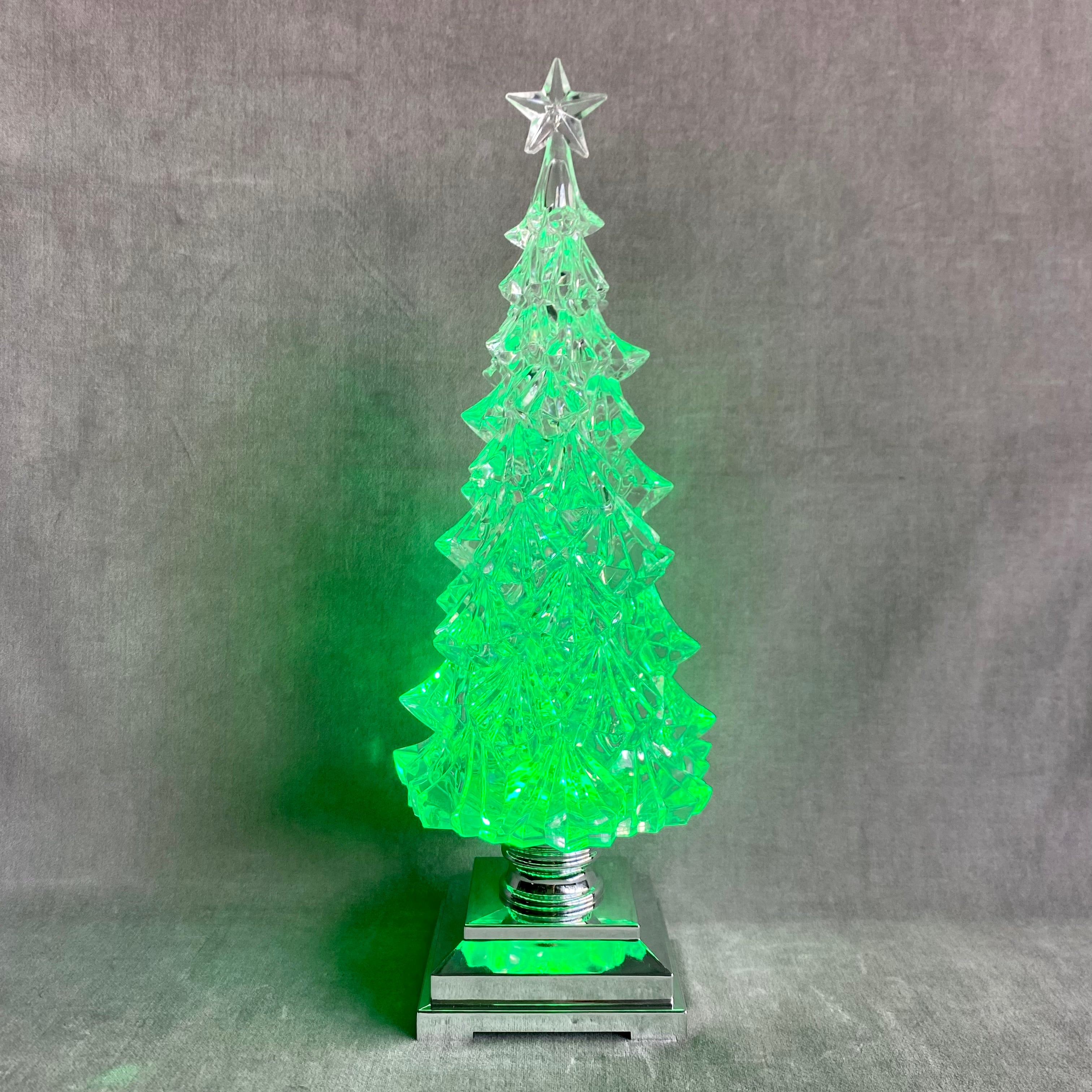 グリーンの光の中にラメが舞う幻想的なクリスマスツリーのオブジェ。