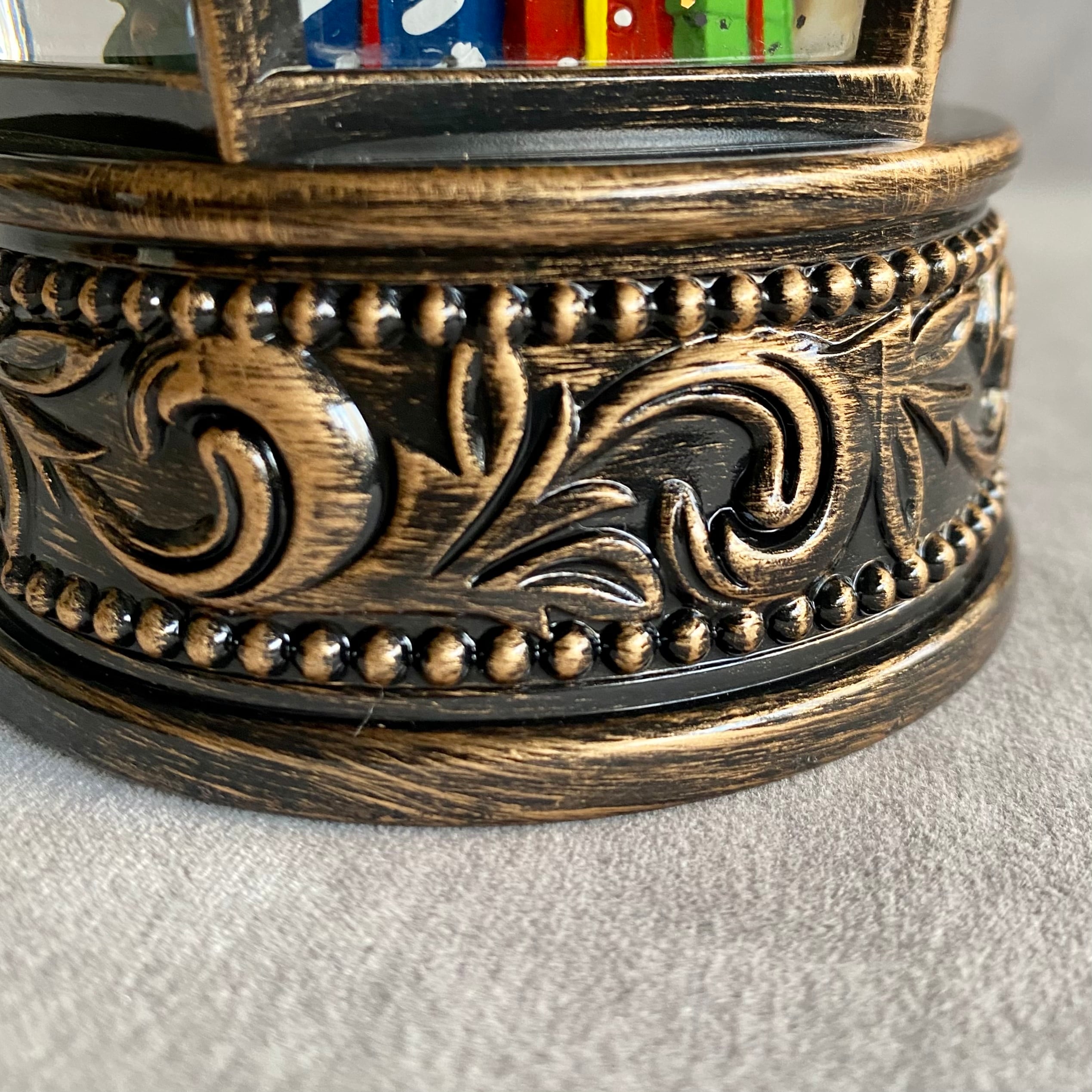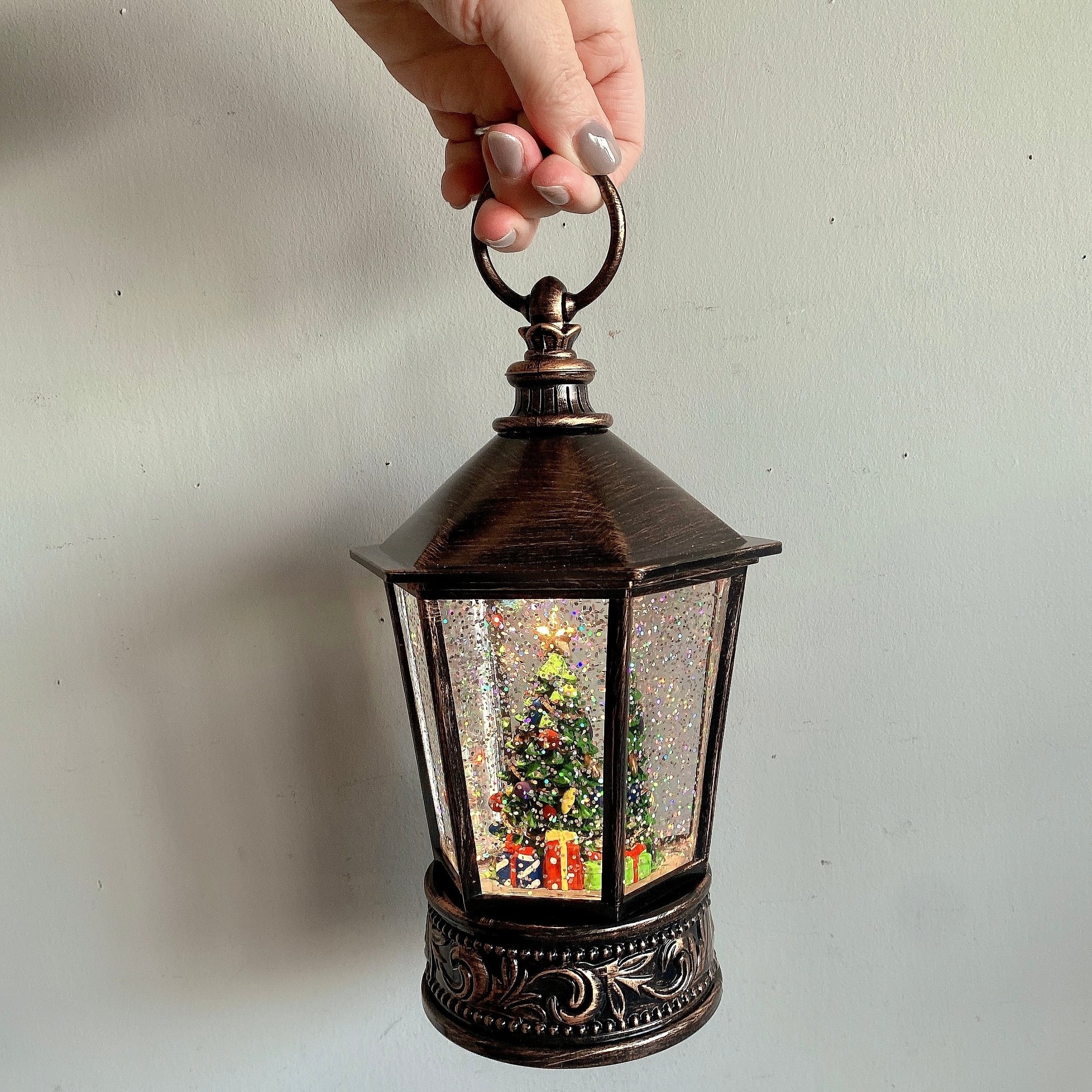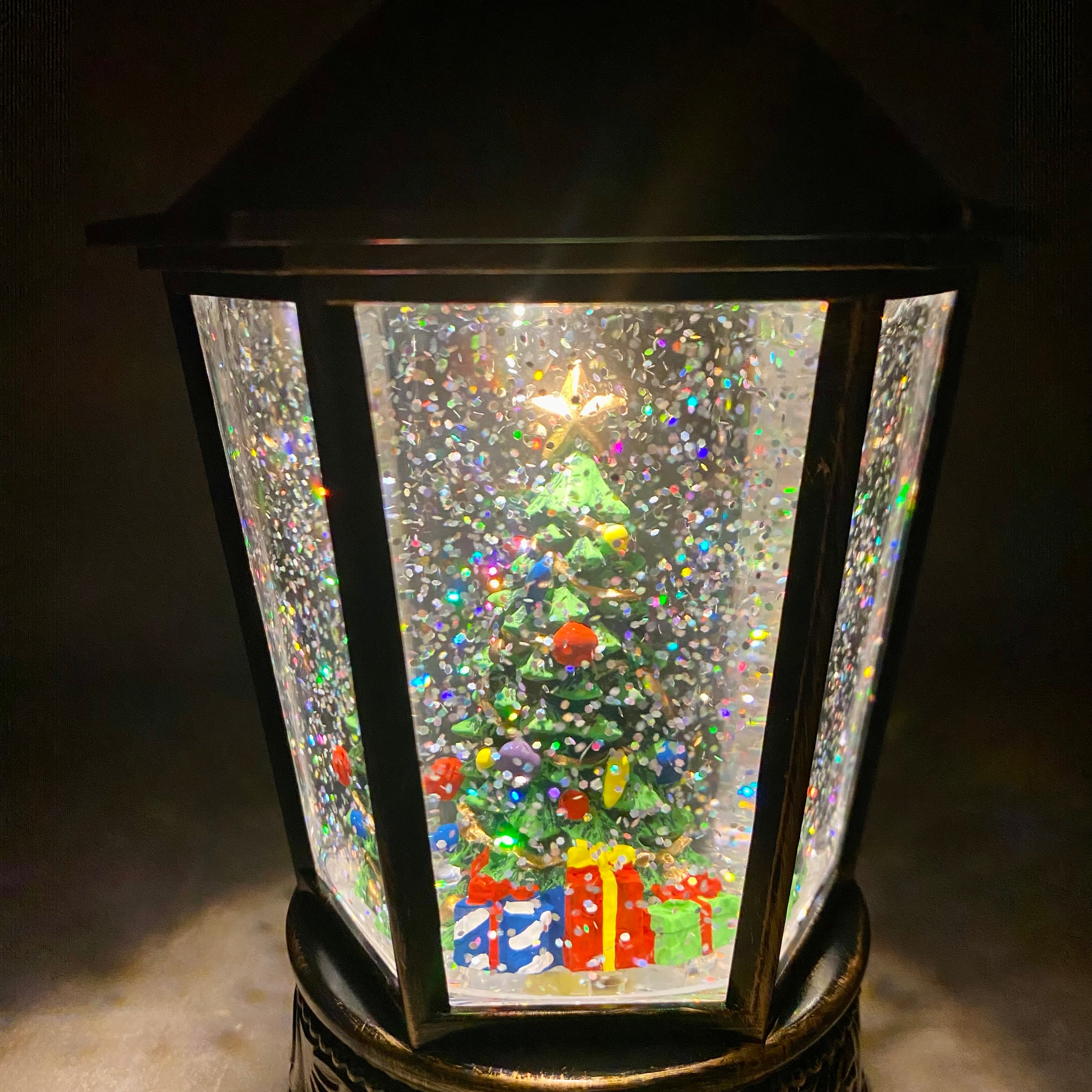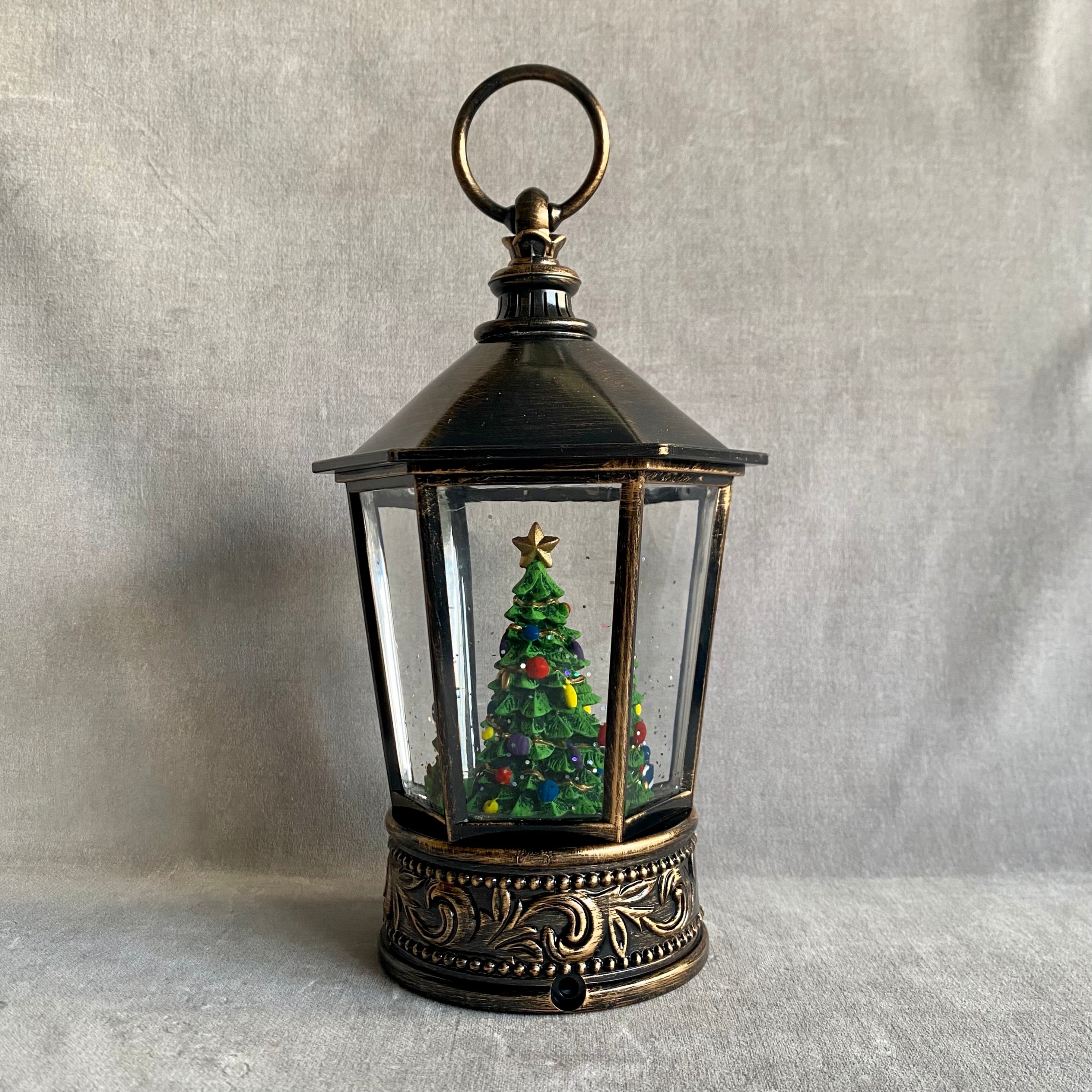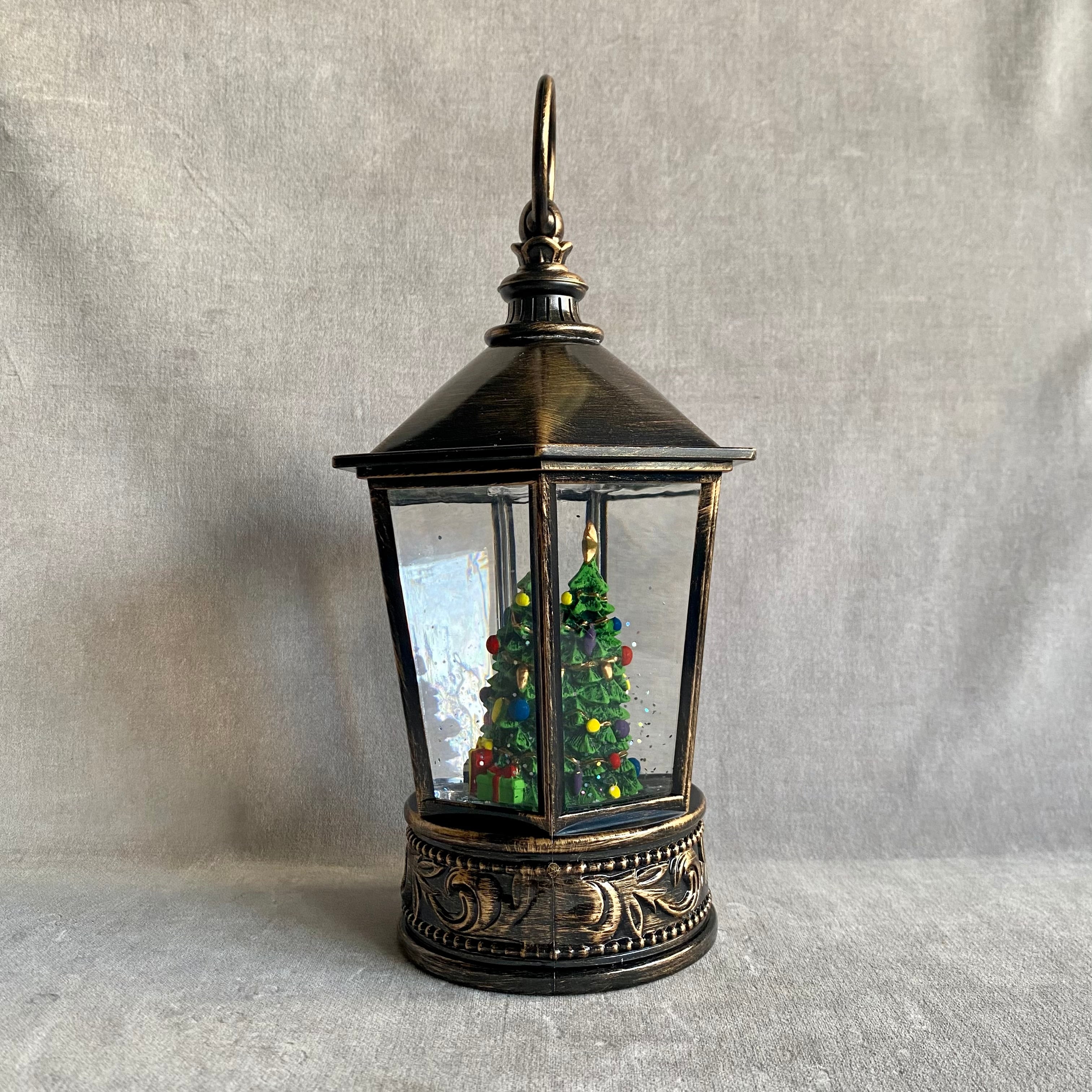 アンティーク風のクラシカルなランタンに大きなクリスマスツリーが入った高級感のあるクリスマスオブジェ。
