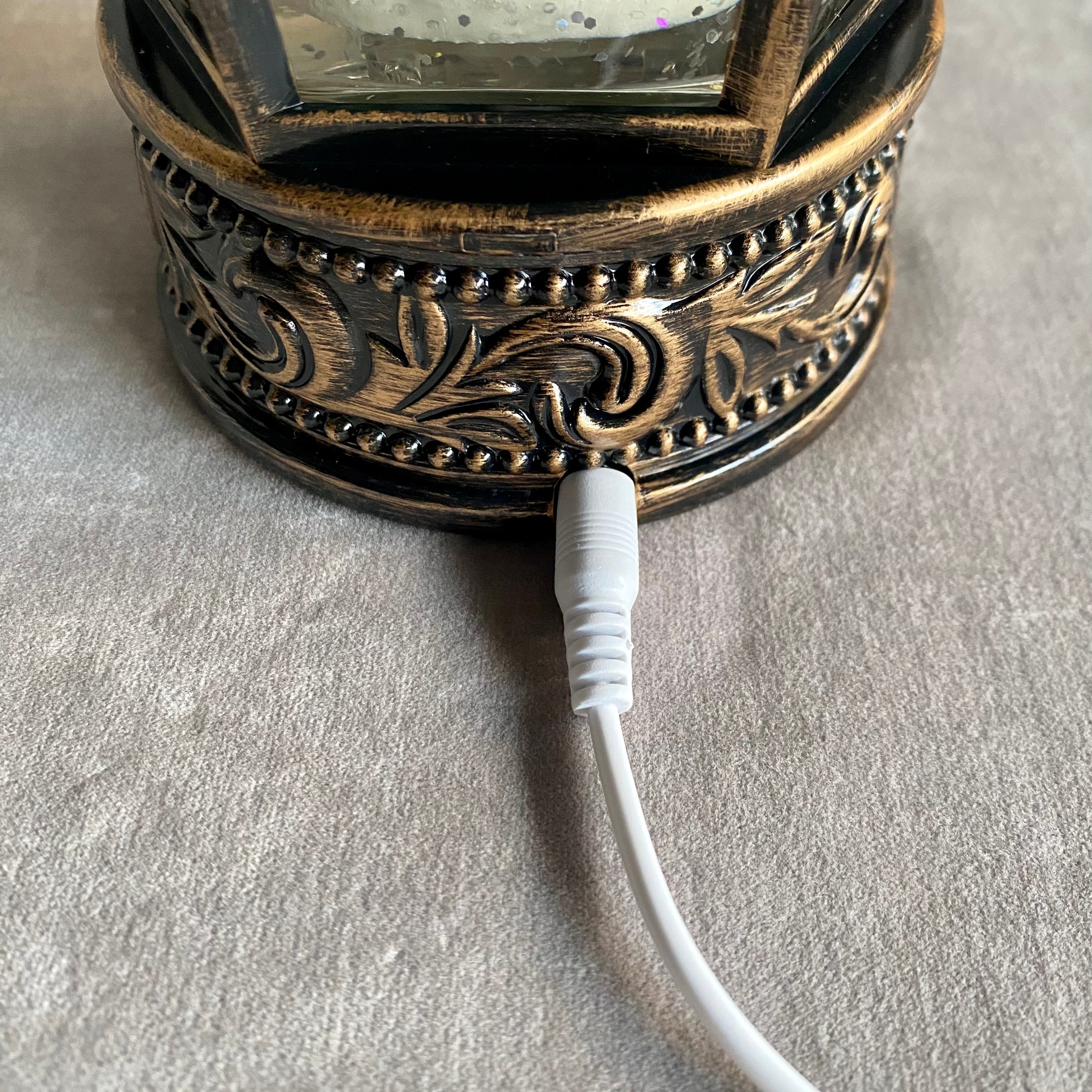 スイッチを入れるとLEDライトが点灯し、中の液体が循環してラメが舞い上がります。