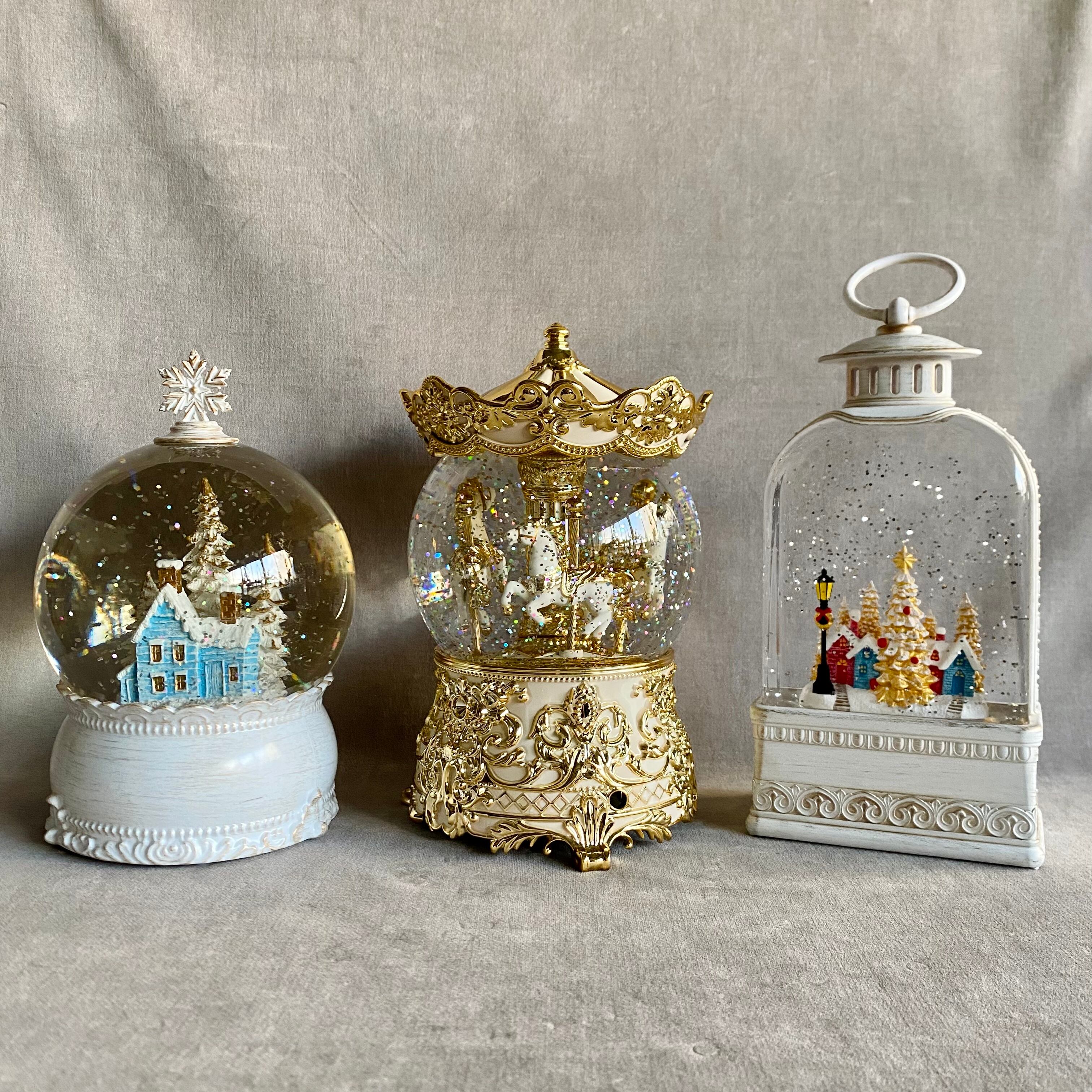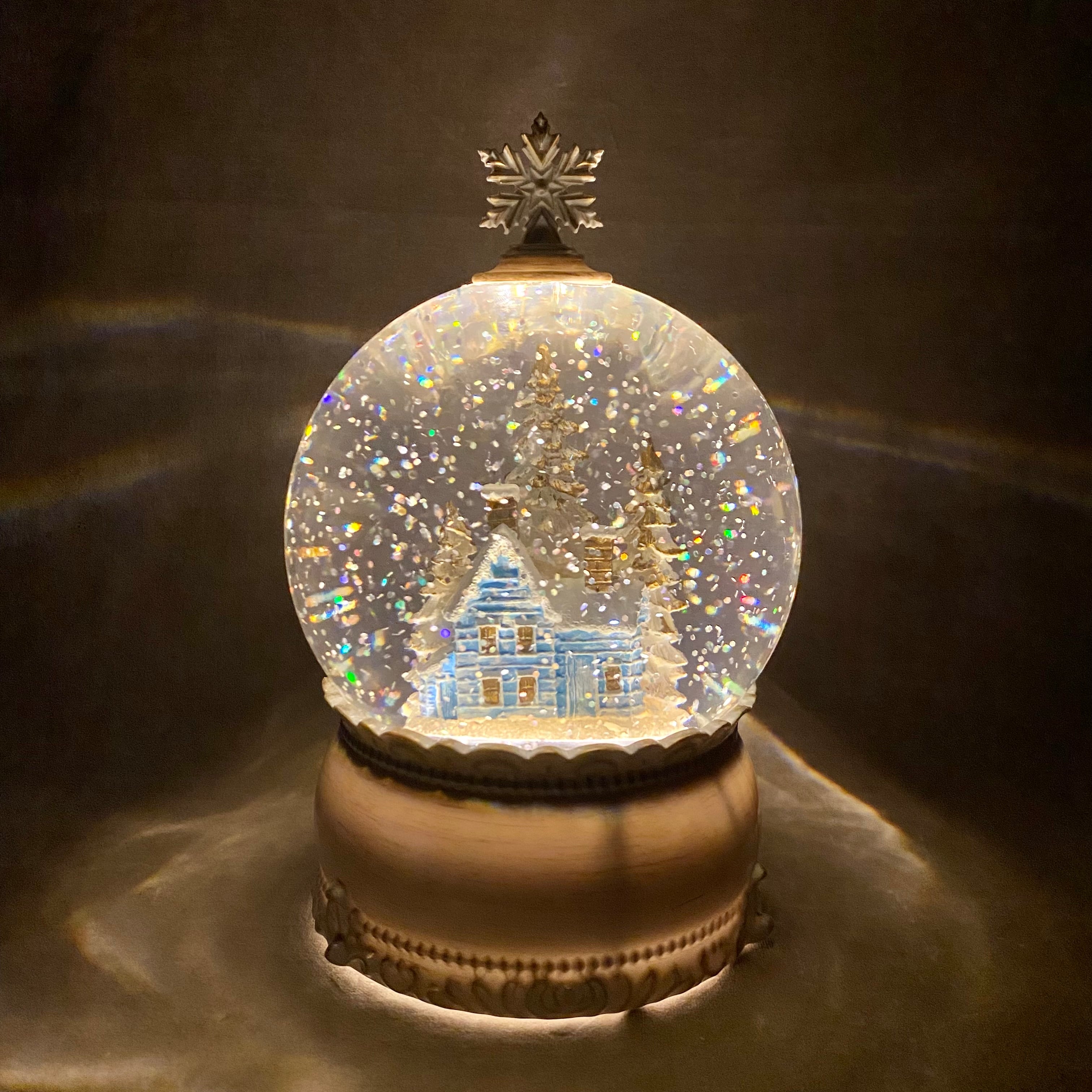 シャビー感のあるホワイトカラーとパステルブルーが華やかで、トップのスノーフレークがアクセントになった高級感のあるスノードームです。