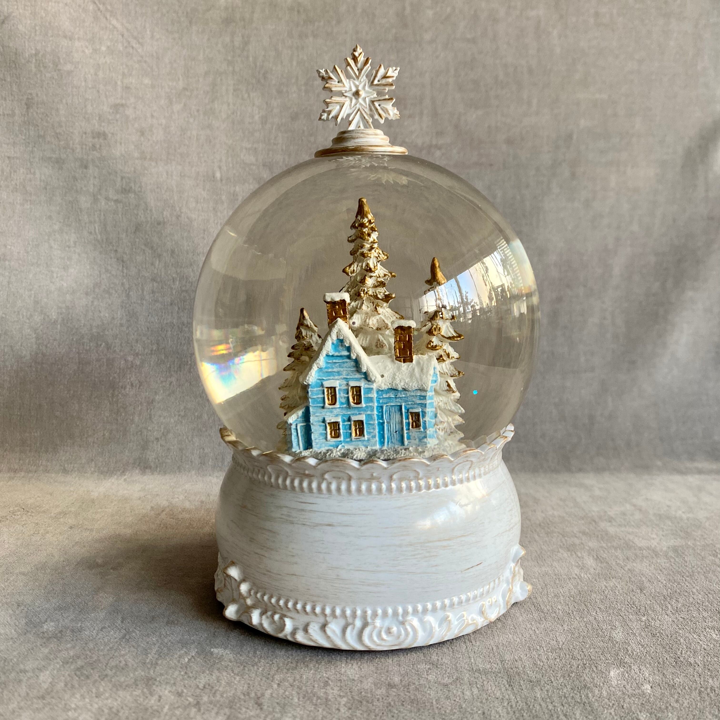 パステルブルーのお家が入ったエレガントな白いスノードームオブジェ。