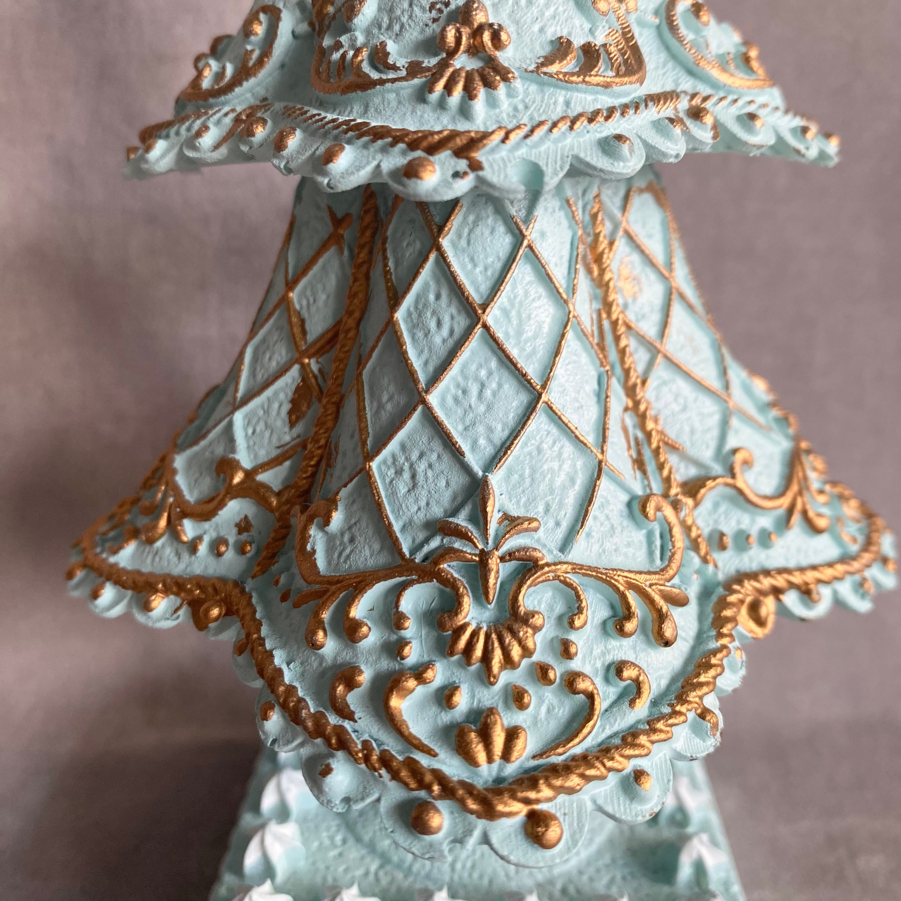 鮮やかなパステルブルーにゴールドの緻密な柄が映える華やかで存在感のある置物です。