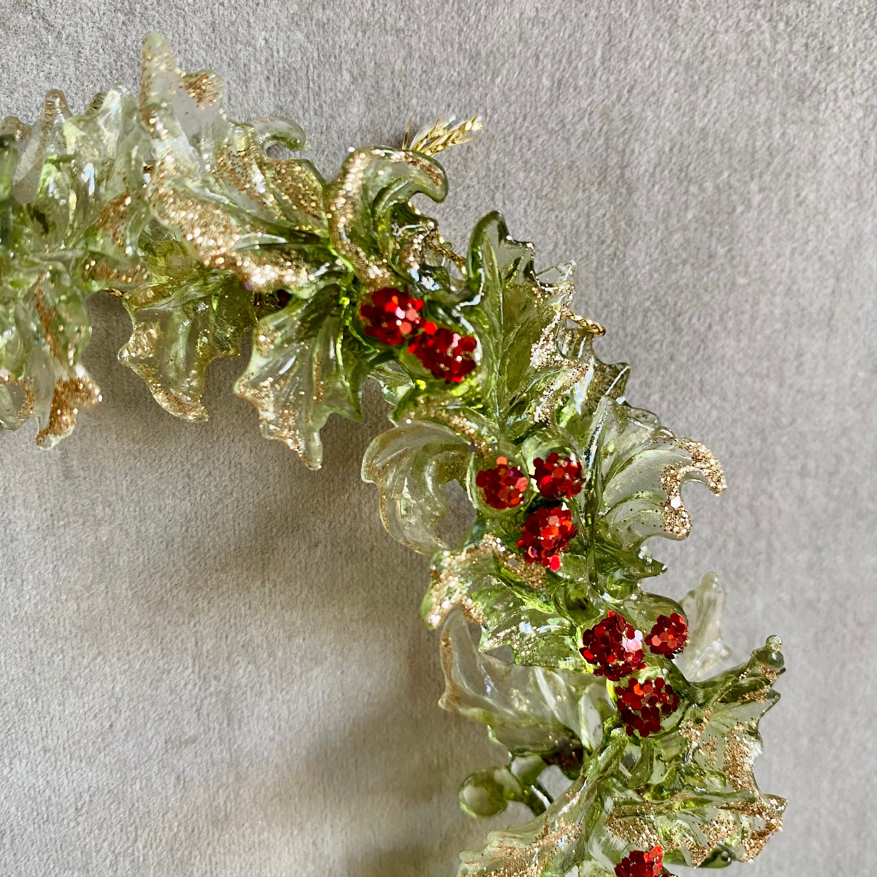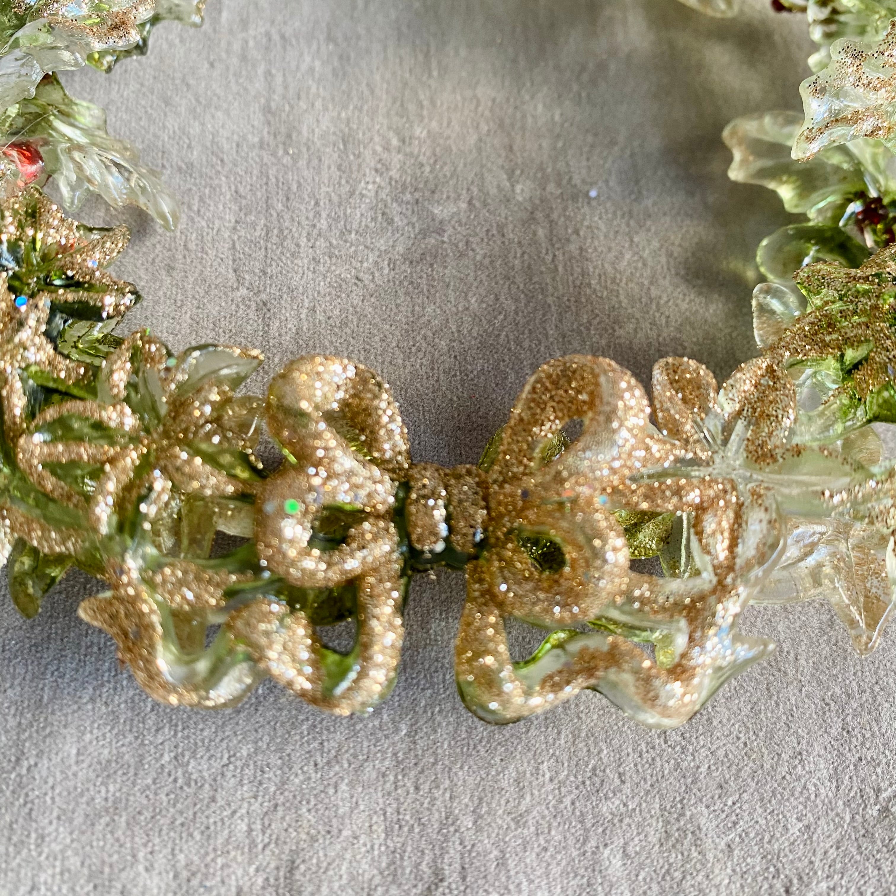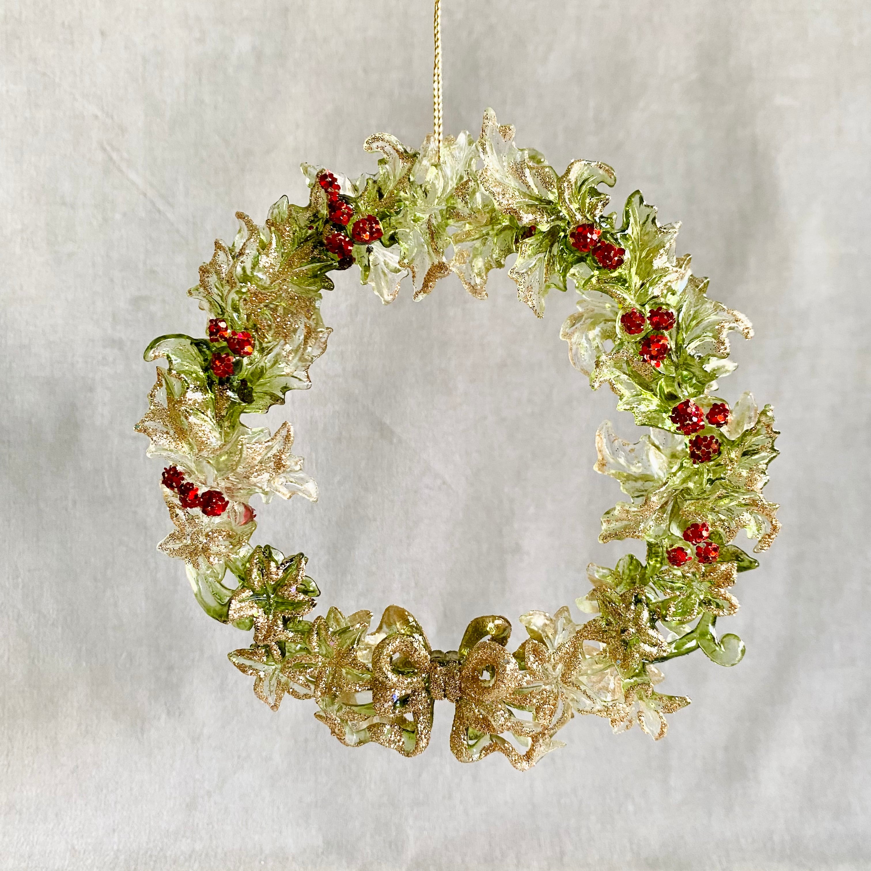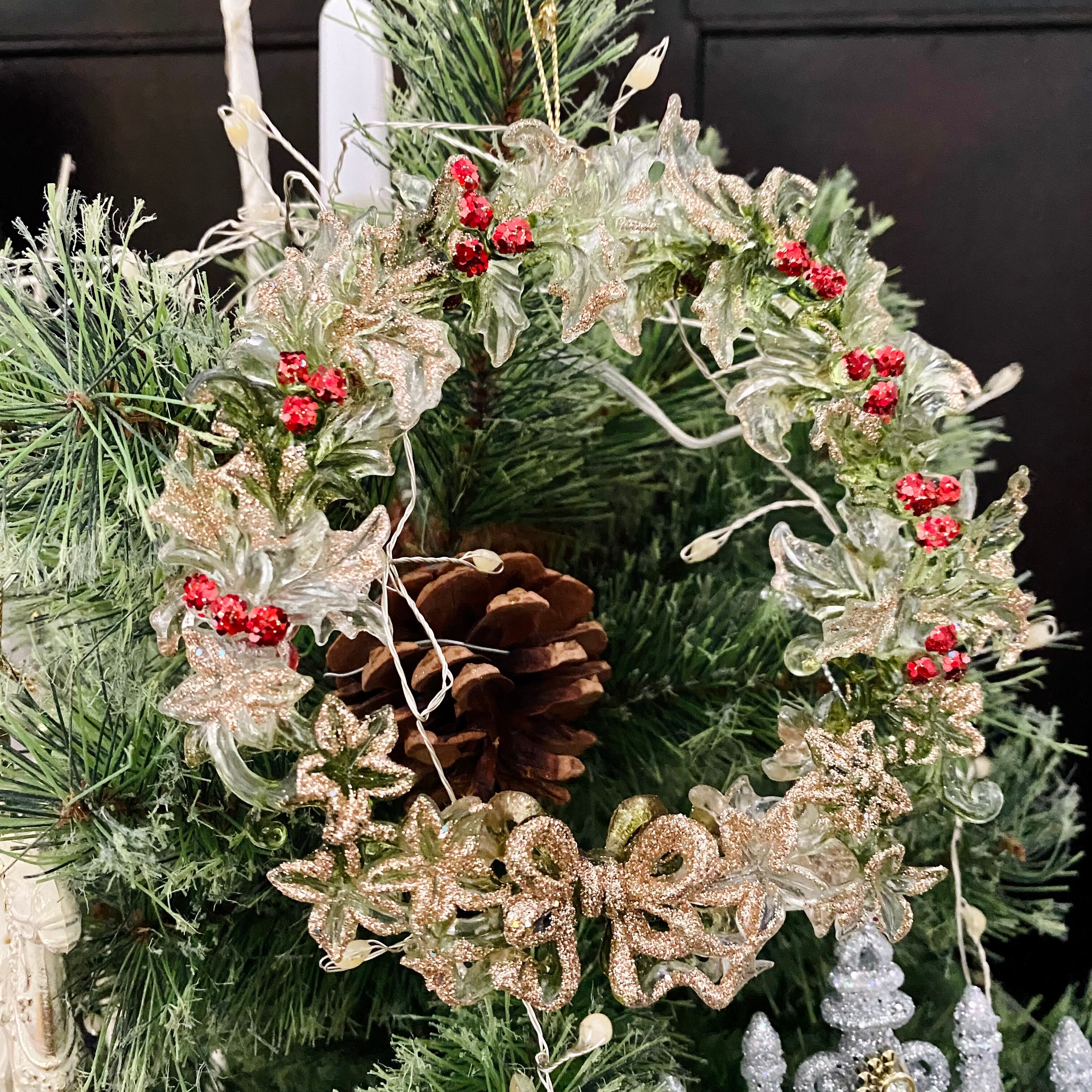 ヒイラギとポインセチアを連ねたかわいいリース型のクリスマスツリーオーナメント。