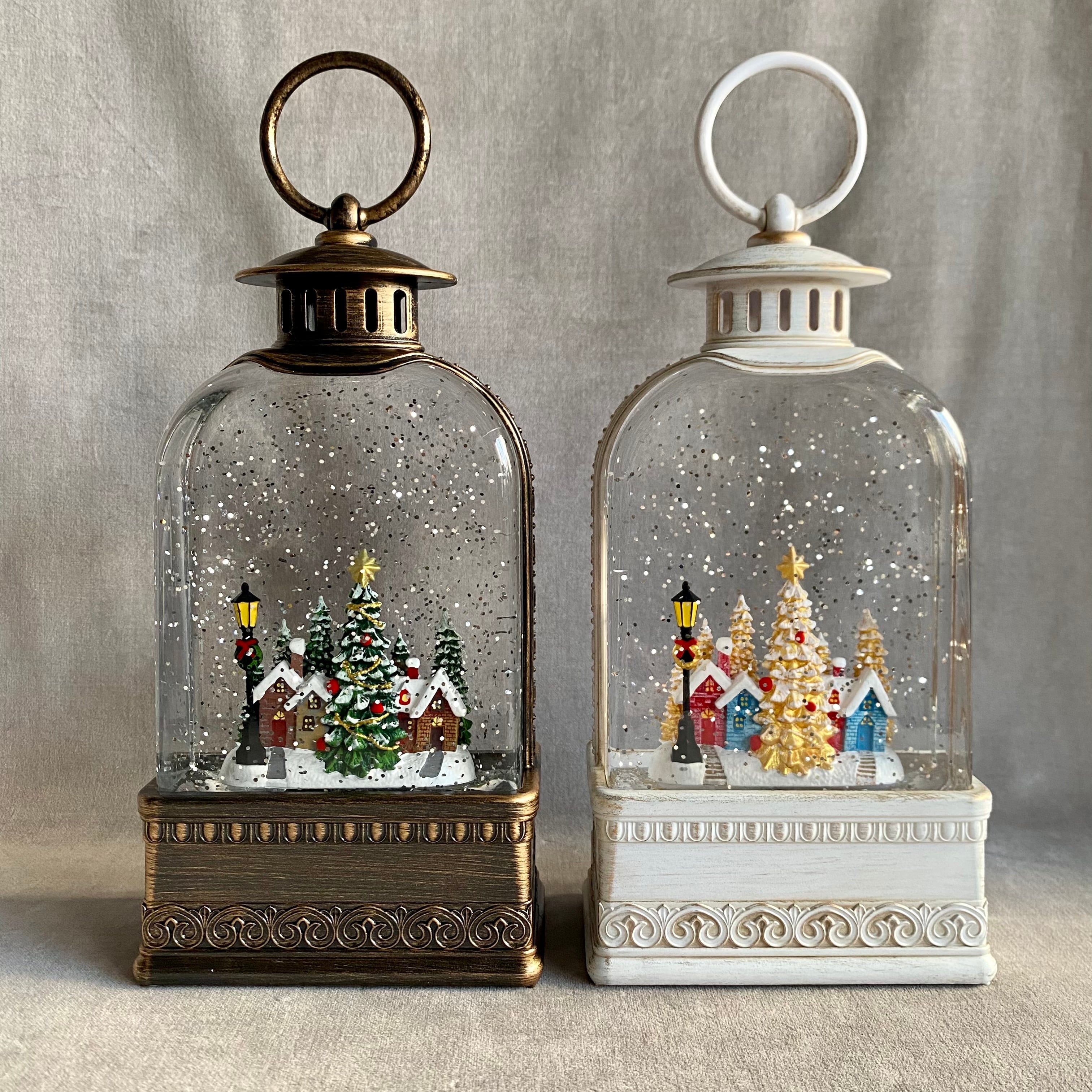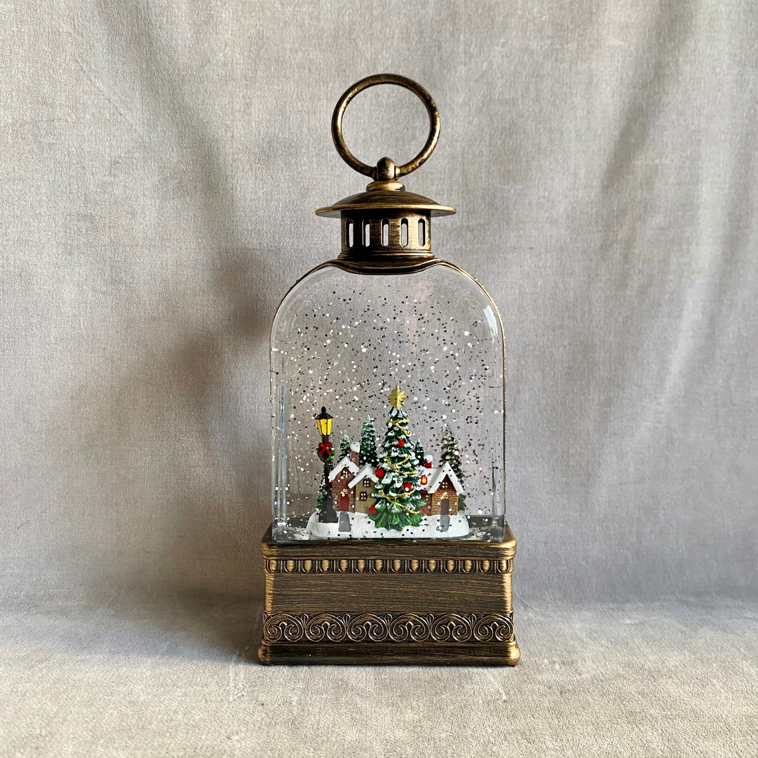 クラシカルなランタンの中に森にたたずむ大きなクリスマスツリーと家々が再現された高級感のあるクリスマスオブジェ。