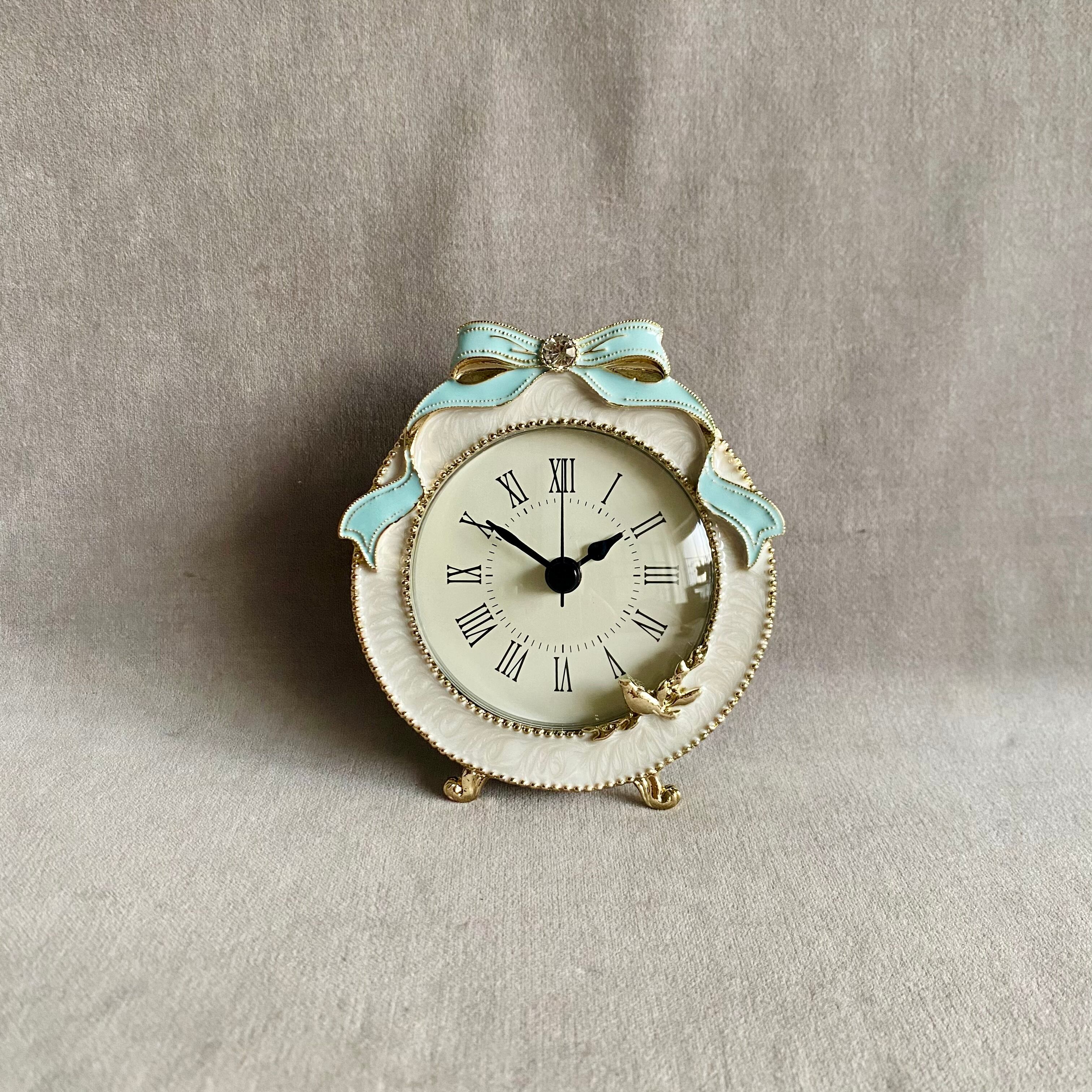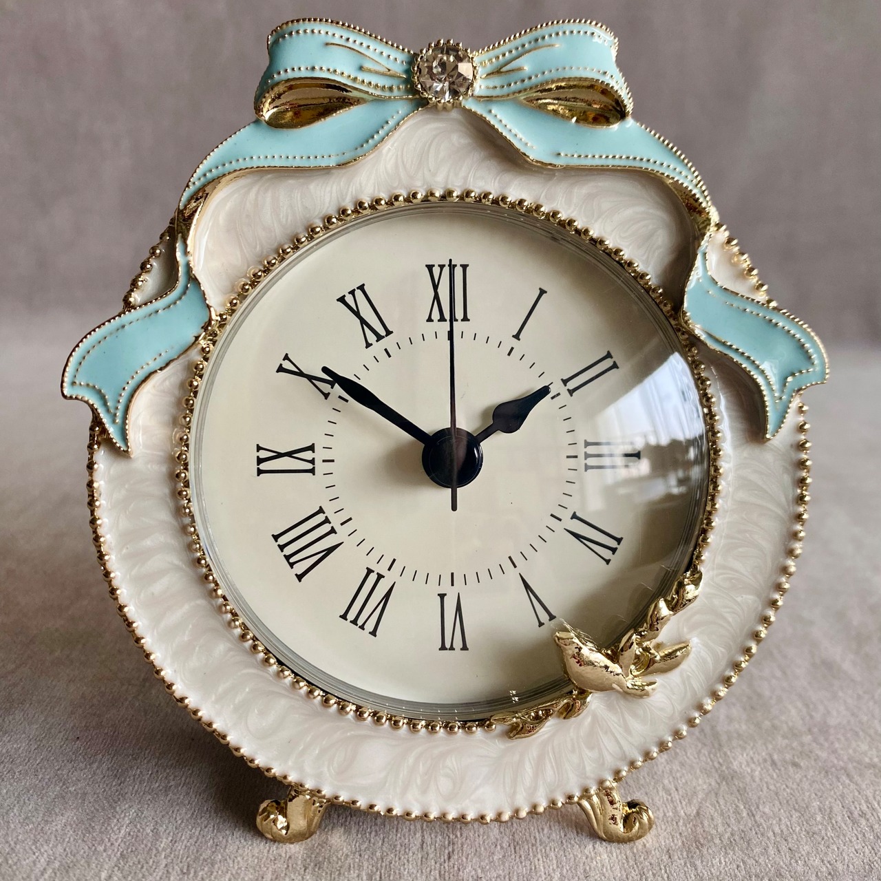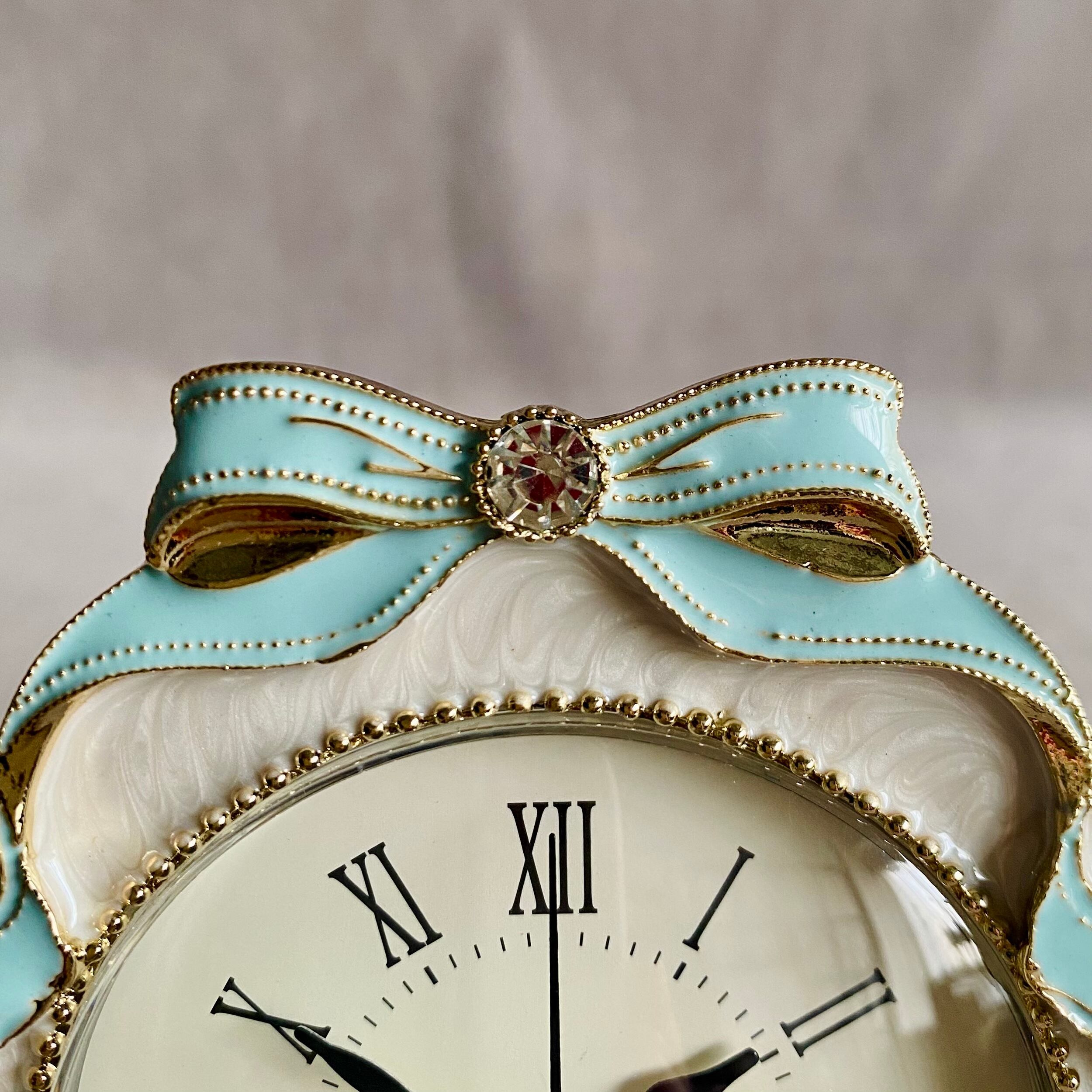 青いリボンと小さな鳥の装飾が美しい小さな置き時計。