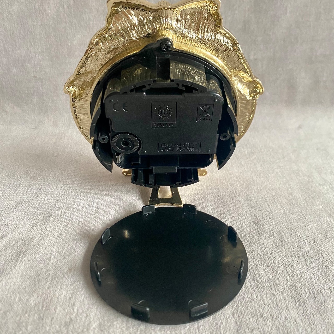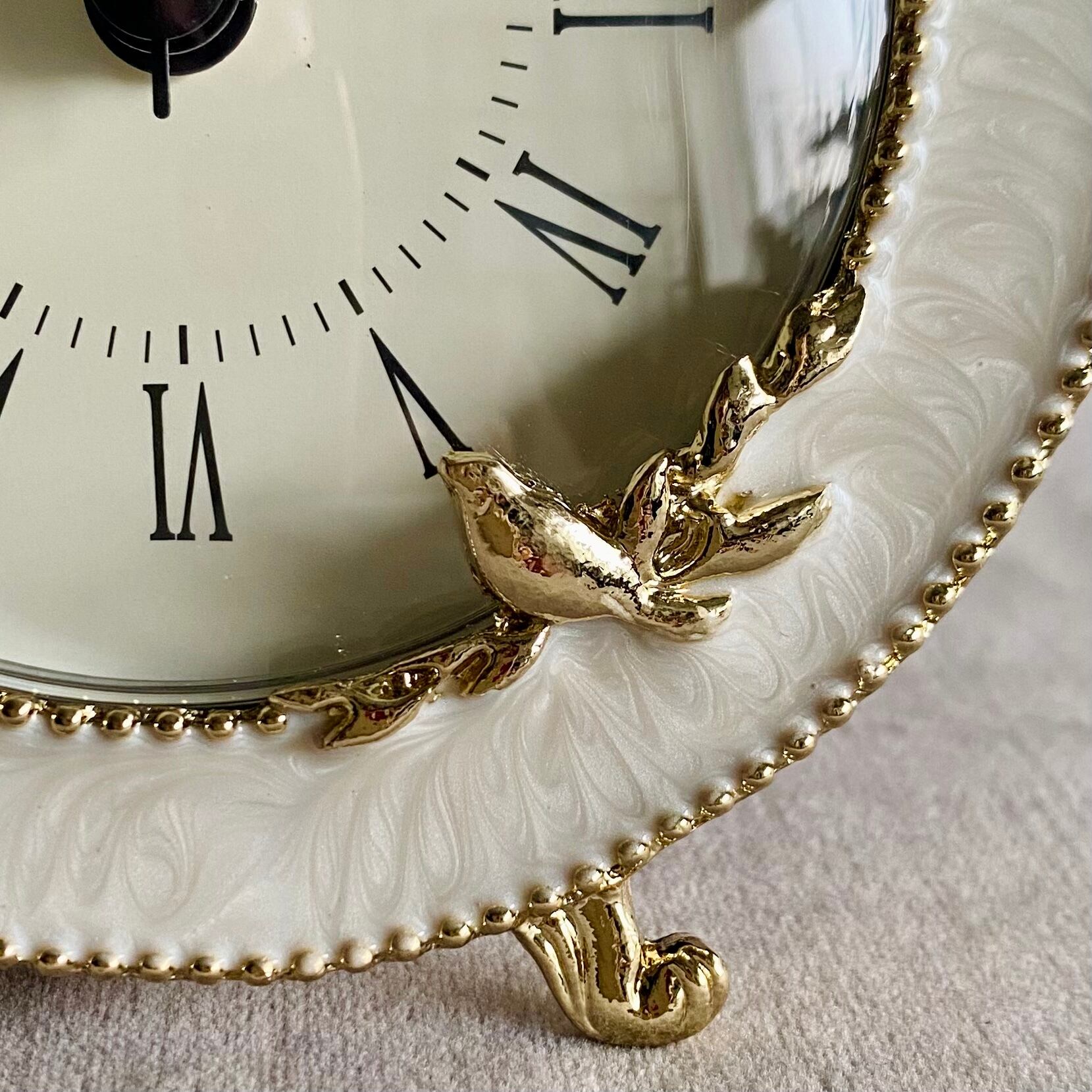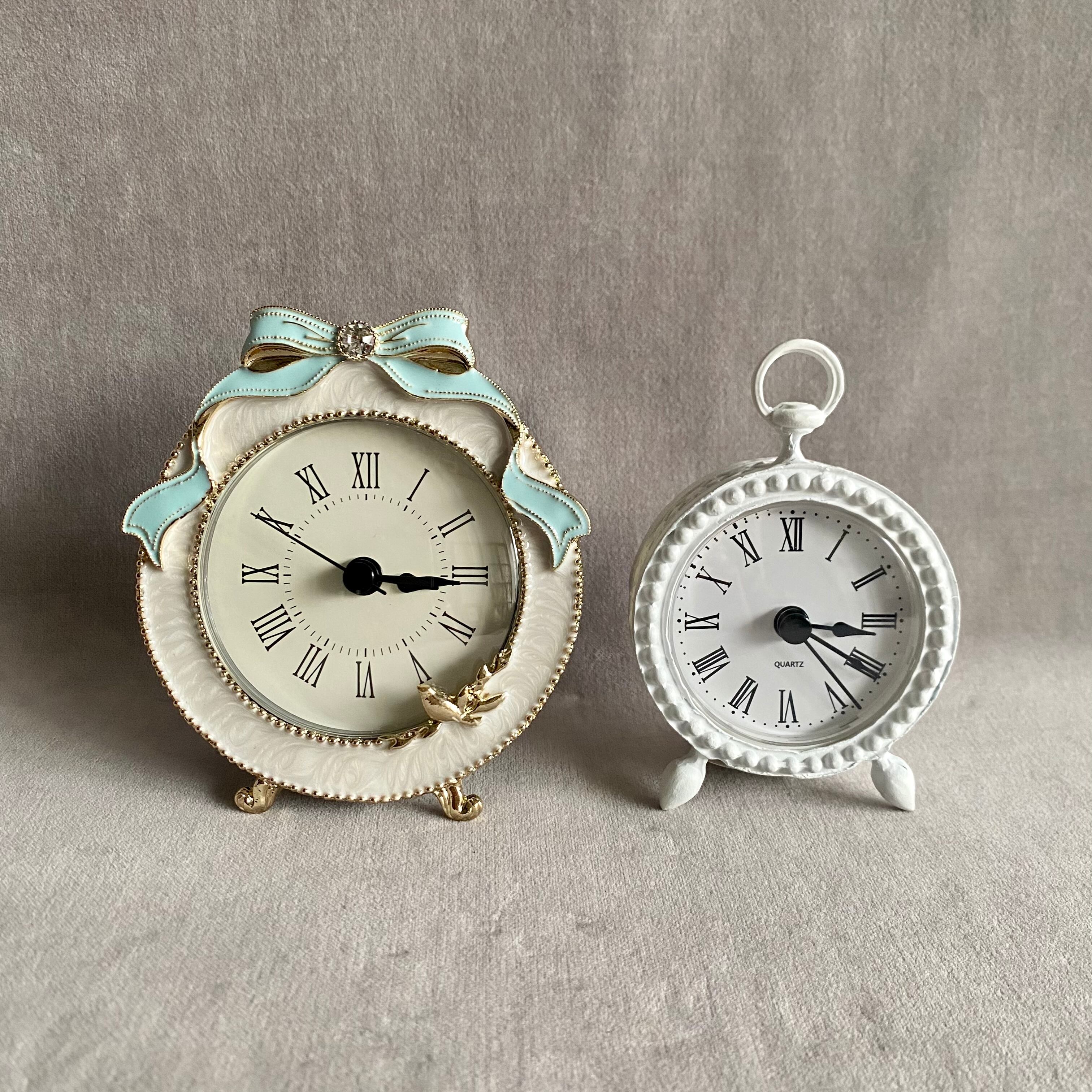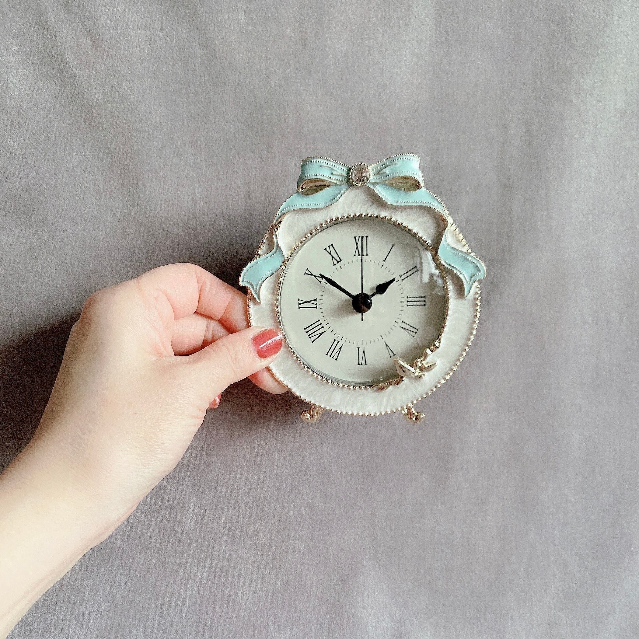 青いリボンと小さな鳥の装飾が美しい小さな置き時計。