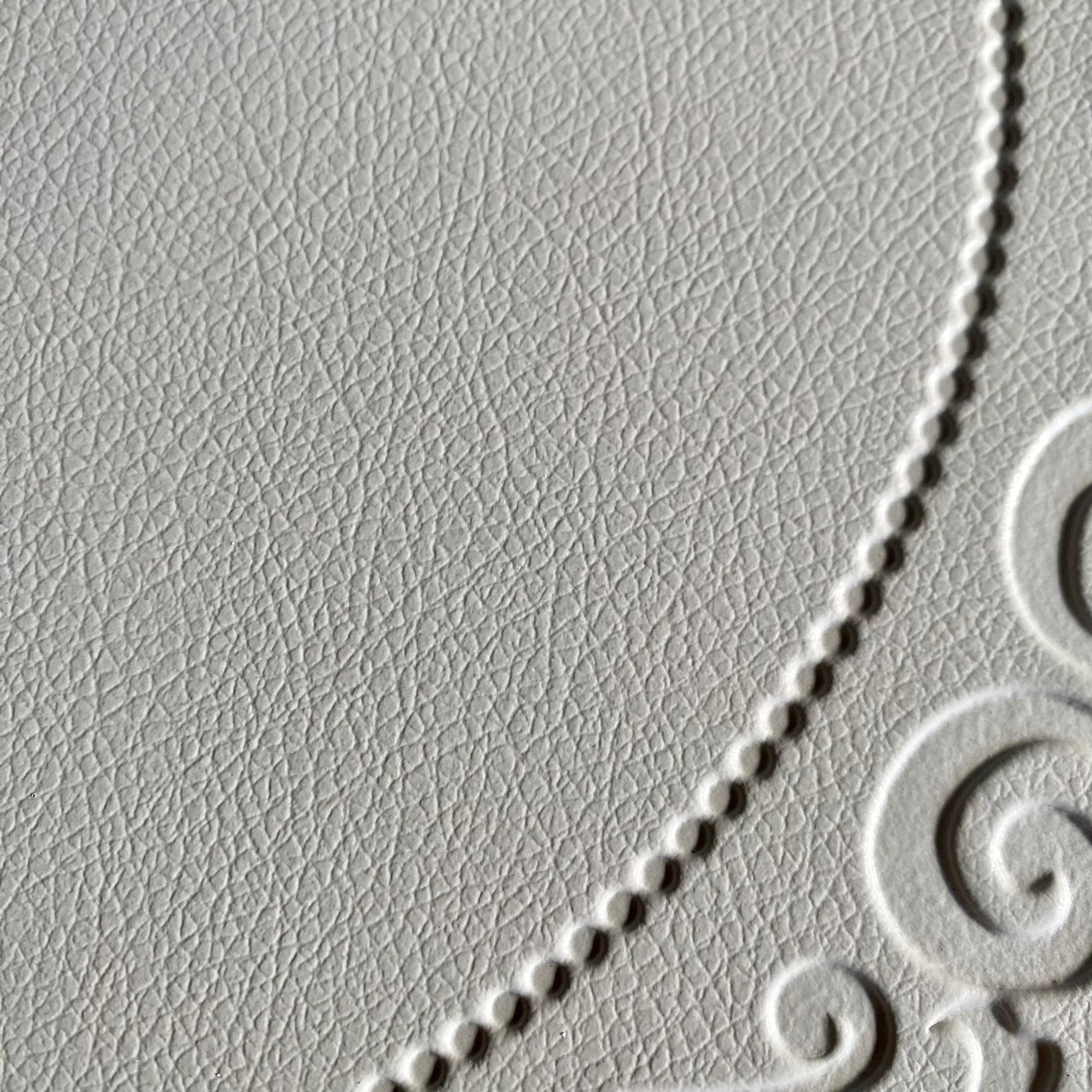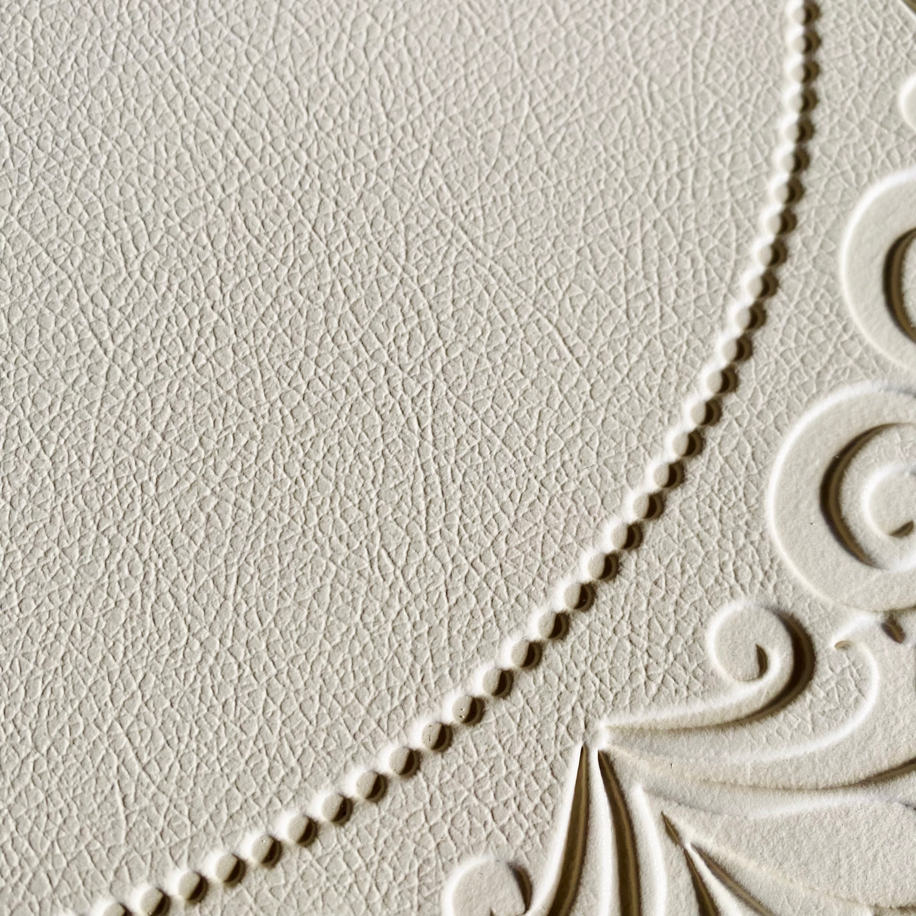 クラシカルなフレーム模様が立体的にデザインされた丸型PUレザー製のプレイスマット。