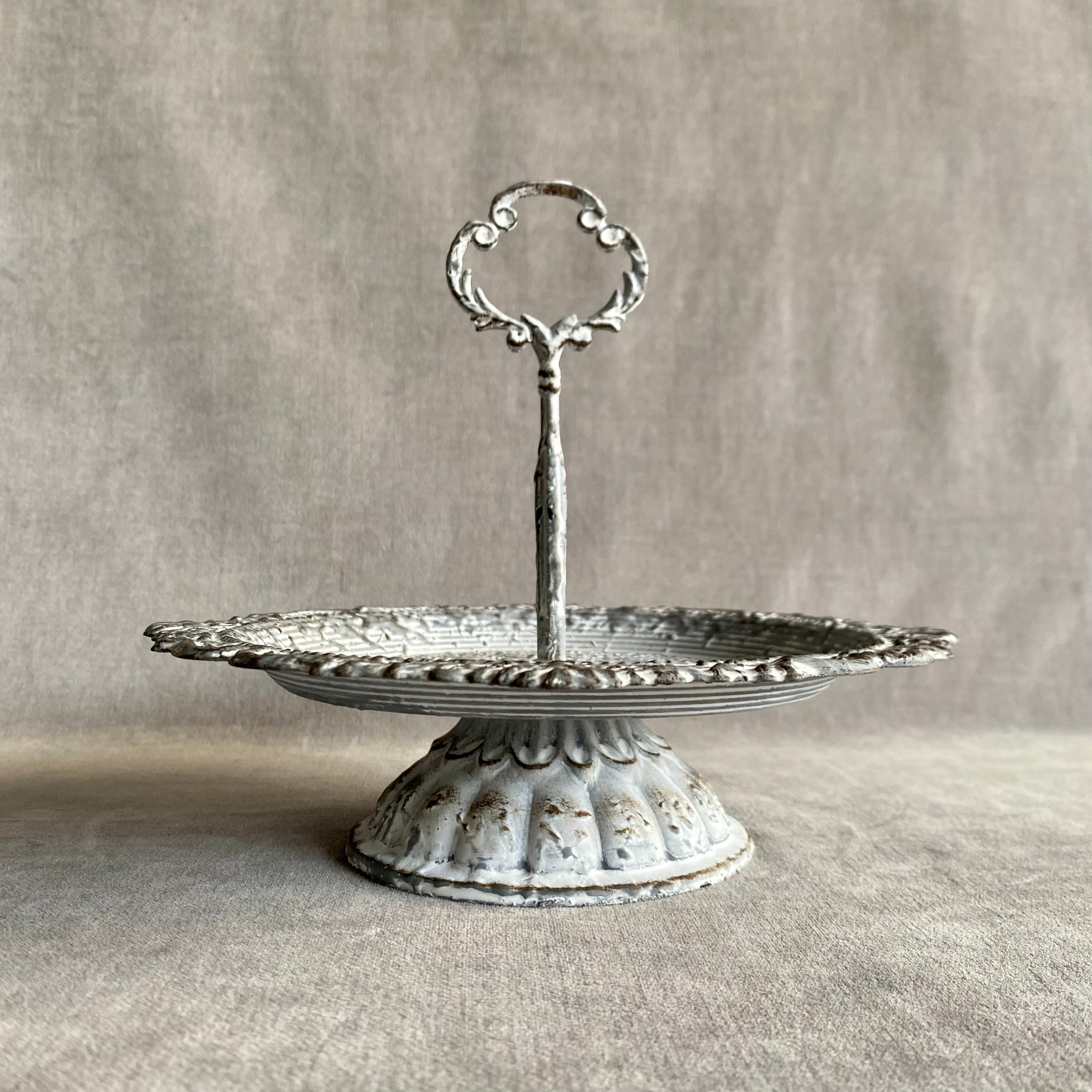エレガントなデザインの持ち手付きスチール製スタンドトレイ。