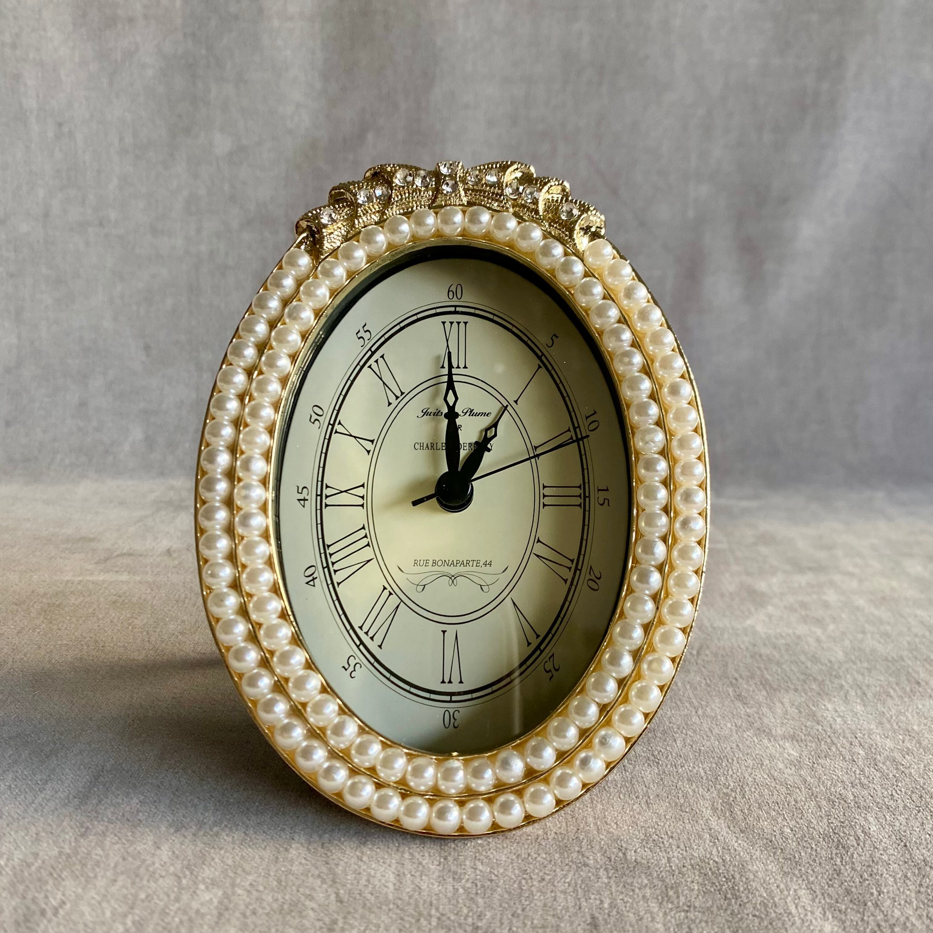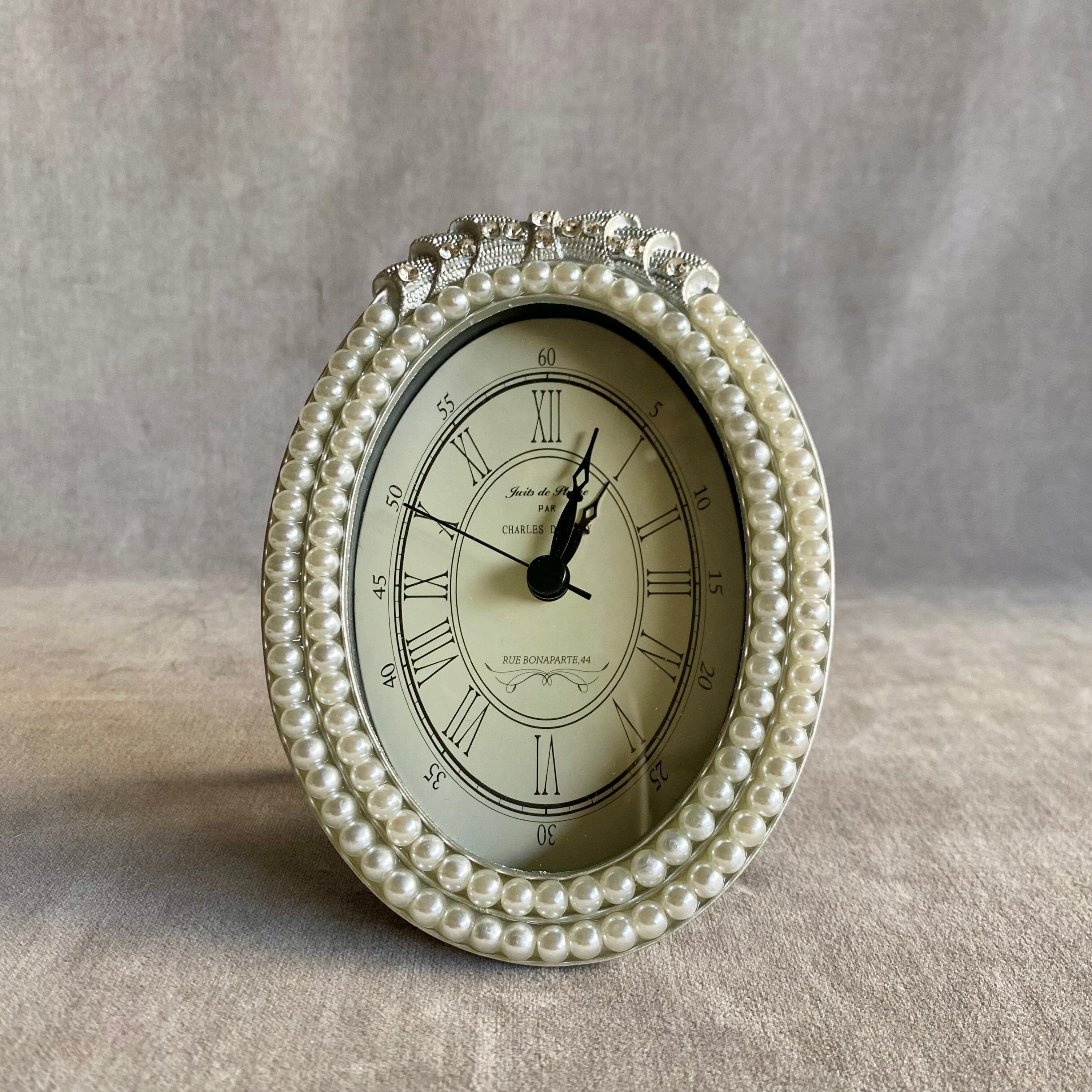 リボンとパールの装飾が美しい置き時計。