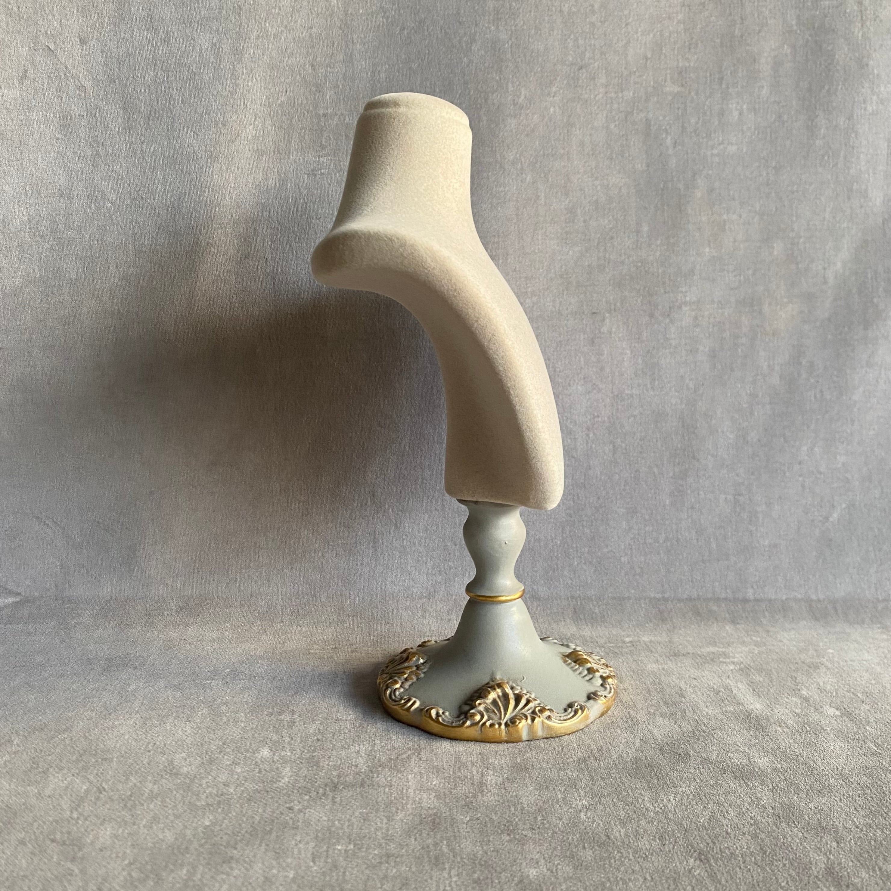 ベロア調のトルソーにシャビーシックなグレーとゴールドのコンビネーションカラーのスタンドを合わせた上品で高級感のあるデザインです。