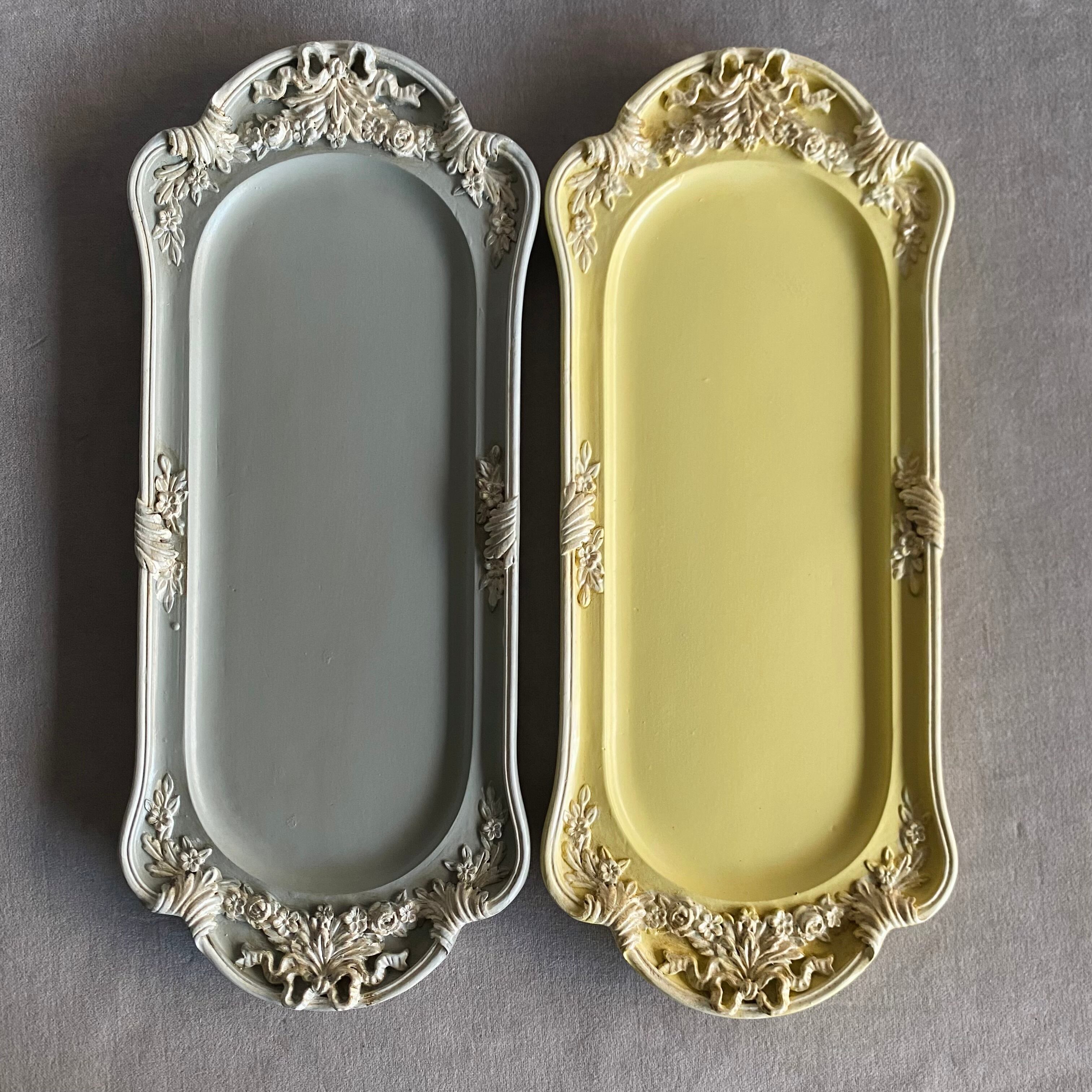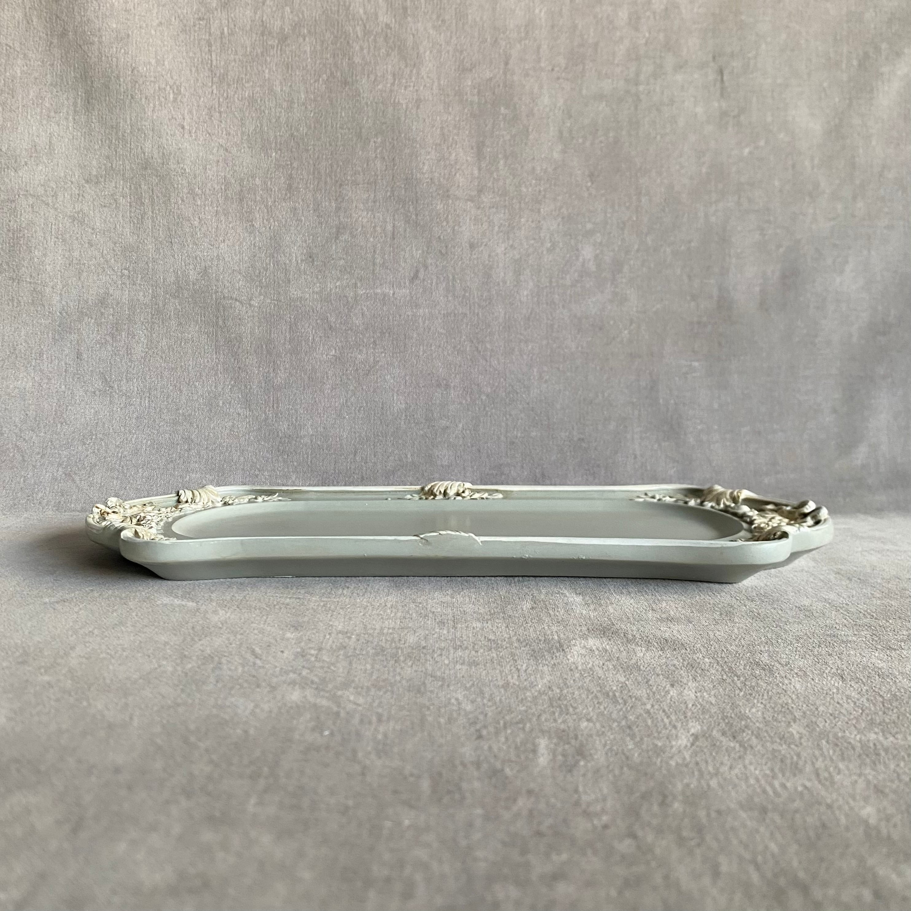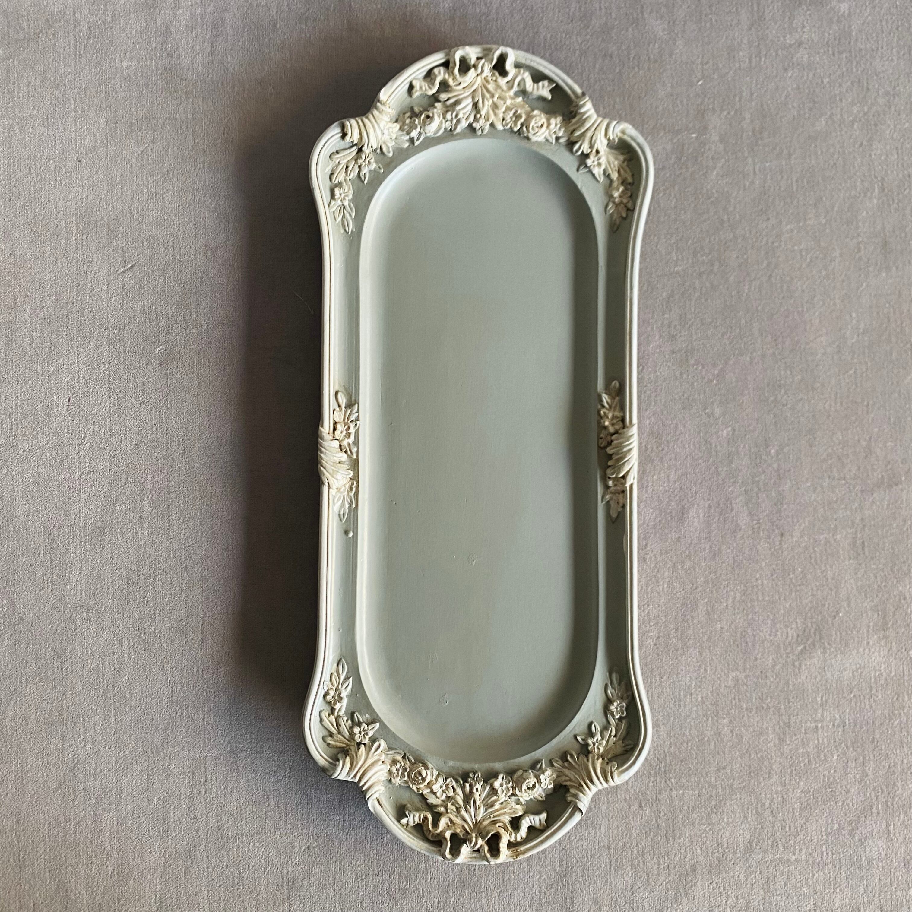 薔薇とリボンのレリーフが美しいクラシカルで上品なくすみグレーのアクセサリートレー。