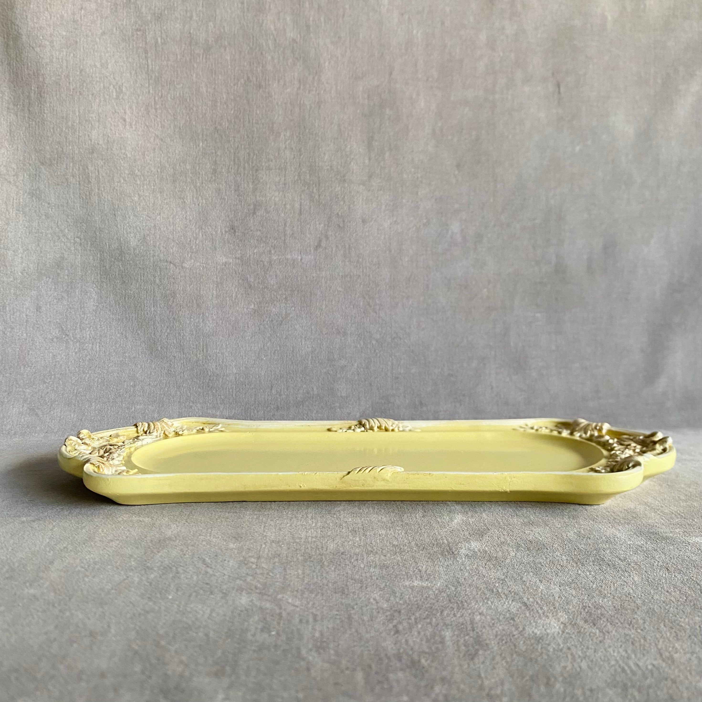 薔薇とリボンのレリーフが美しいクラシカルで上品なパステルイエローのアクセサリートレー。