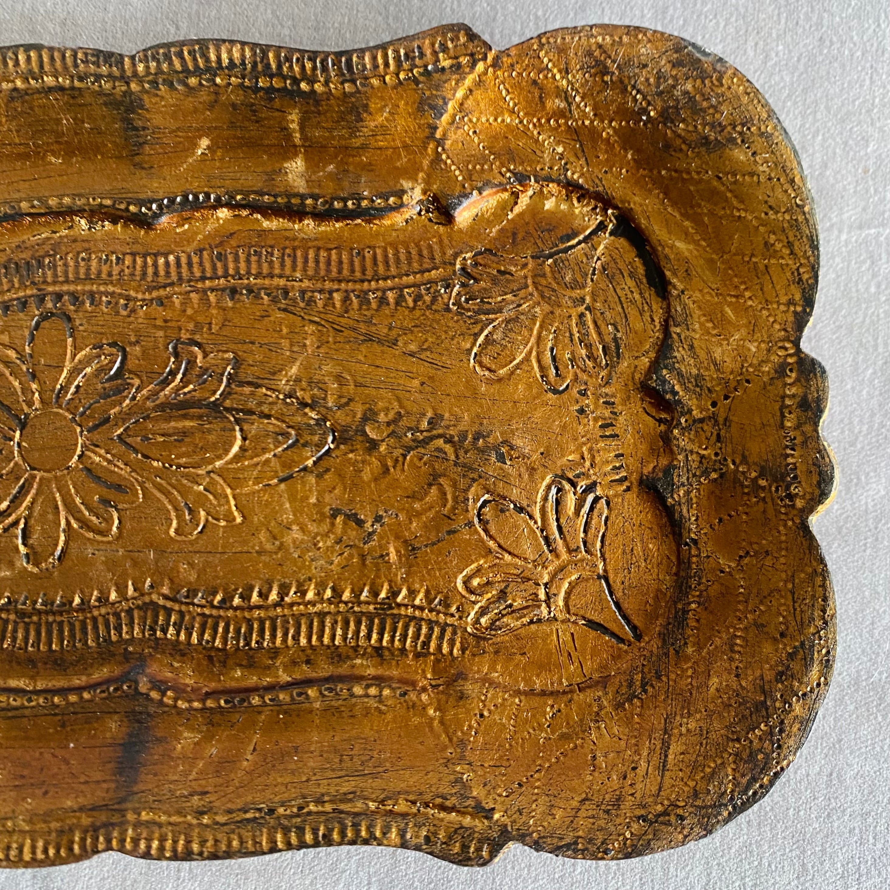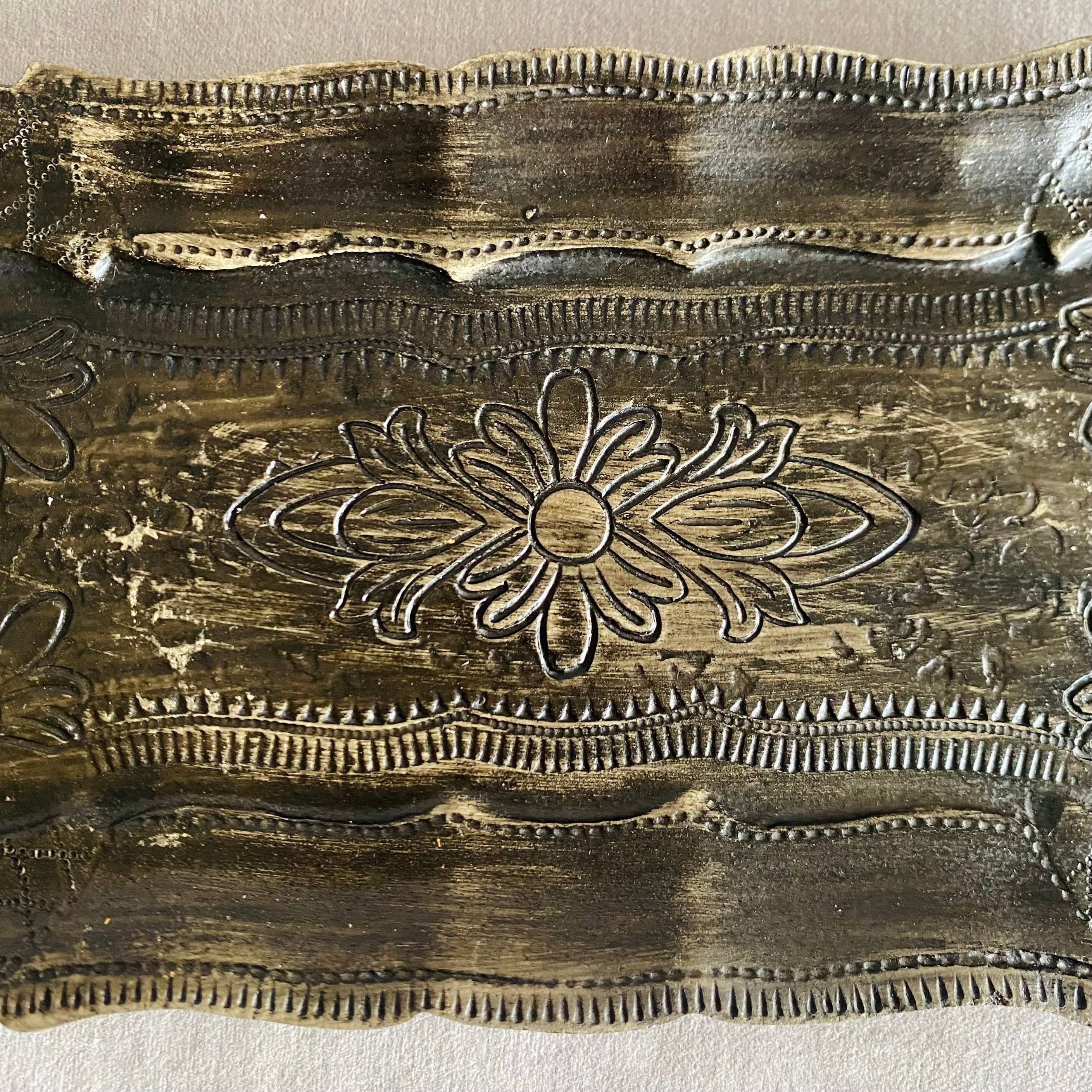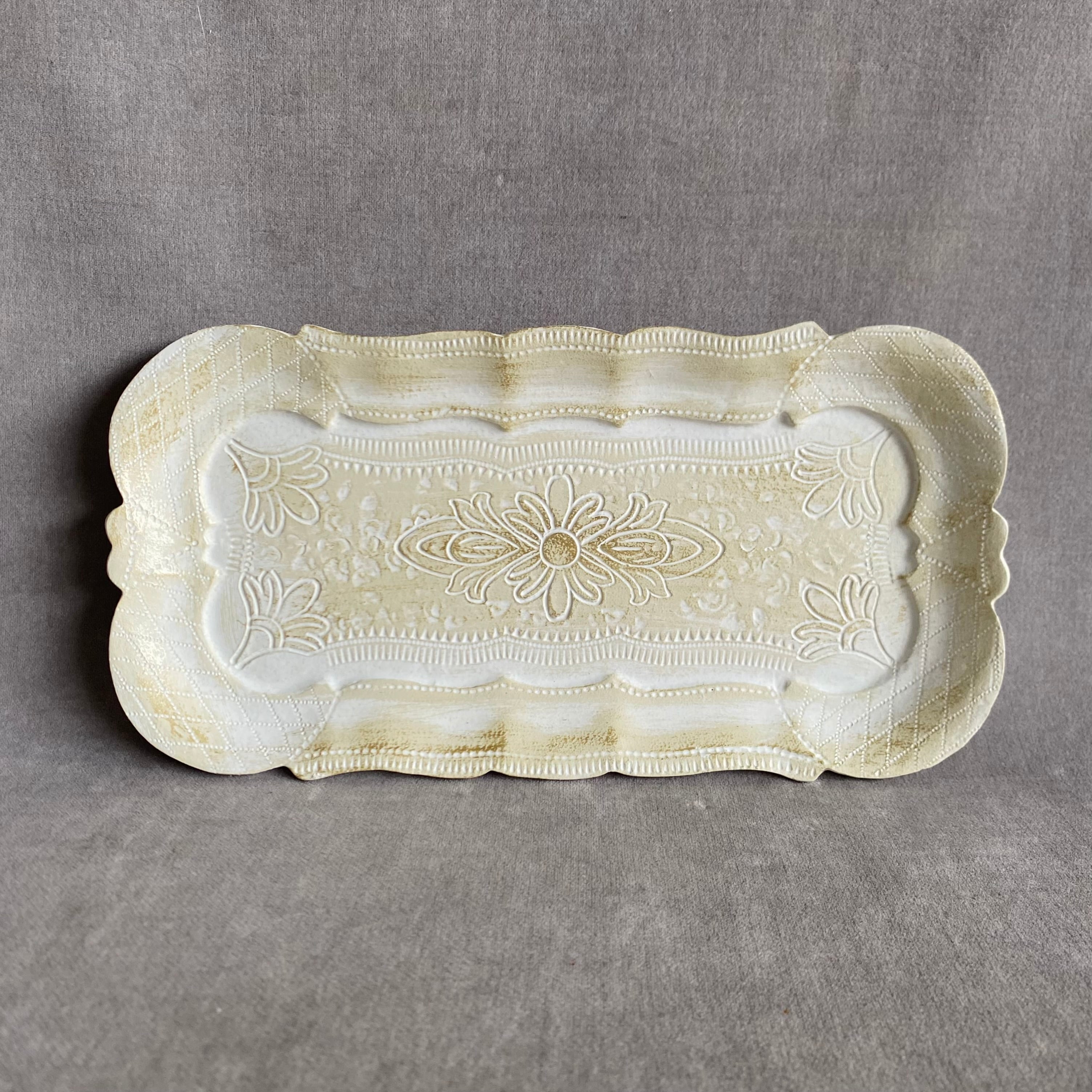 繊細なフローラル模様が施された、アンティーク調のデコラティブトレイ。