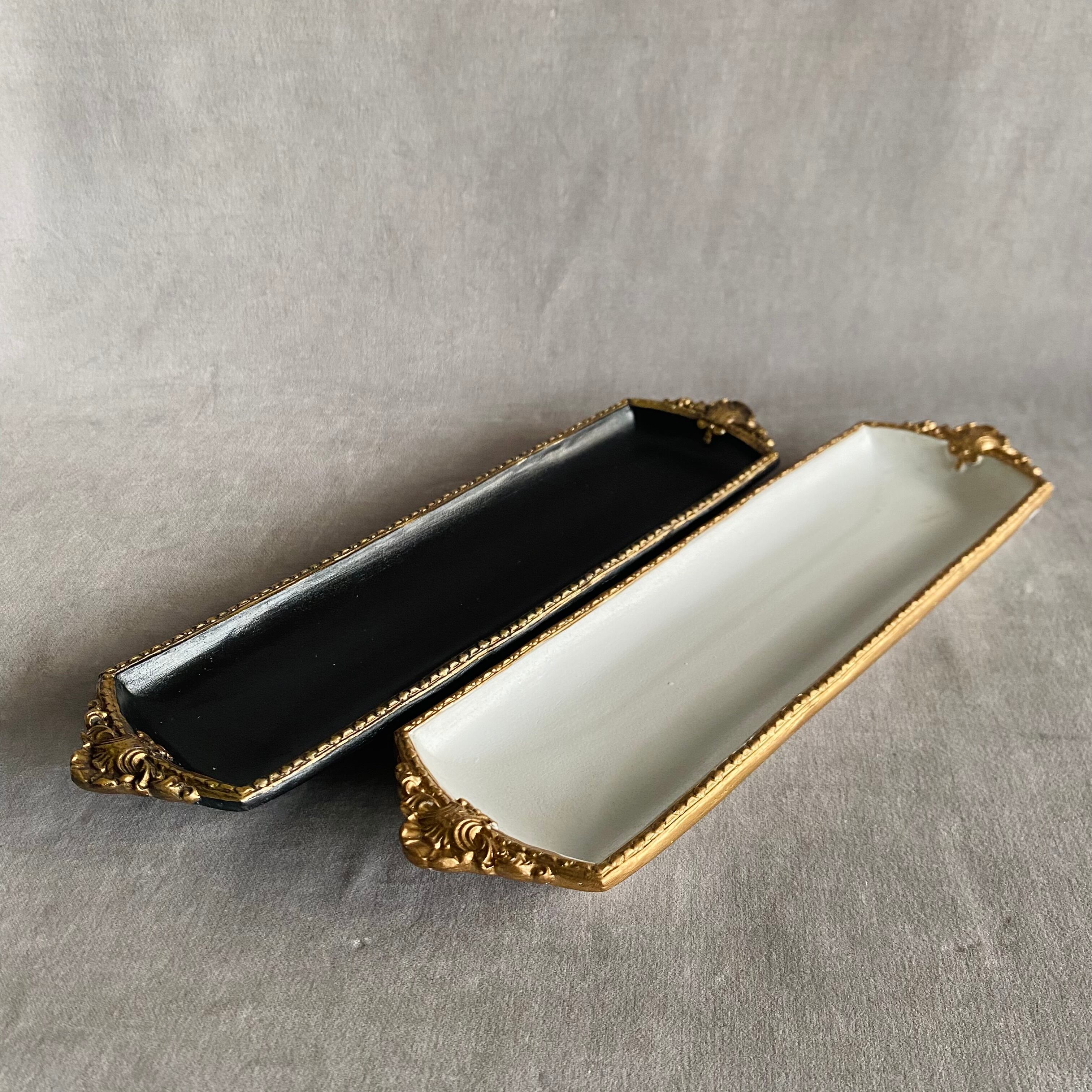 繊細な装飾が施されたクラシックデザインのロングトレイ。