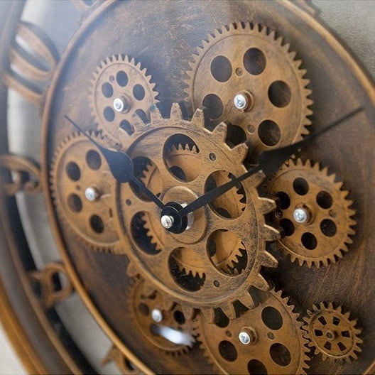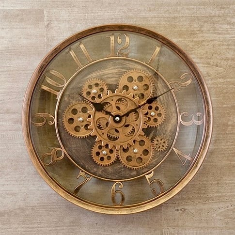大胆に露出したギアが、空間にインダストリアルな美しさを添える壁掛け時計。