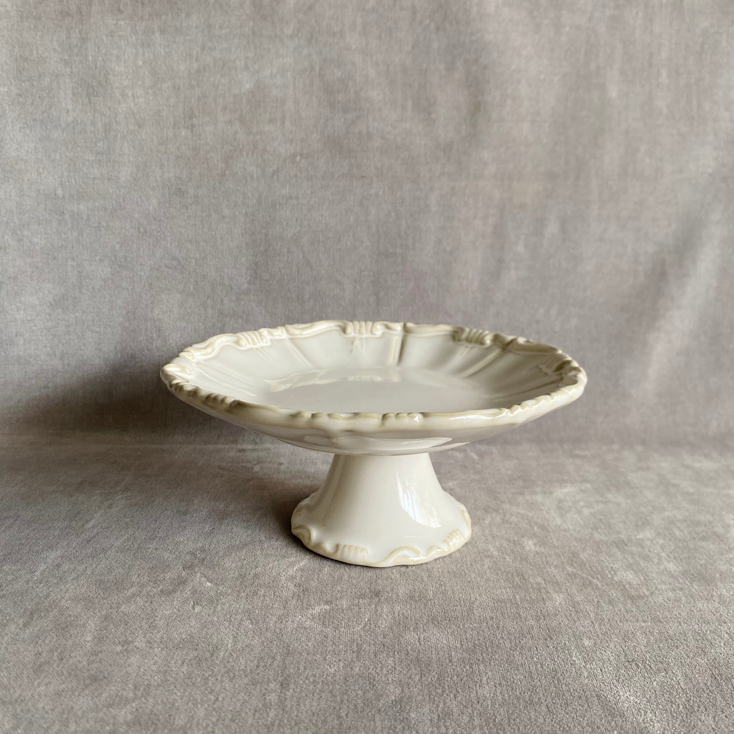 フリルプリーツを付けた可愛らしいフォルムと縁取りがおしゃれなケーキスタンド。