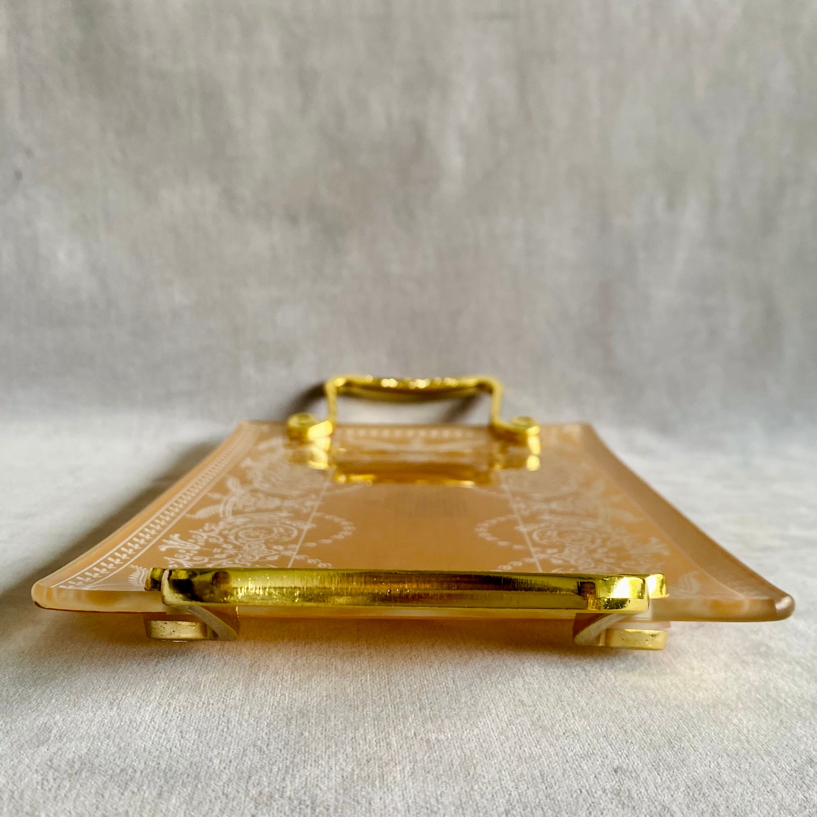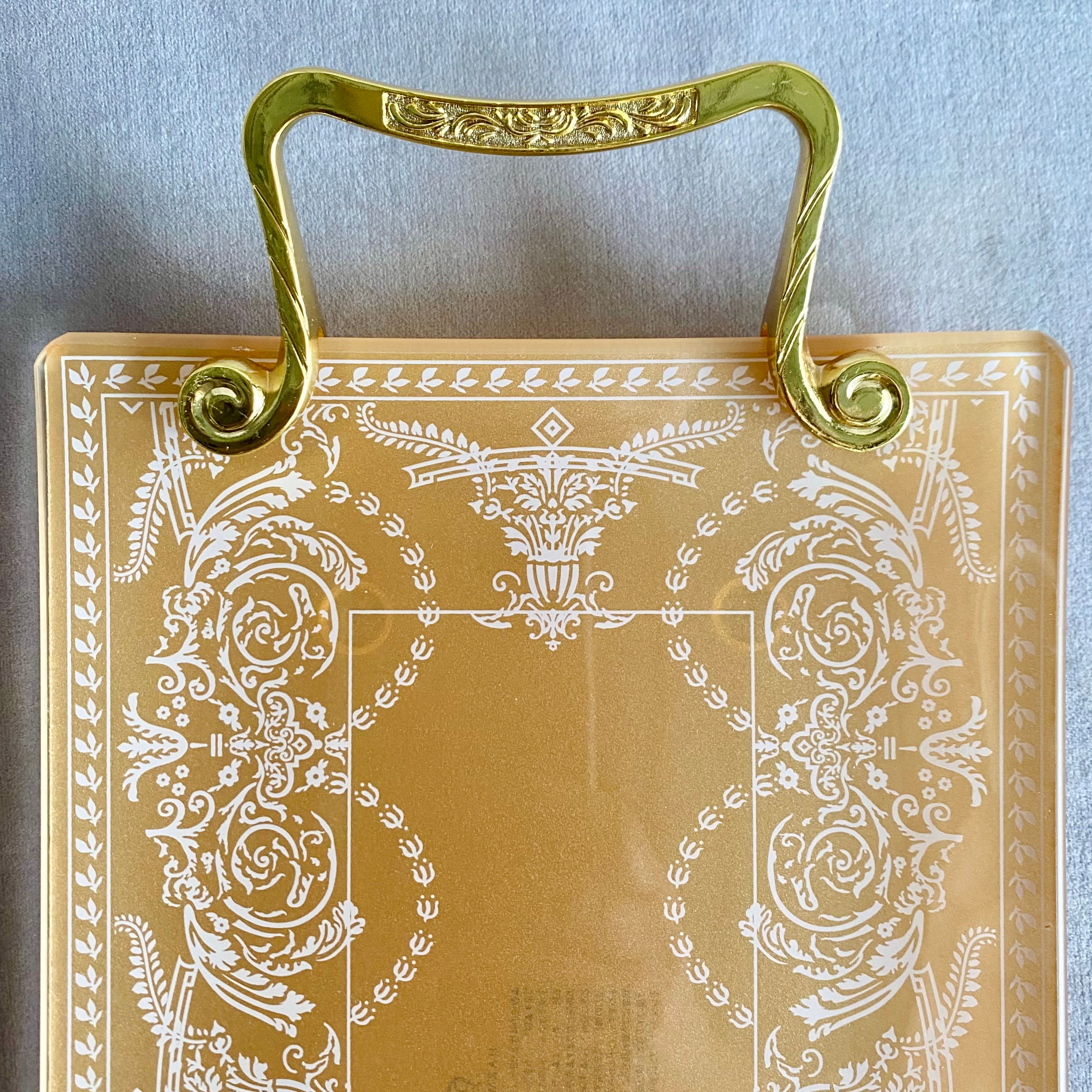 クラシカルなアラベスク模様のガラス皿に、華奢なゴールドのハンドルを合わせたおしゃれなプレート。