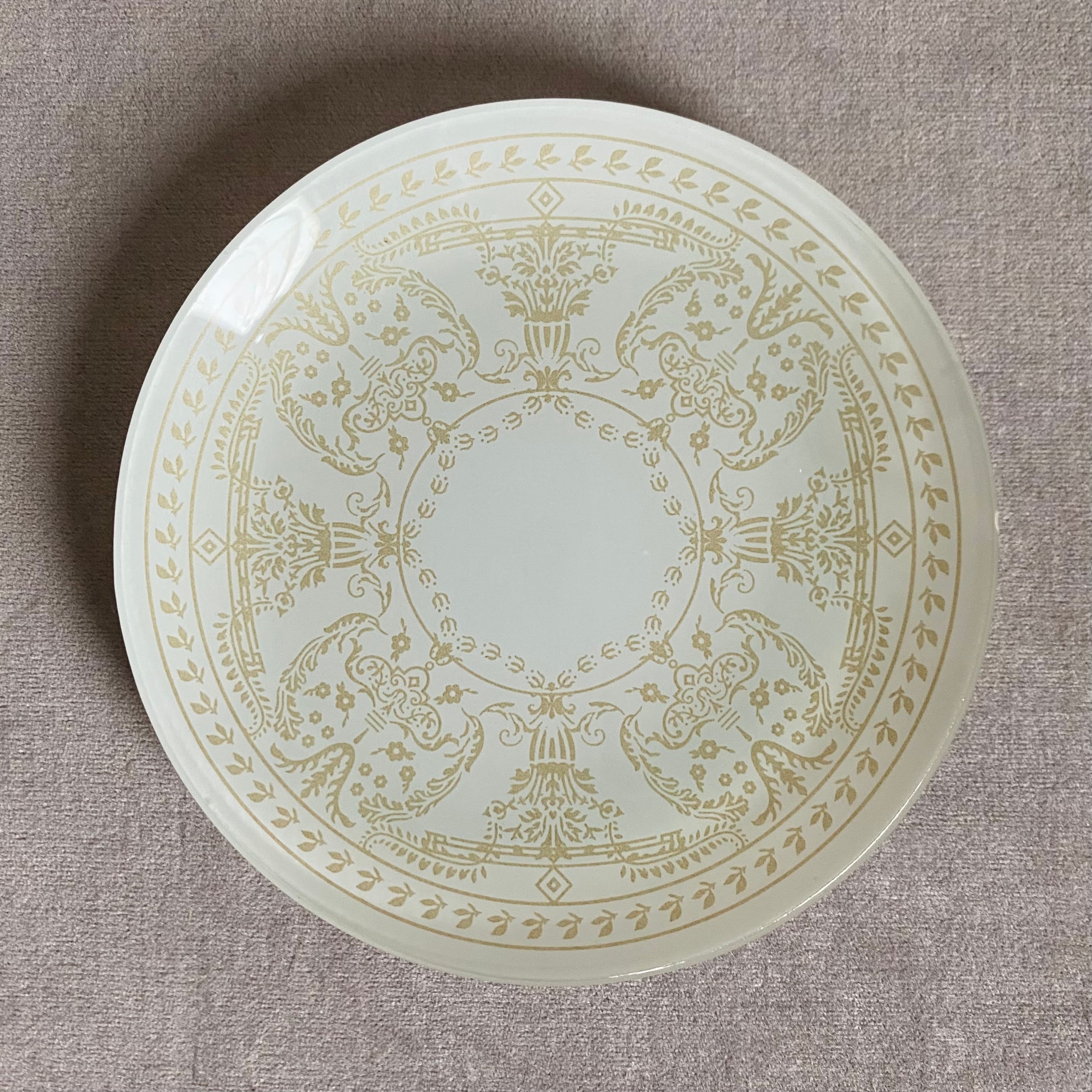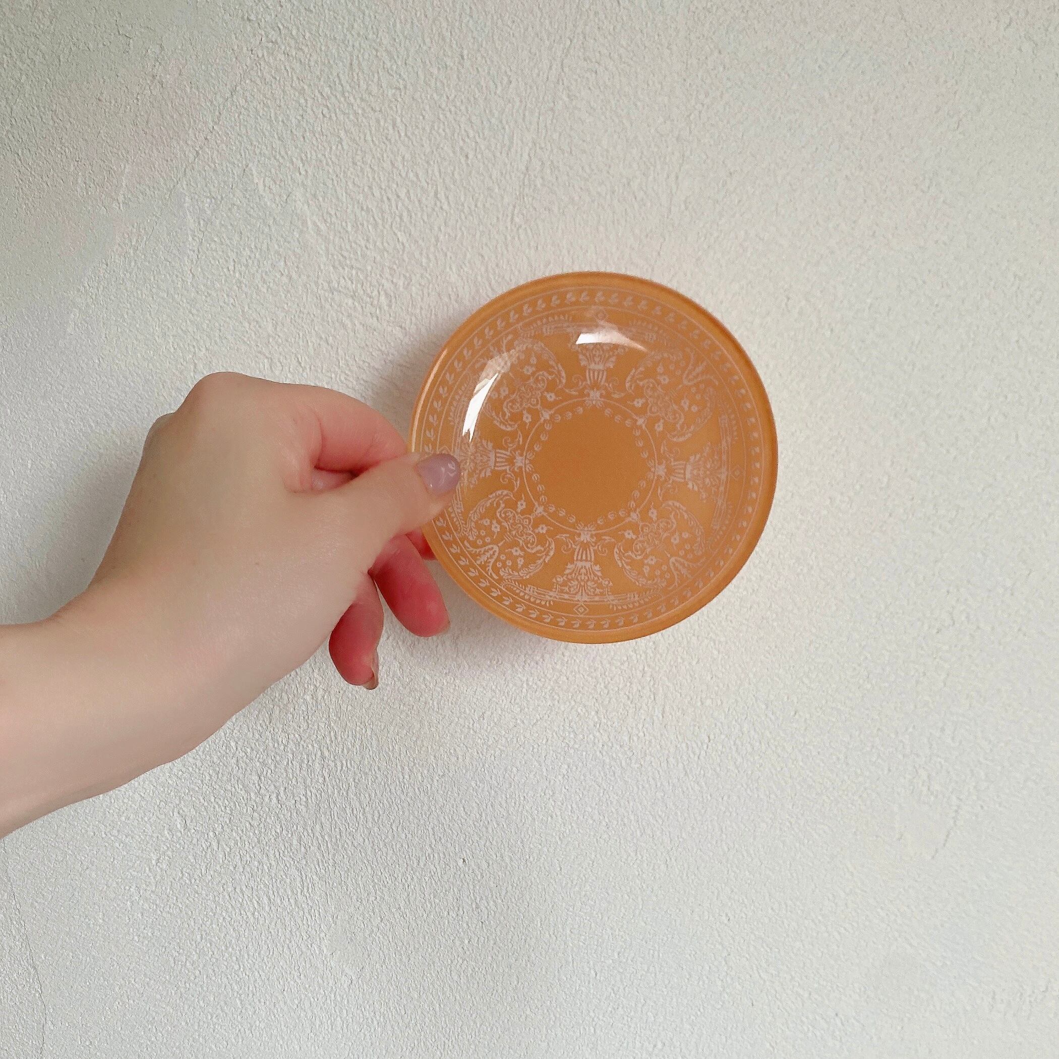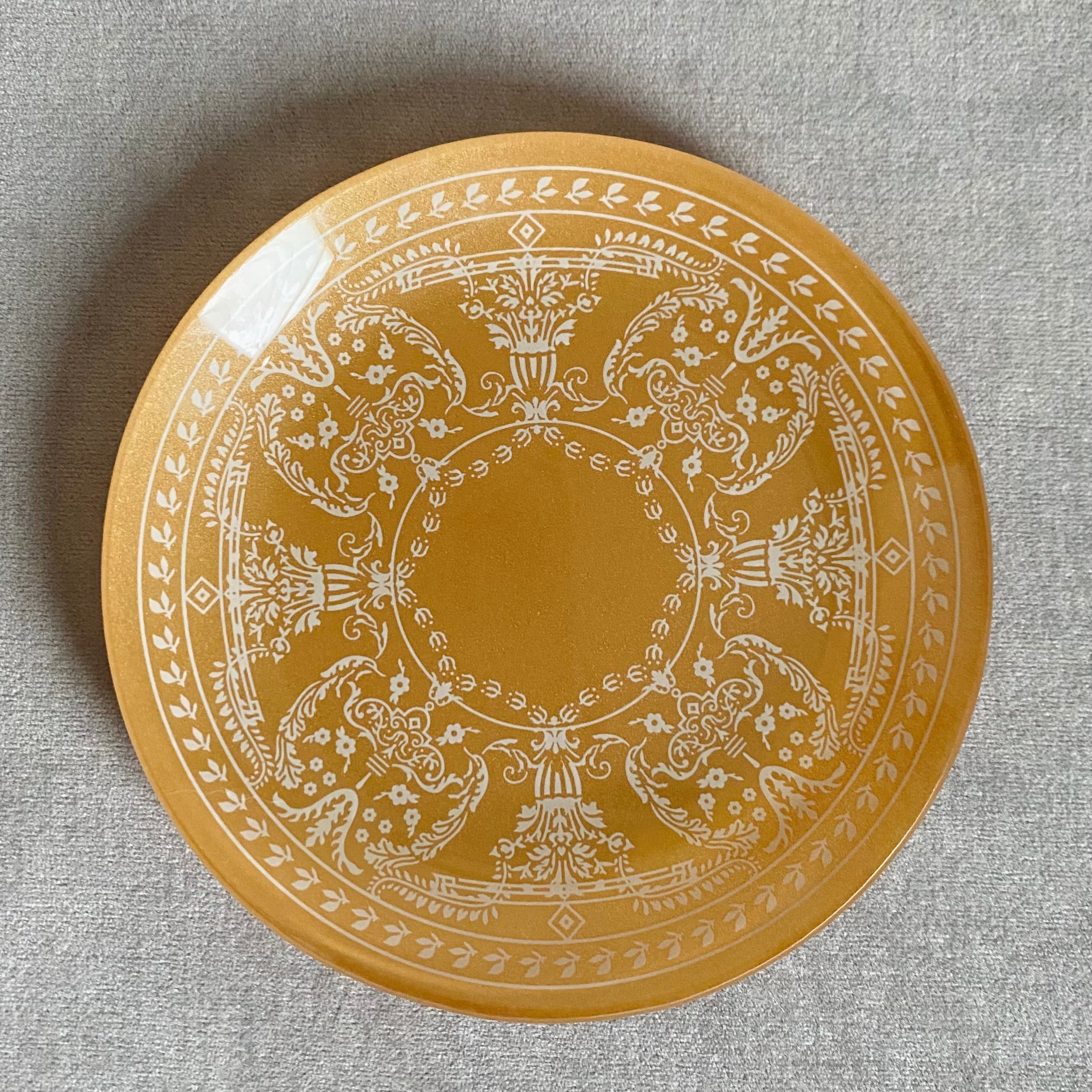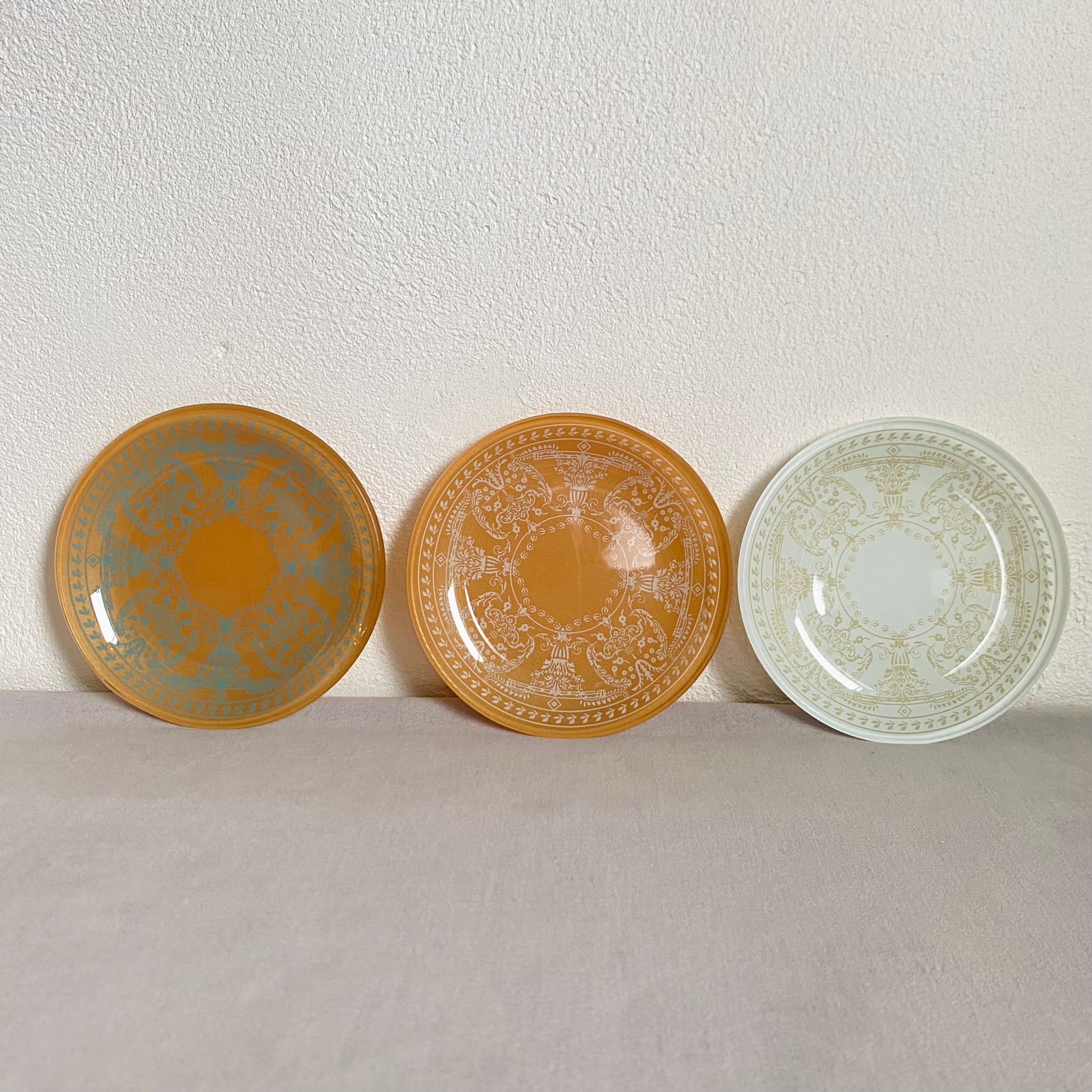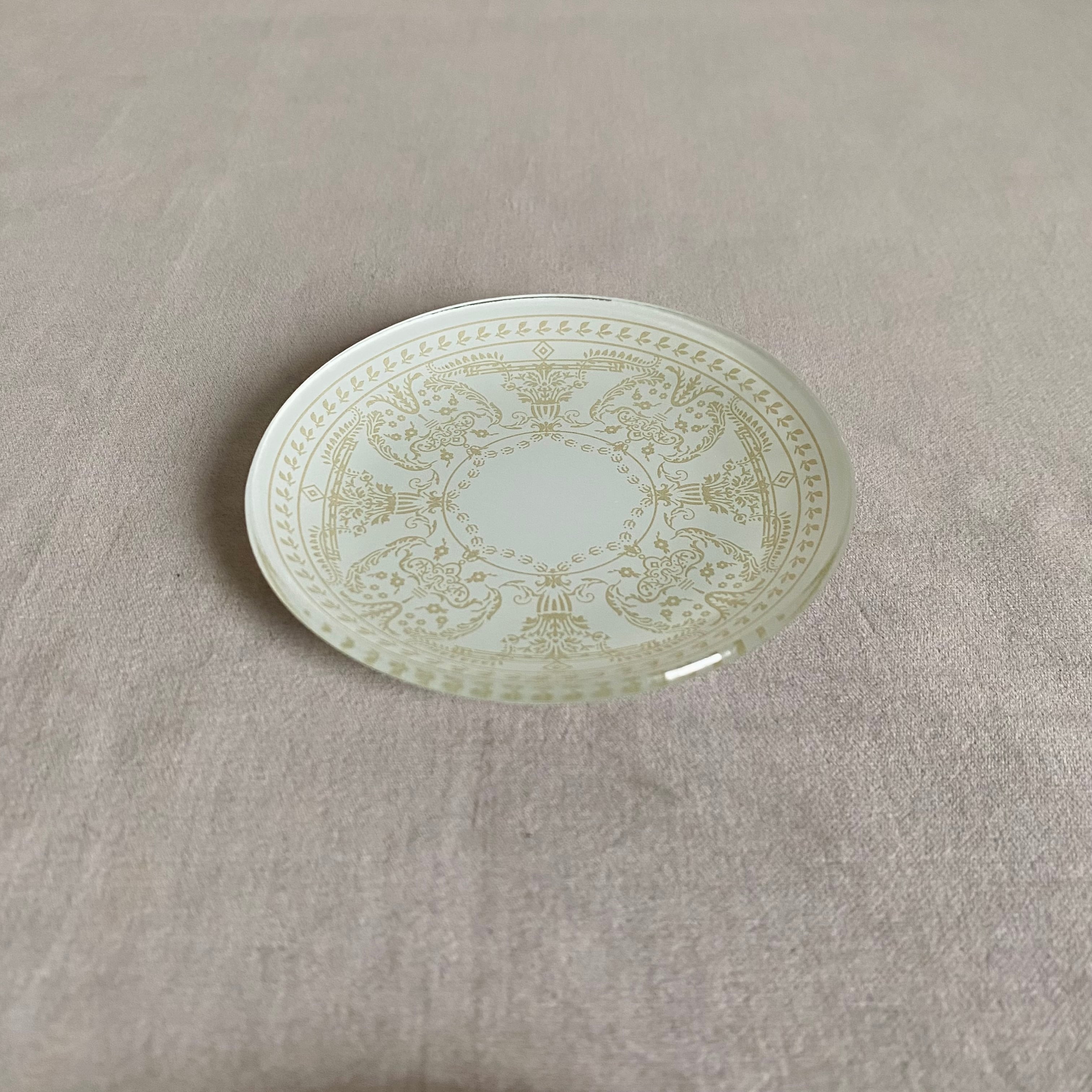 クラシカルなアラベスク模様があしらわれたおしゃれなラウンド型ミニガラスプレートは、上品でロマンチックなデザインで、食卓を華やかにしてくれます。