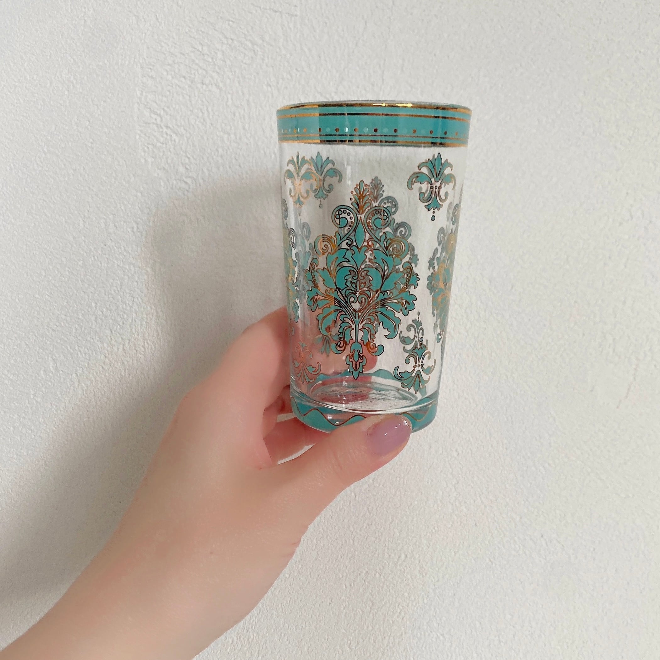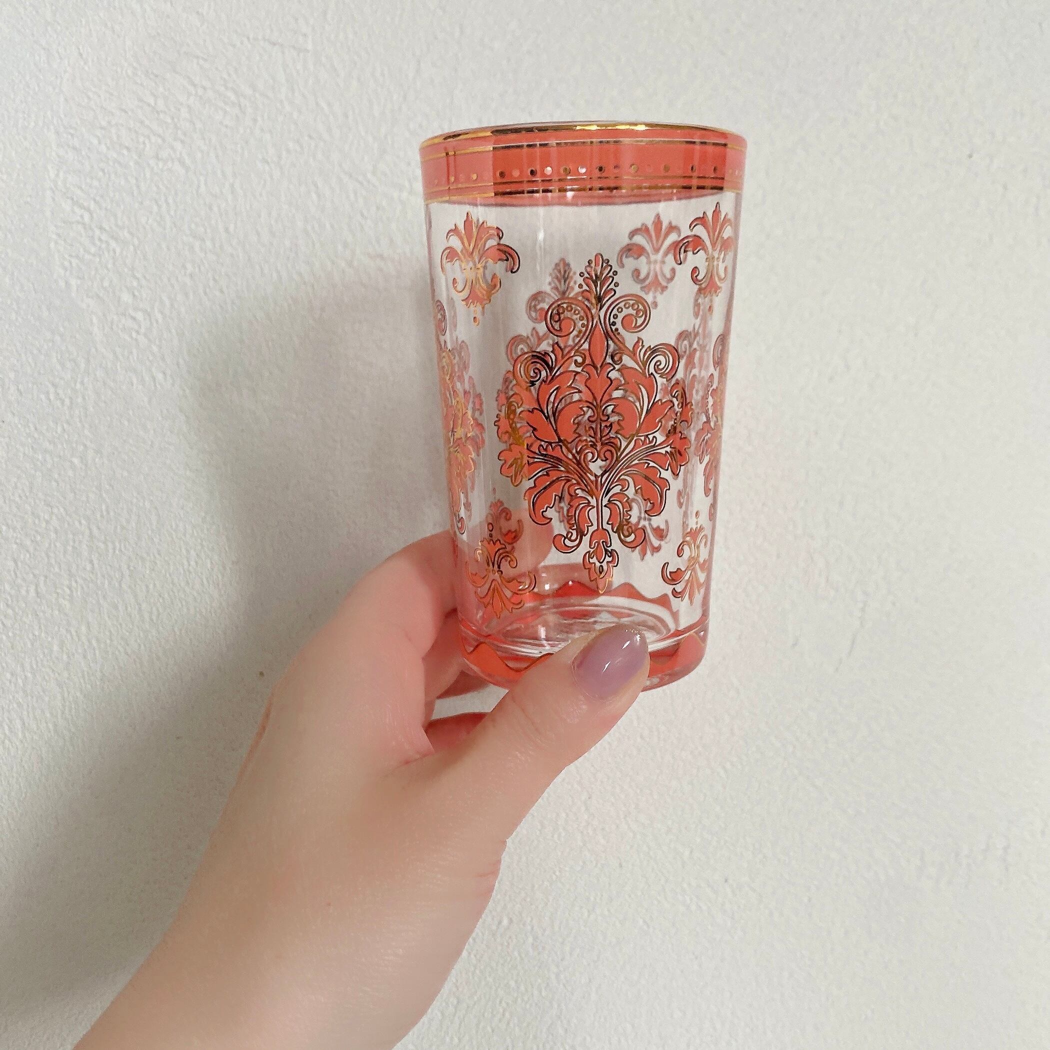 グラス2点は、ピンクとブルーのモロッコティーグラス風のかわいいデザインで、食卓を華やかでラグジュアリな雰囲気にしてくれます。