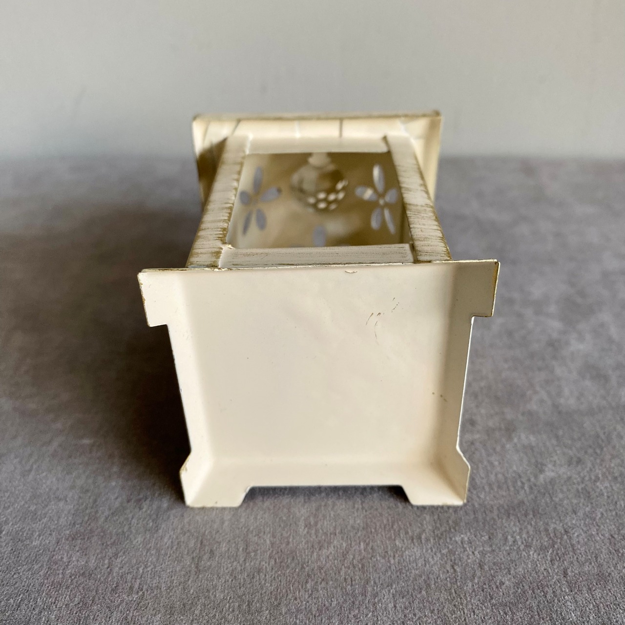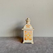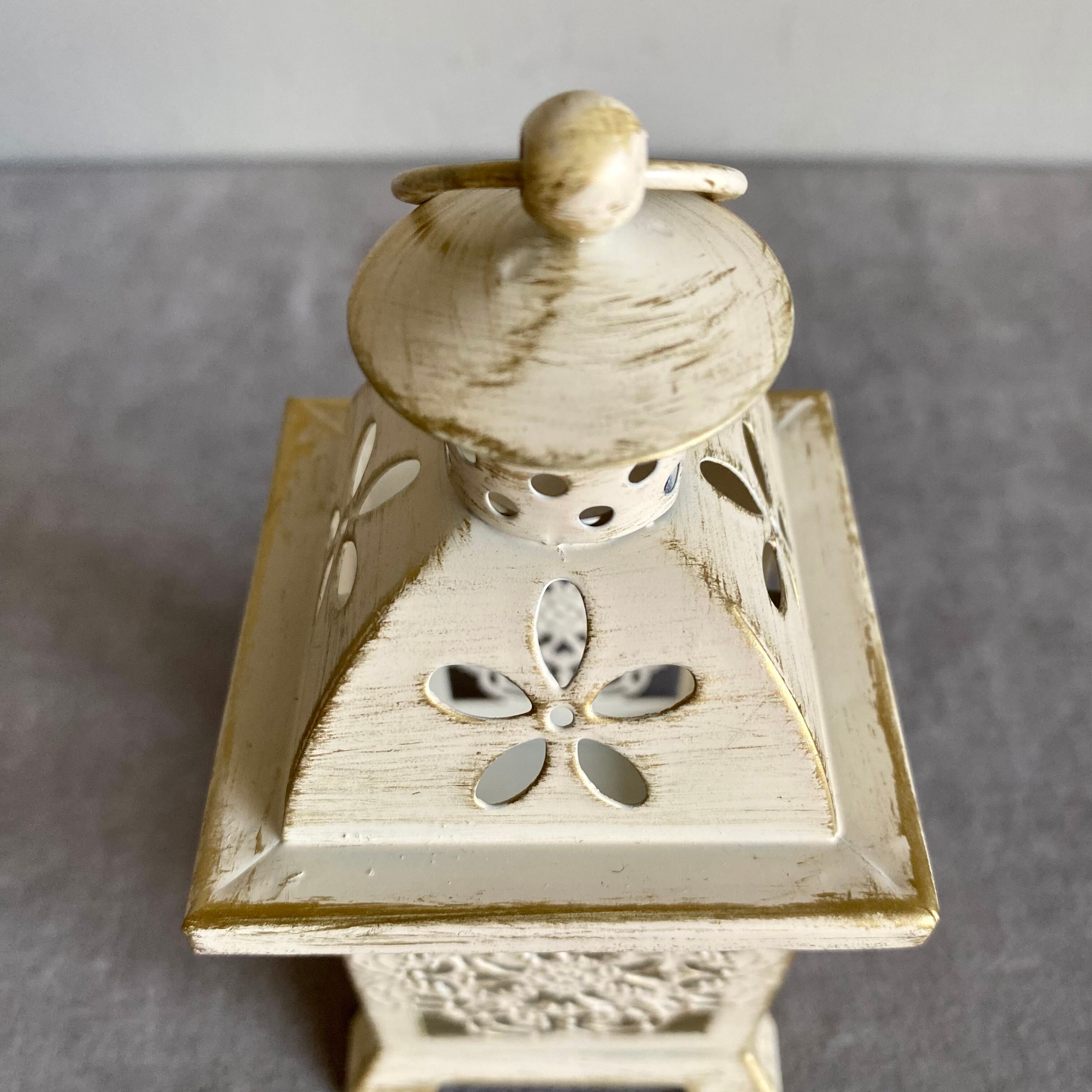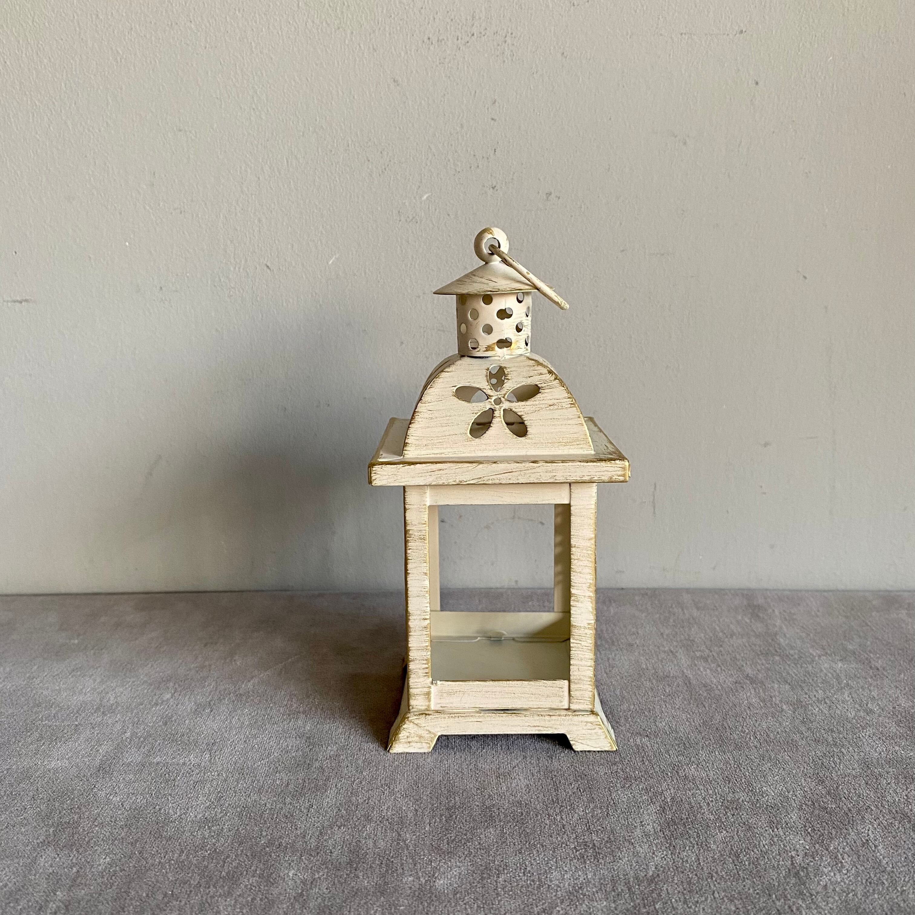 白地にゴールドブラッシュをかけたシャビーな雰囲気の、小さなランタン型フラワーベース。
