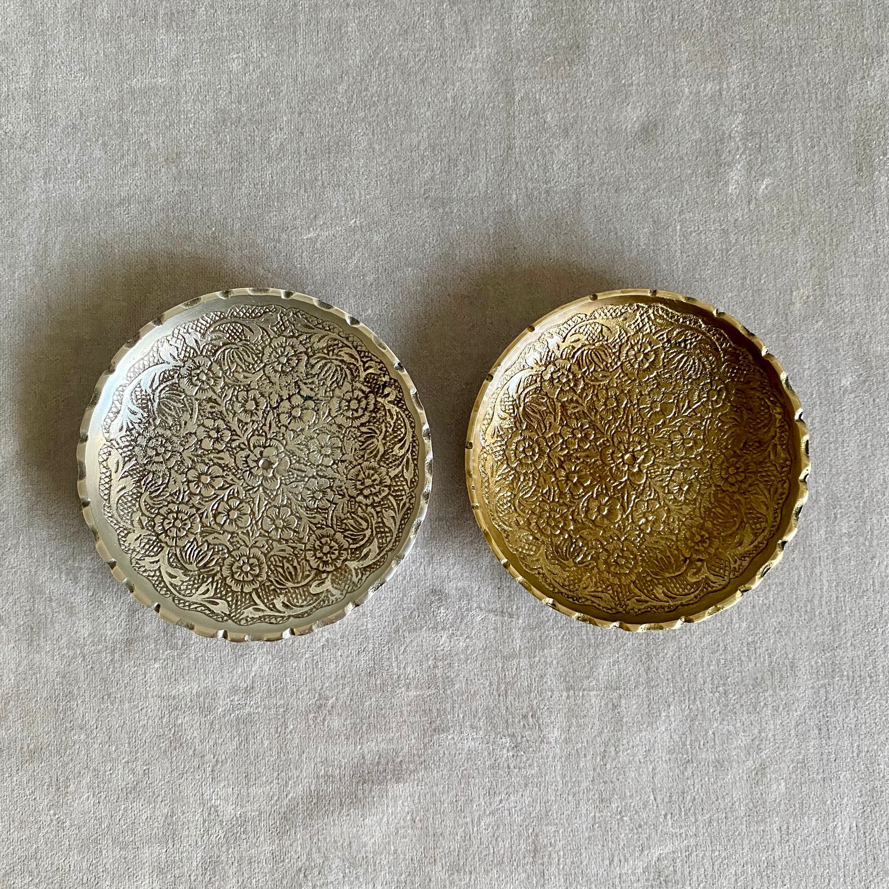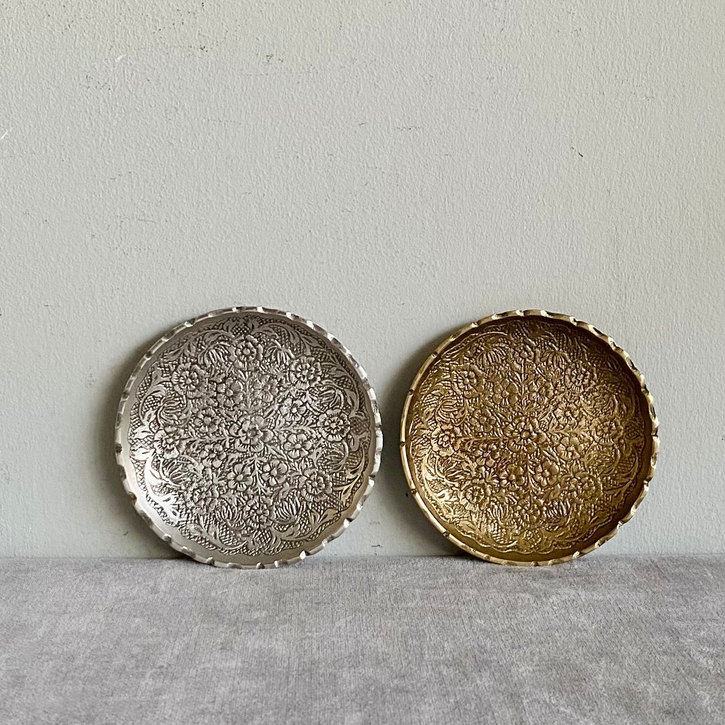 繊細な型押し模様が美しいインドの小さめ真鍮トレイ。