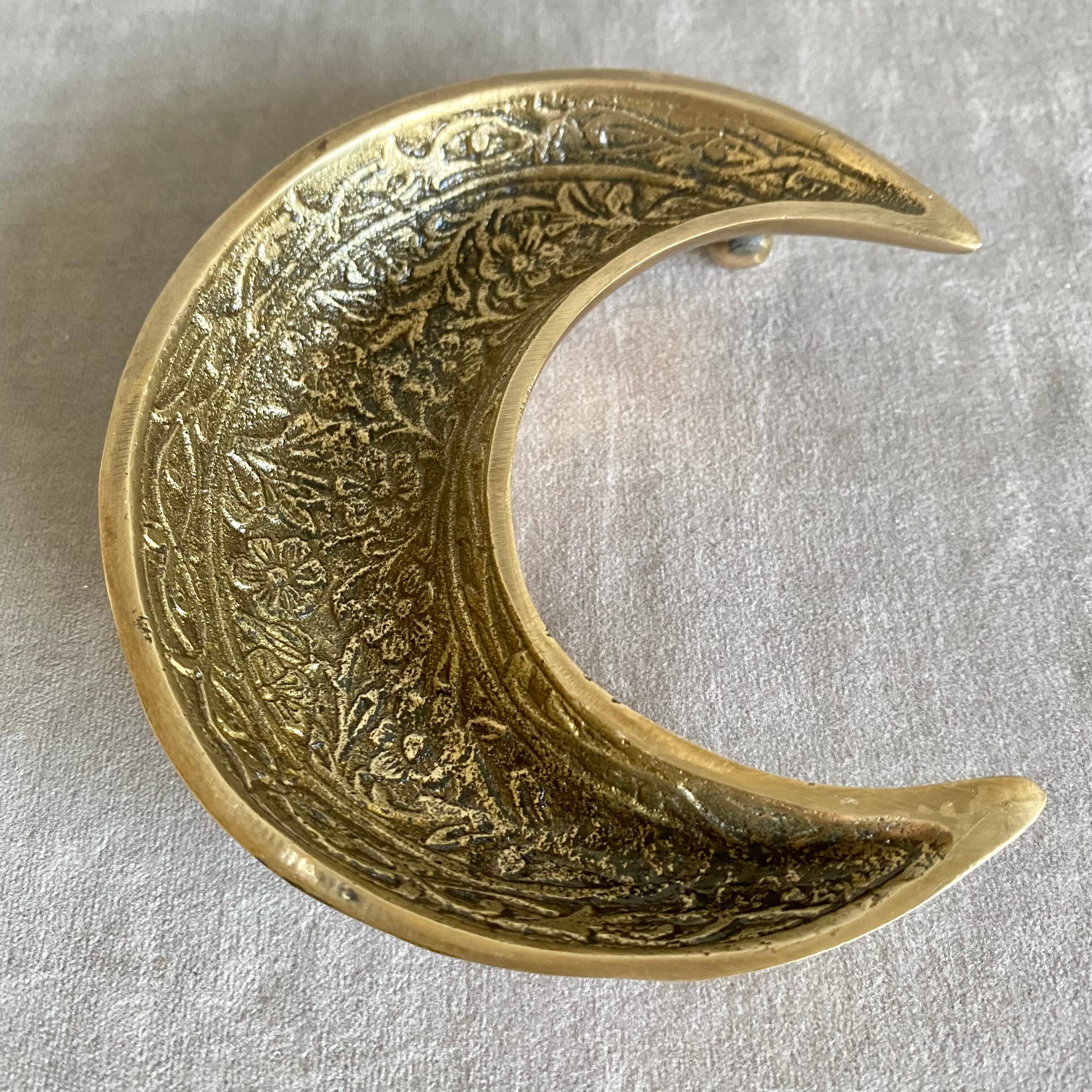 繊細な型押し模様が美しいインドの小さめ月型真鍮トレイ。