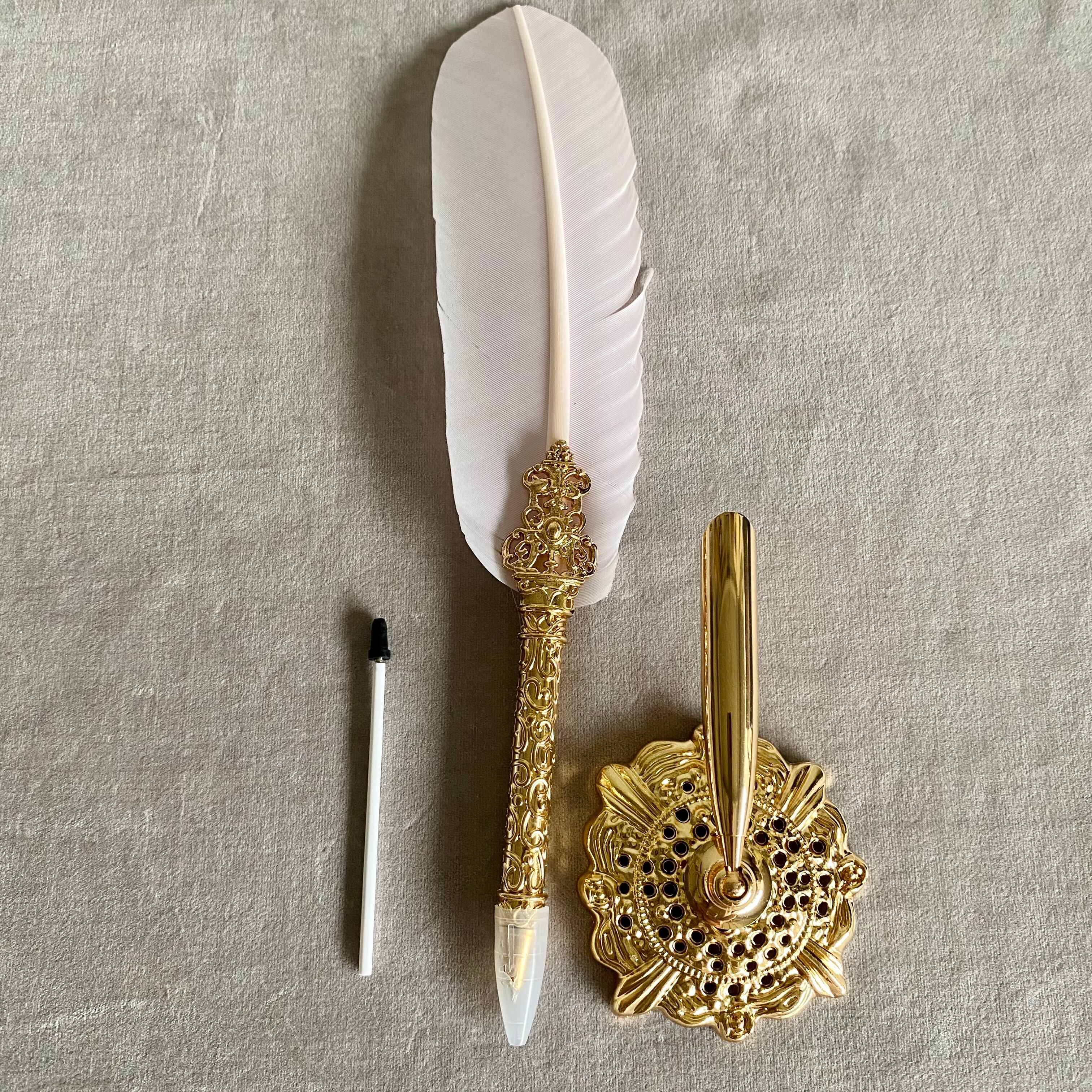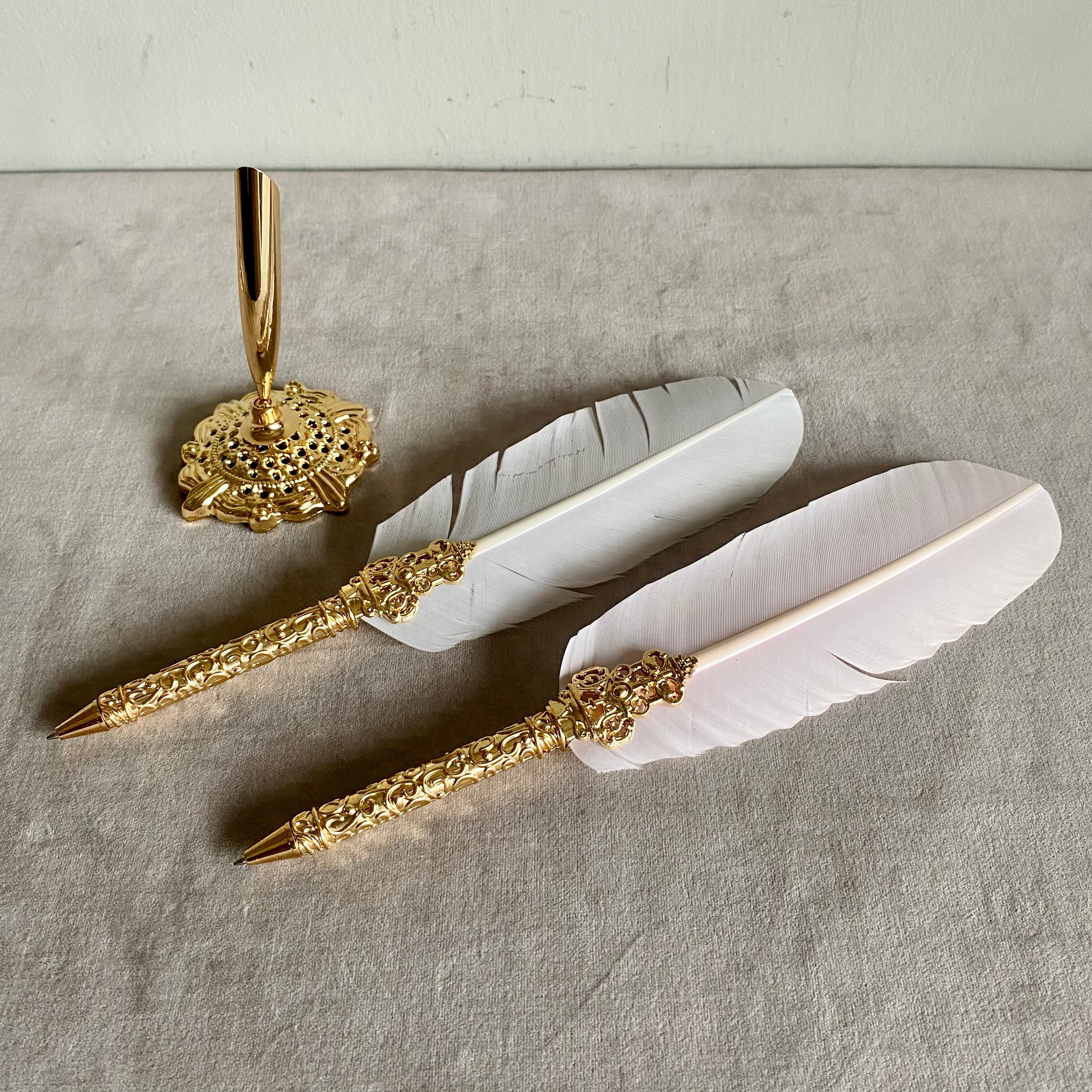 クラシカルなデザインのピンクゴールドのペン先を合わせた高級感のある羽根ペンです。